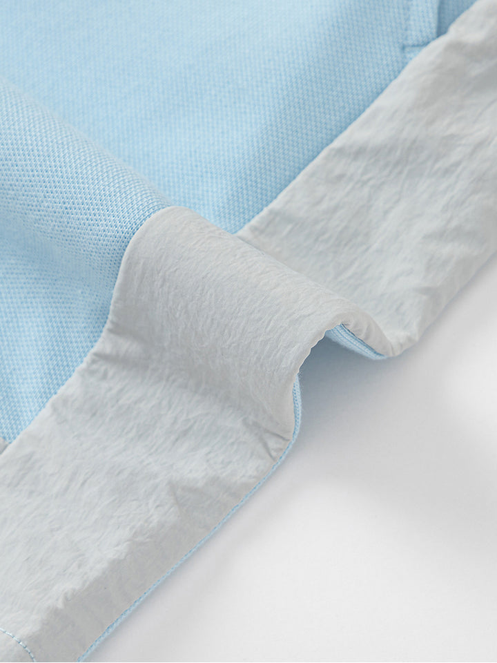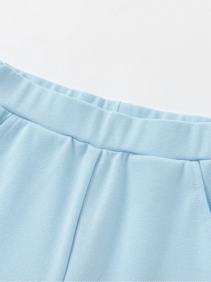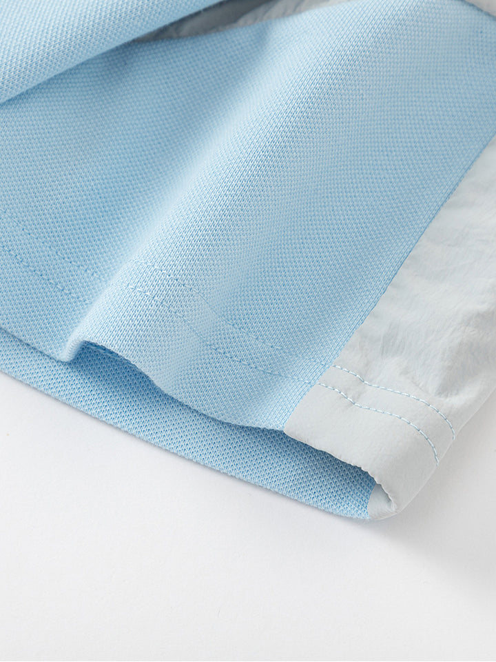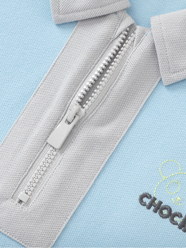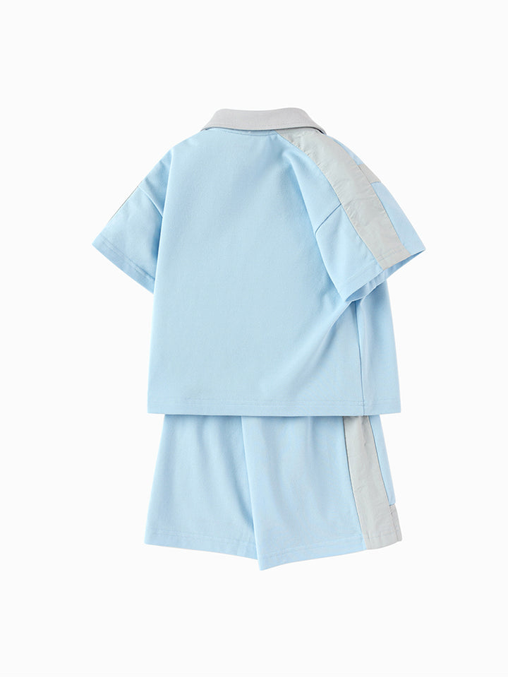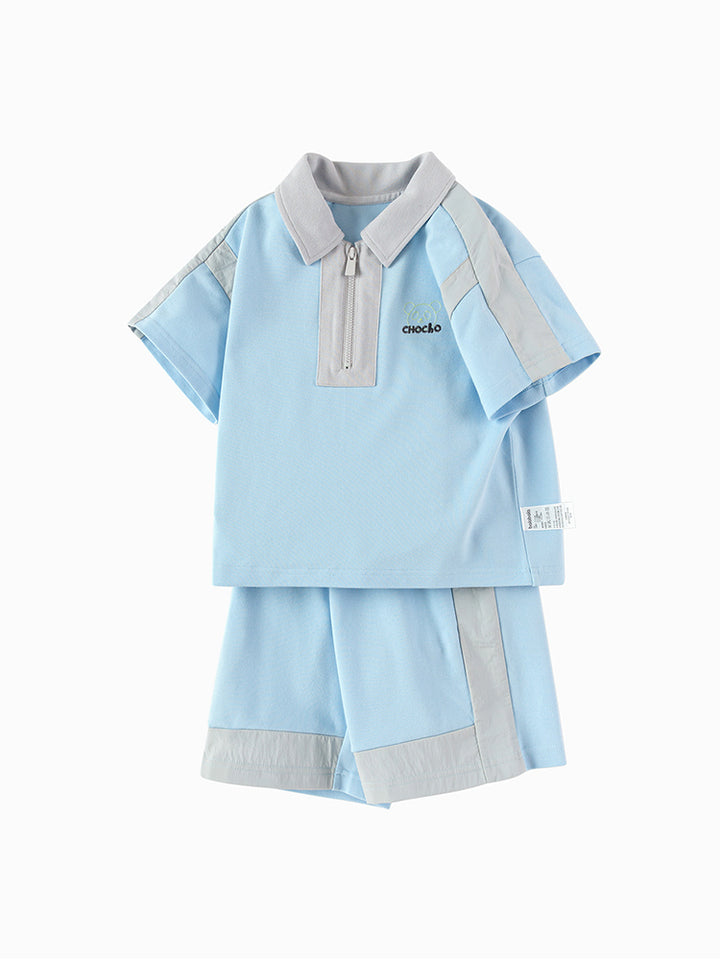 boys set of two pieces, a short sleeves polo t-shirt, decorated with a contrast colored lining details on sleeves, comes with a zipper for closure on the front side and with a classic regular collar, and a casual shorts, decorated with contrast colored lining details on legs, comes with pockets on the front side and with a comfy elasticated waistband