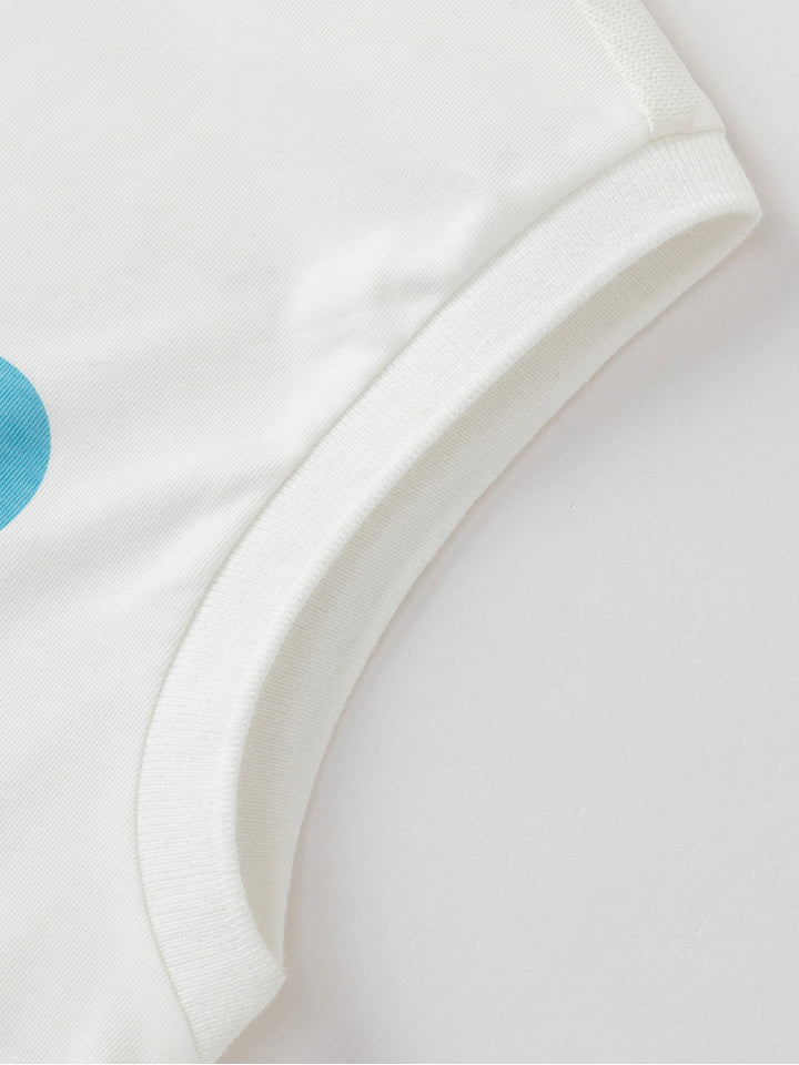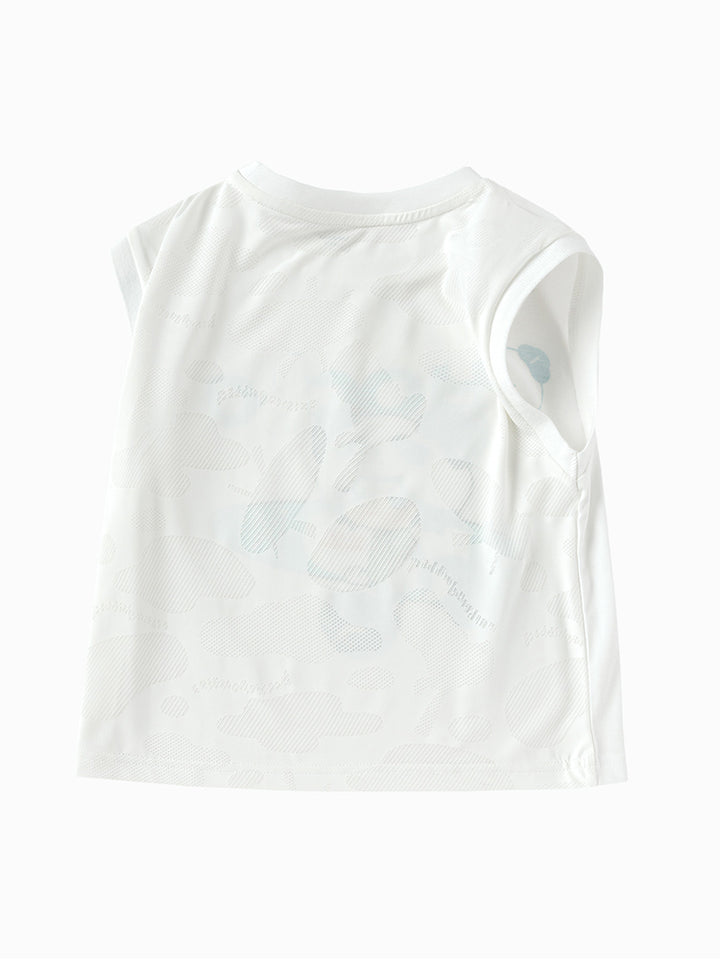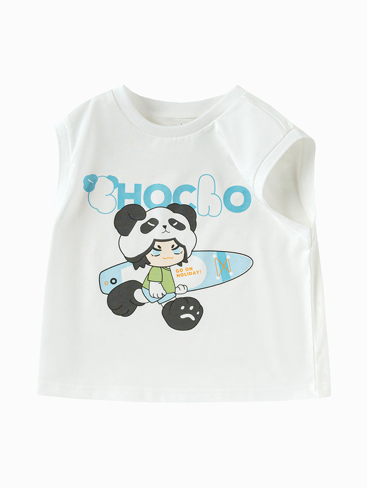 sleeveless casual boys t-shirt, decorated with a print on the front side, comes with a rounded shape neckline
