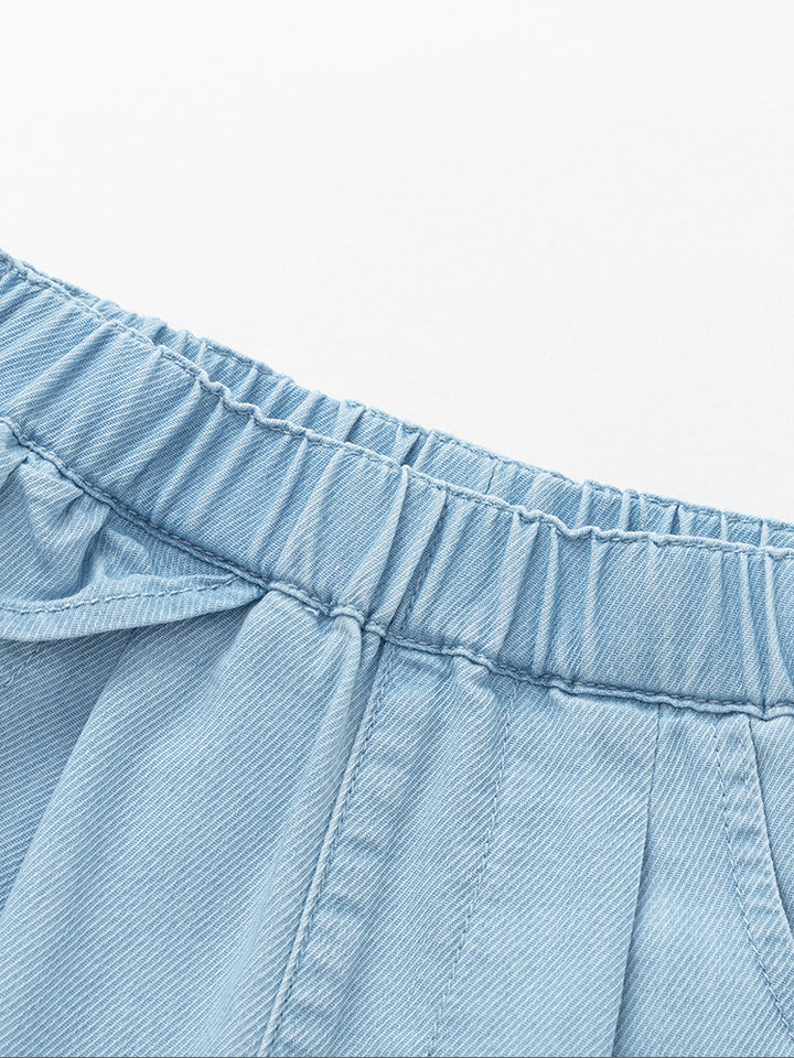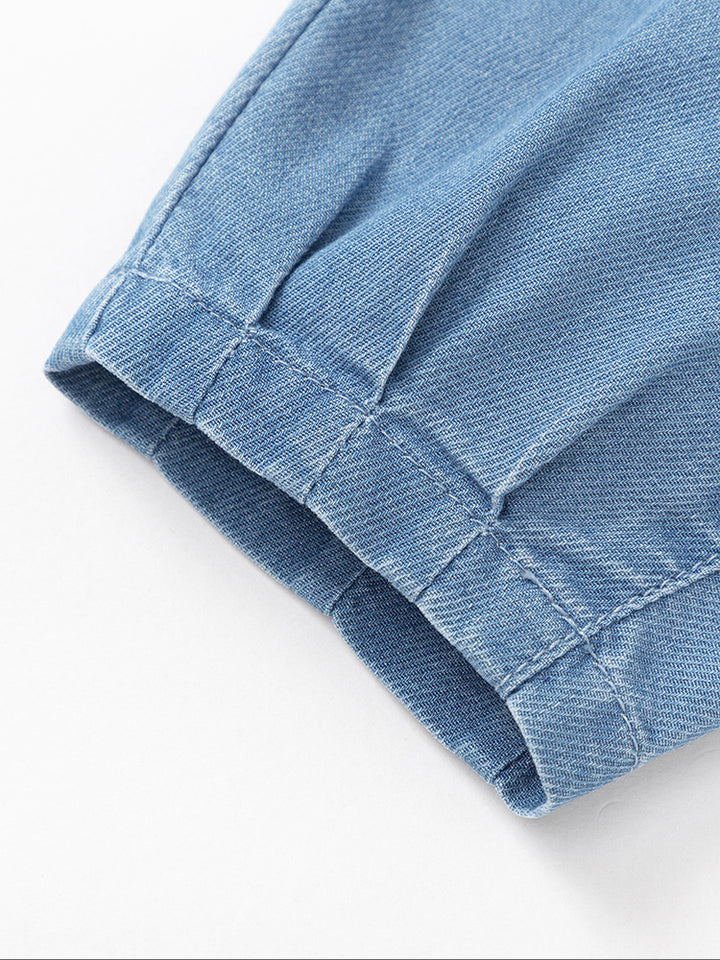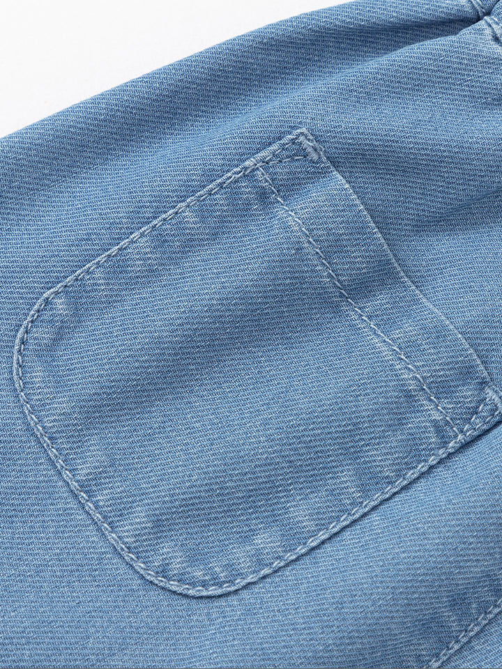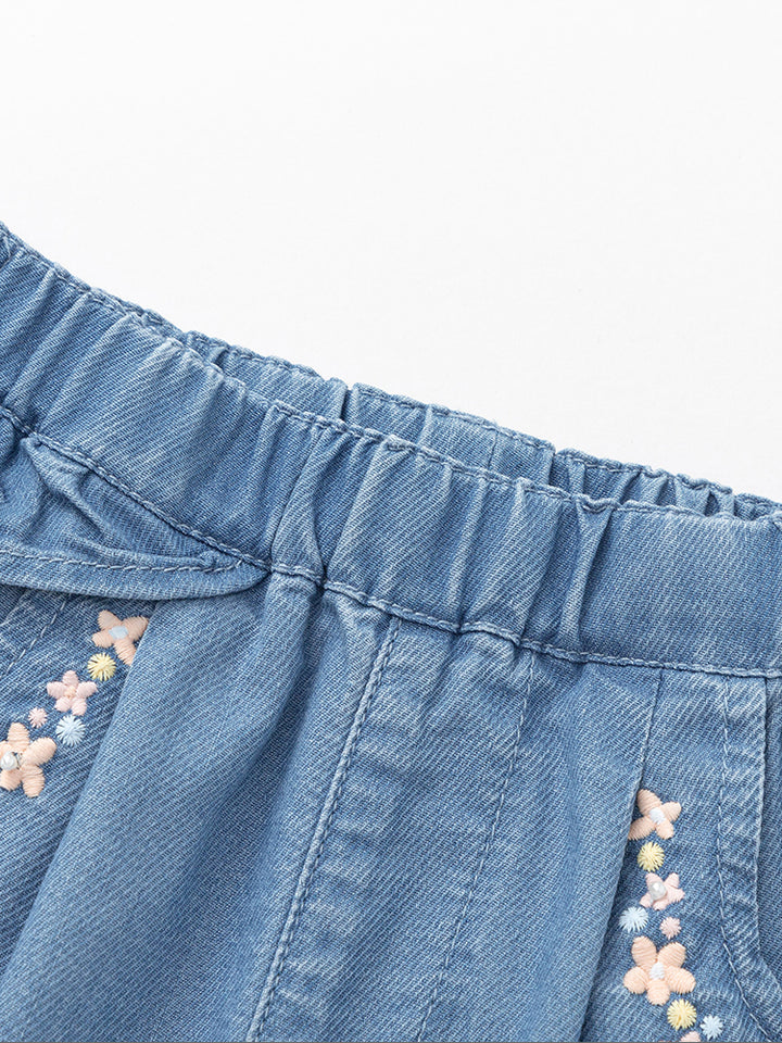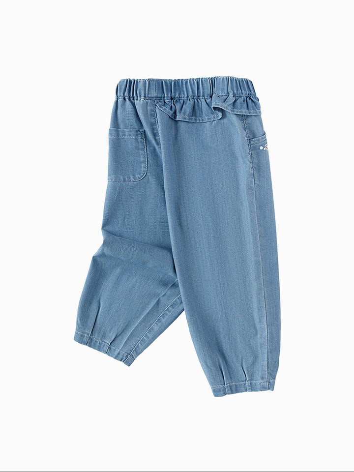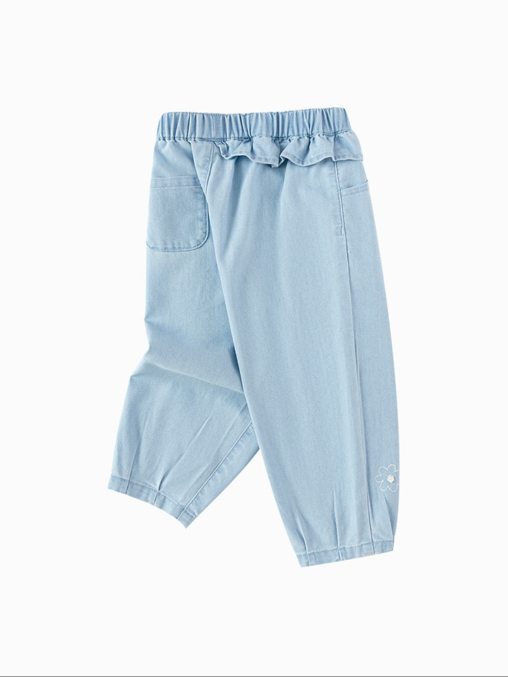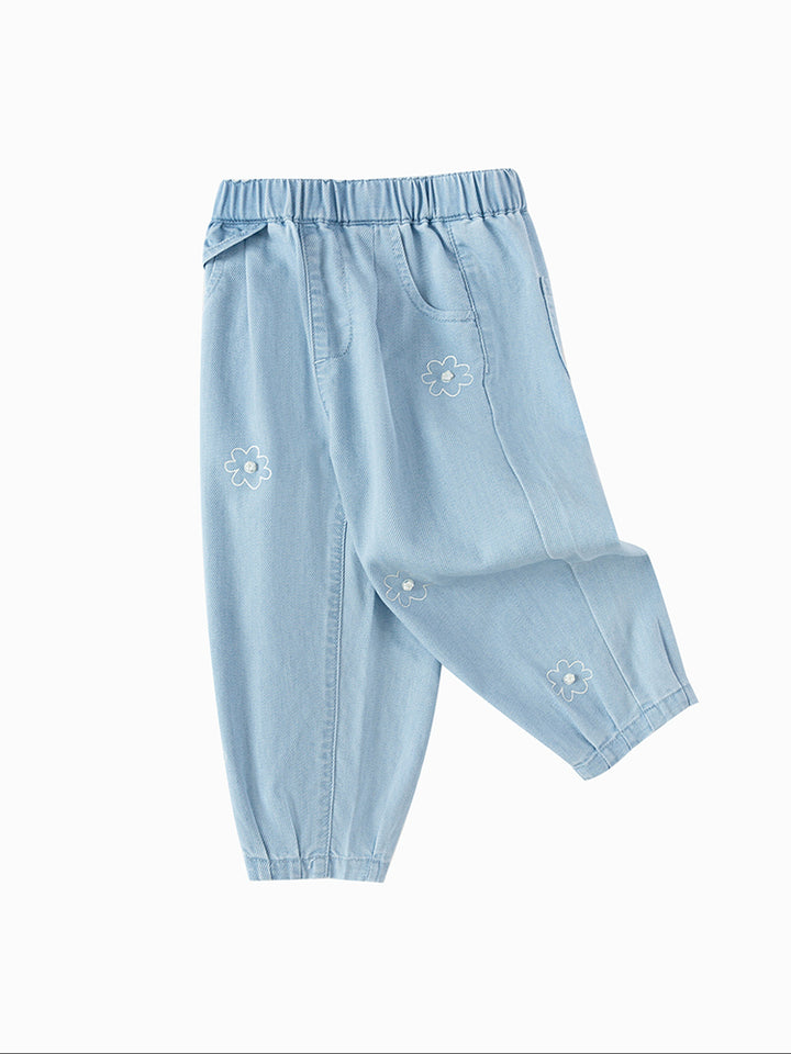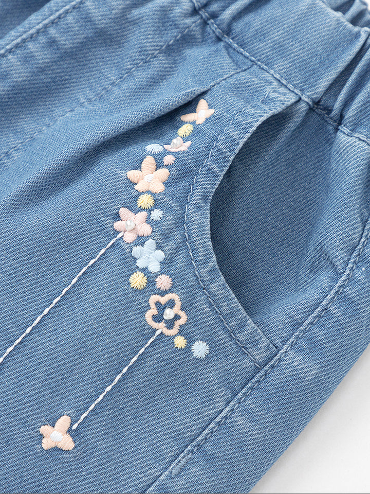 These stylish toddler denim pants feature tiny embroidery details, front and back pockets, and an elastic waistband for a comfortable fit. Perfect for everyday wear, they combine both style and practicality for your little one
