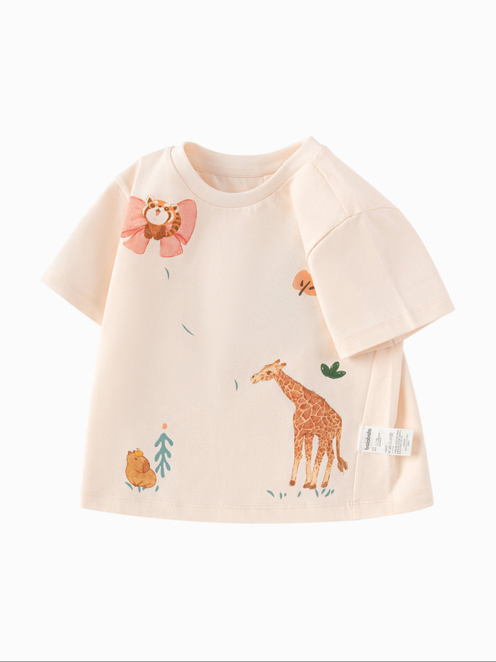 This fun toddler t-shirt features a playful front print and a round neck design. With short sleeves, its perfect for keeping your little one stylish and comfortable all day long