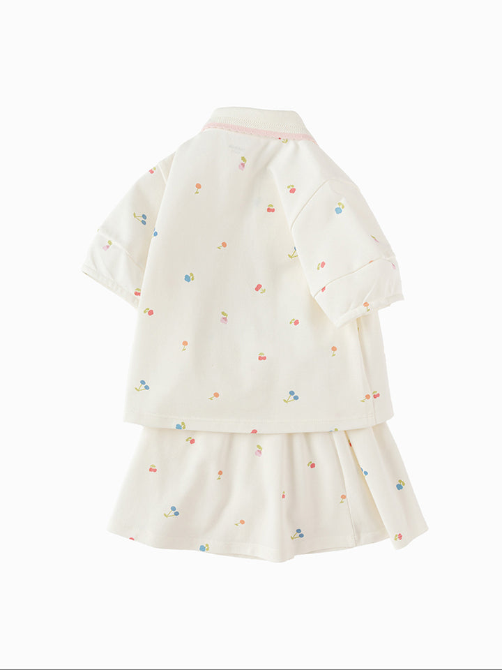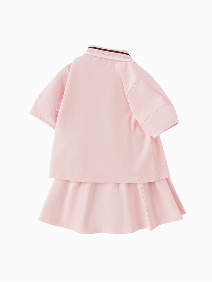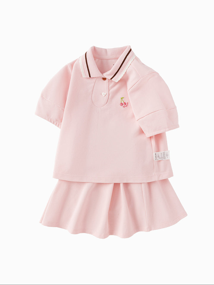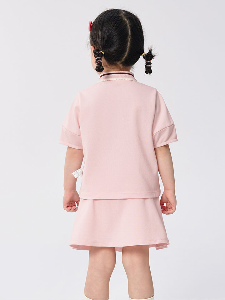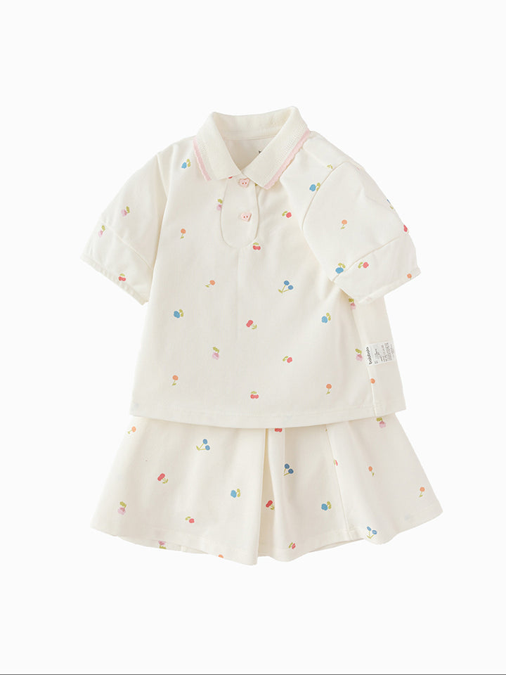 This adorable two-piece set features a short sleeves top with tiny embroidery, front button closure, and a classic collar. Paired with a solid color skirt with an elastic waist for a comfortable and stylish look