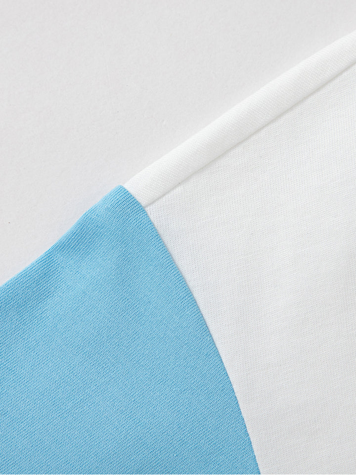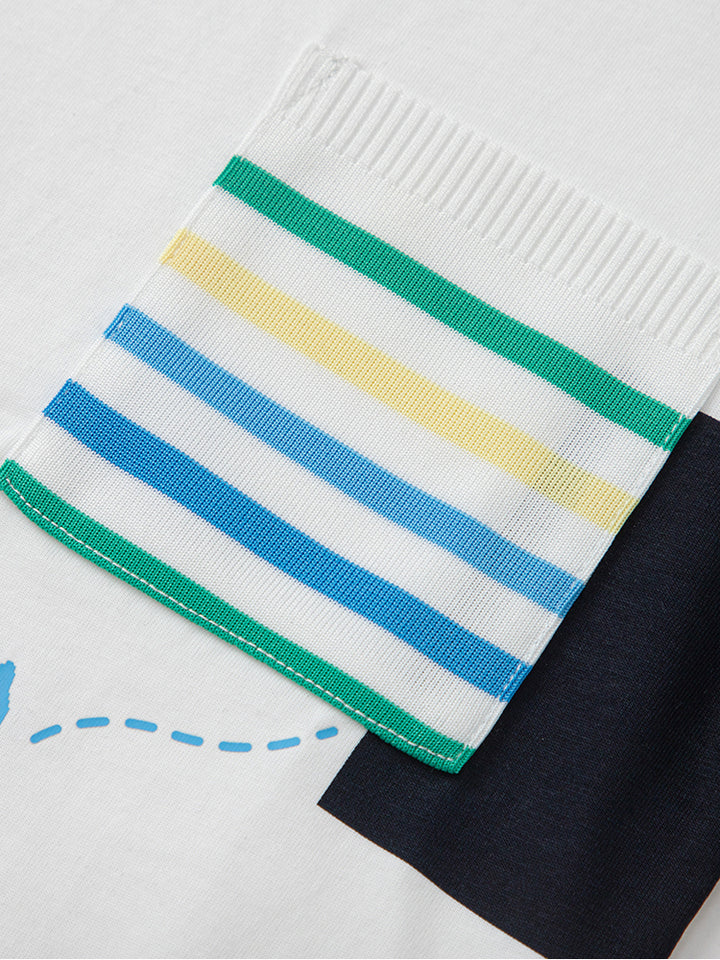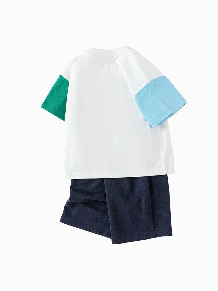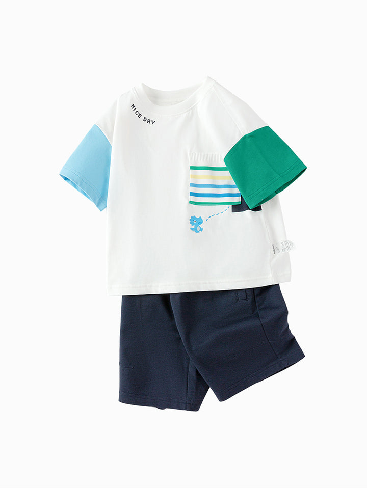 boys set of two pieces, a short sleeves t-shirt decorated with colored details, comes with front pocket and a rounded shape neckline, and a shorts in a solid mono colored pattern, comes with front pockets, comfy elasticated waistband and an adjustable drawstring on waistline