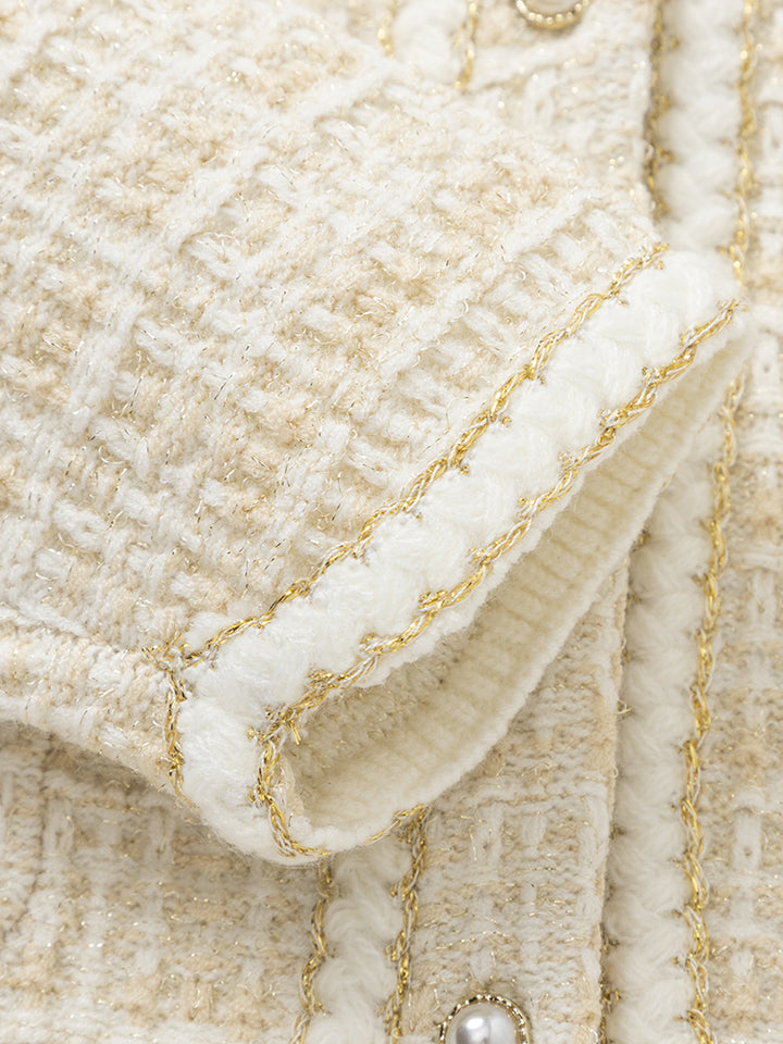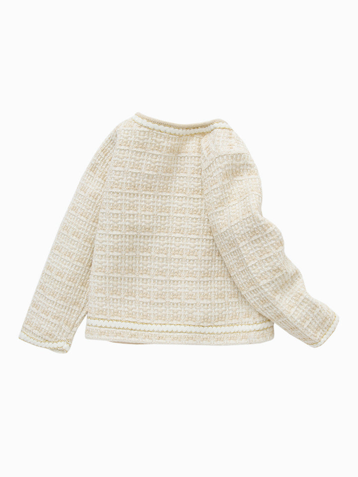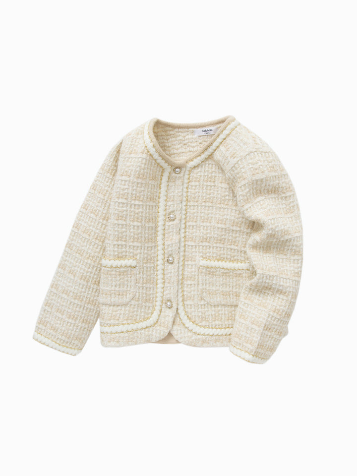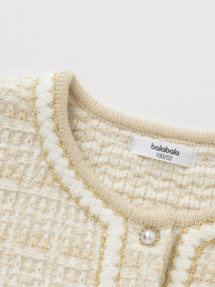 long sleeves girl cardigan jacket, decorated with a tuede knitted fabric, comes with front pockets, buttons for closure on the front side and a rounded shape neckline