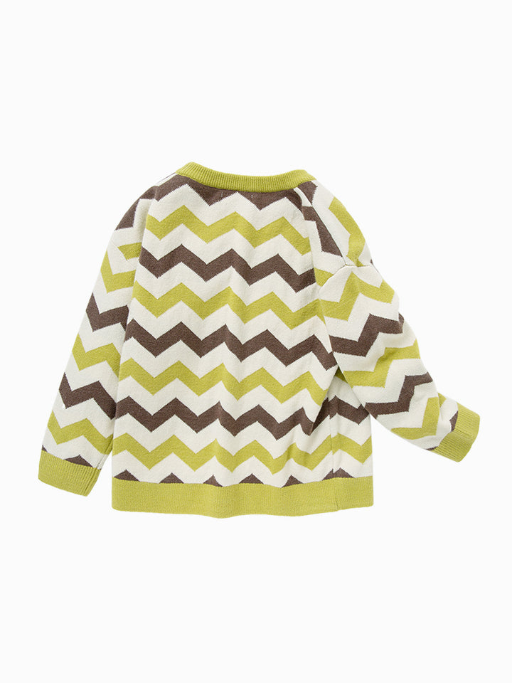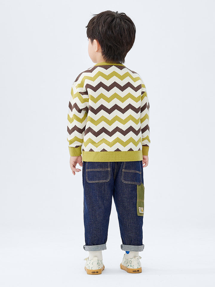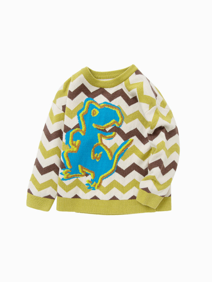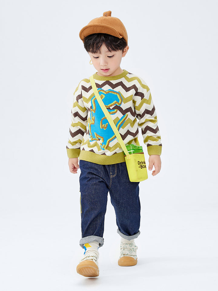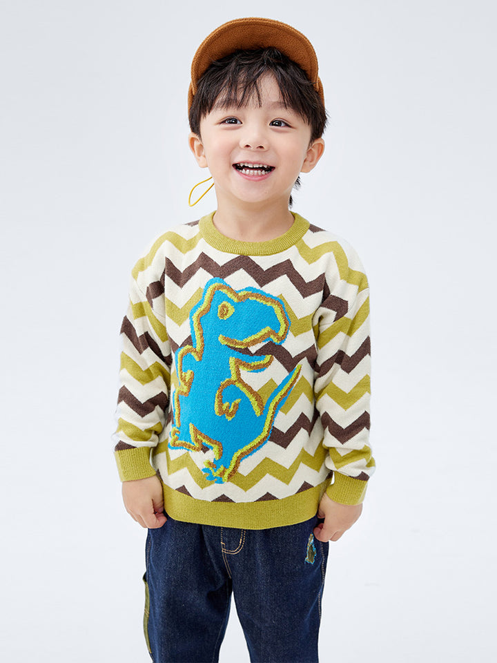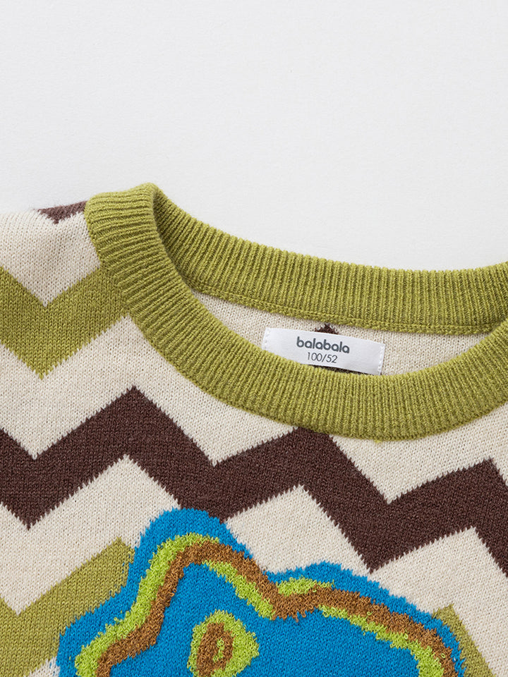 long sleeves boy sweater, in a knitted fabric material, decorated with a printed pattern on full design, comes with a rounded shape neckline