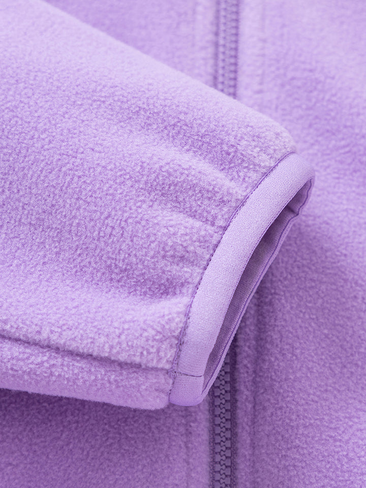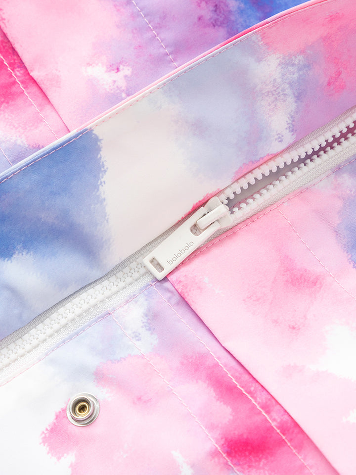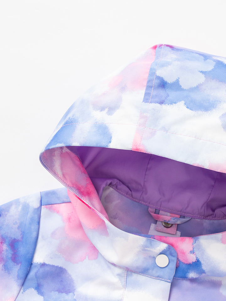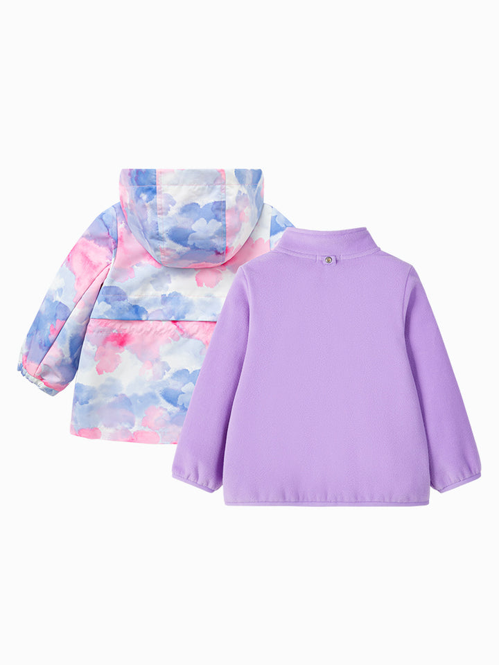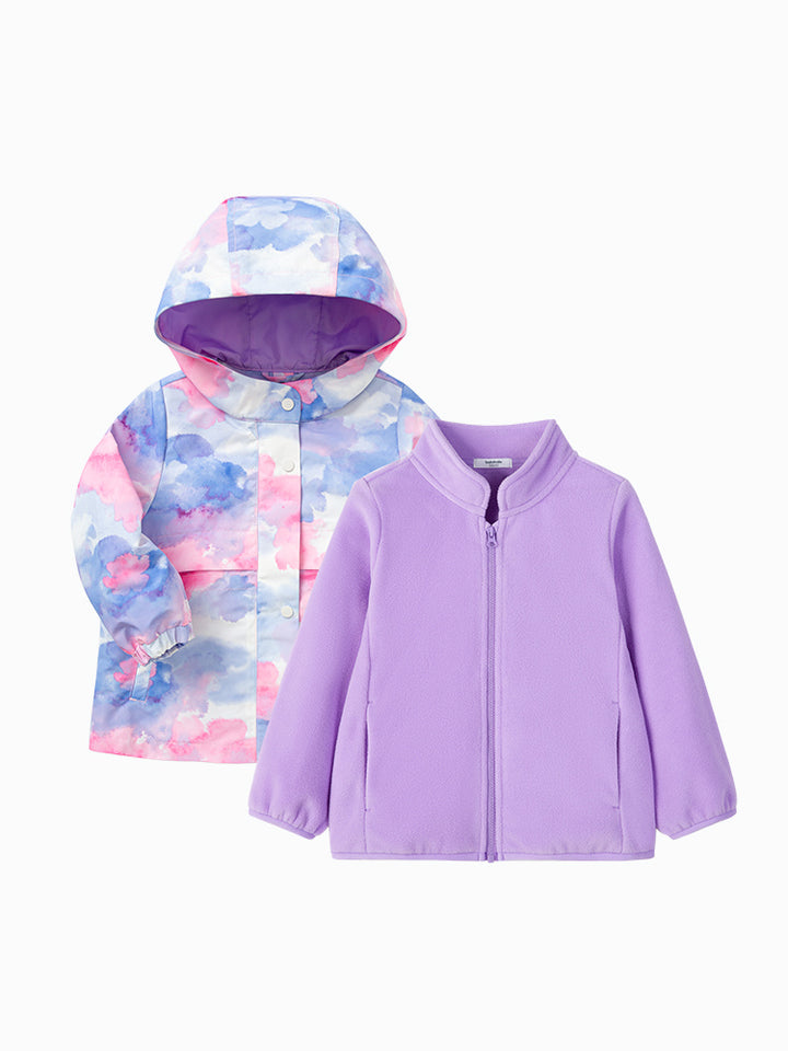 girl winter coat set of two pieces, an internal long sleeves fabric jacket in a solid mono colored pattern, comes with front pockets, zipper for closure on the front side and with a high rounded shape collar, and an outer coat with long sleeves decorated with a printed pattern on full design, pockets on the front side, front zipper for closure and an attached hoodie collar