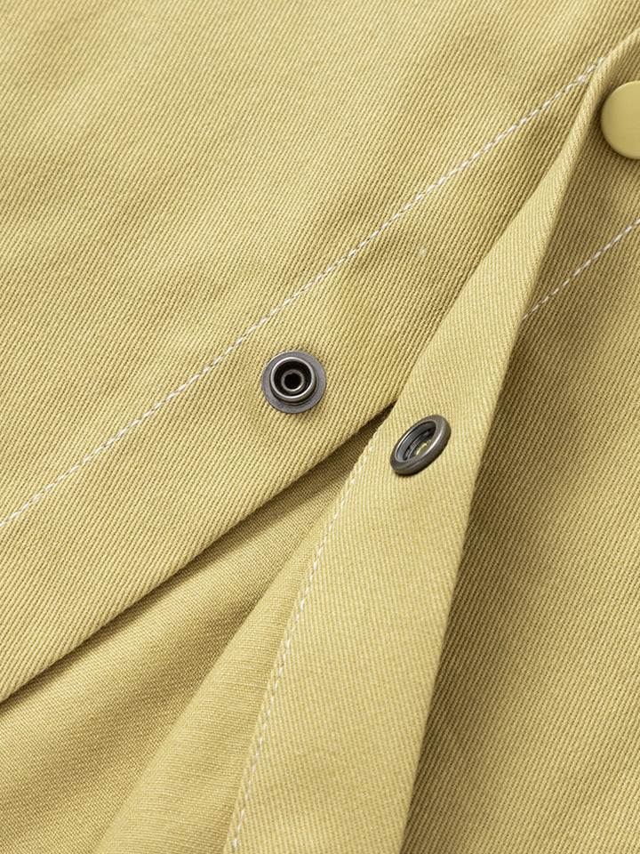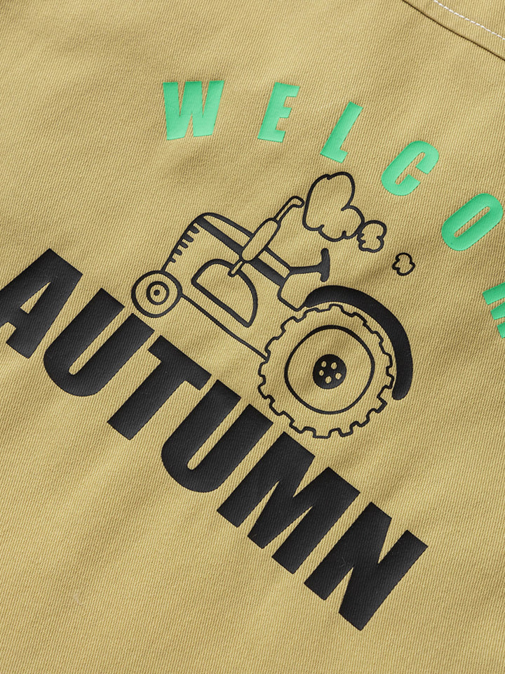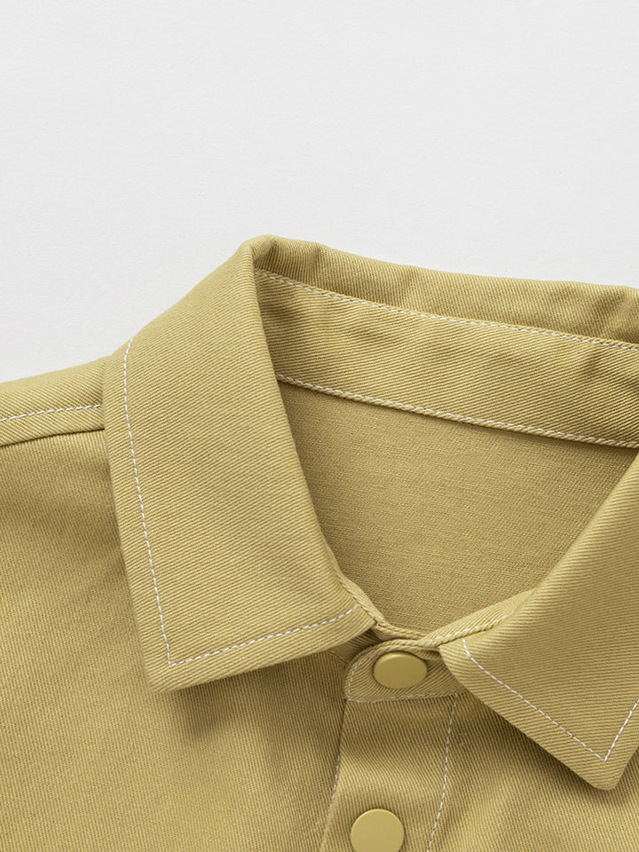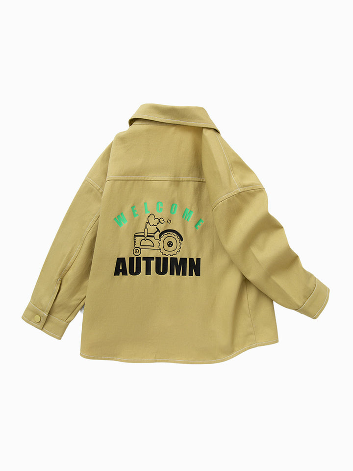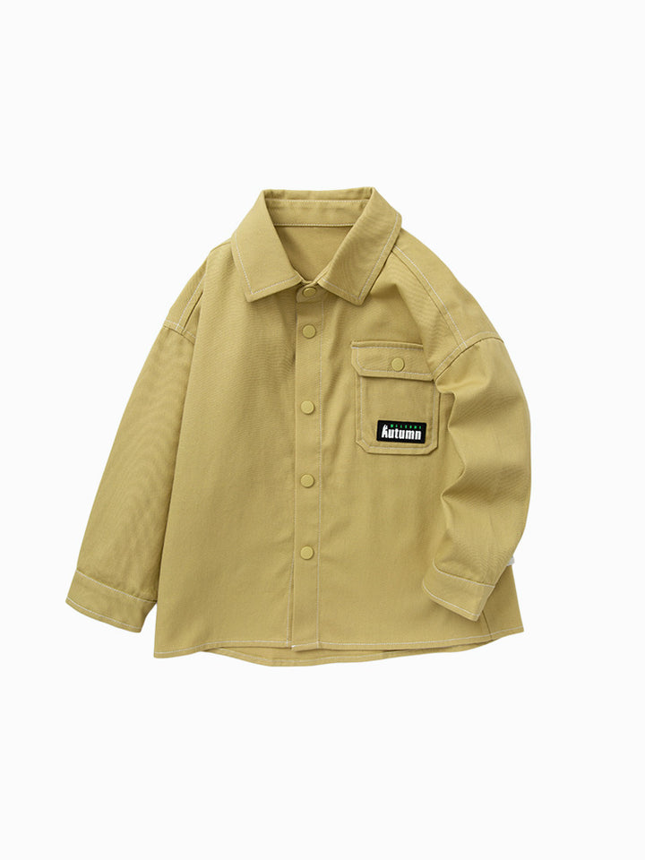 long sleeves boy shirt, decorated with a print on the back side, comes with pocket on the front side, front push buttons for closure on the front side and with a classic regular collar