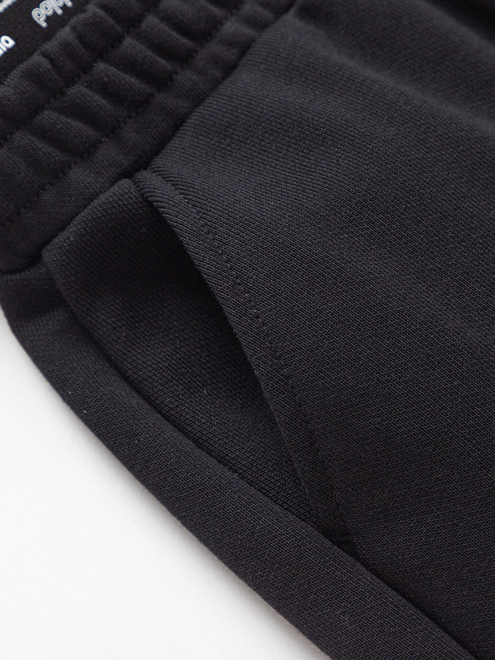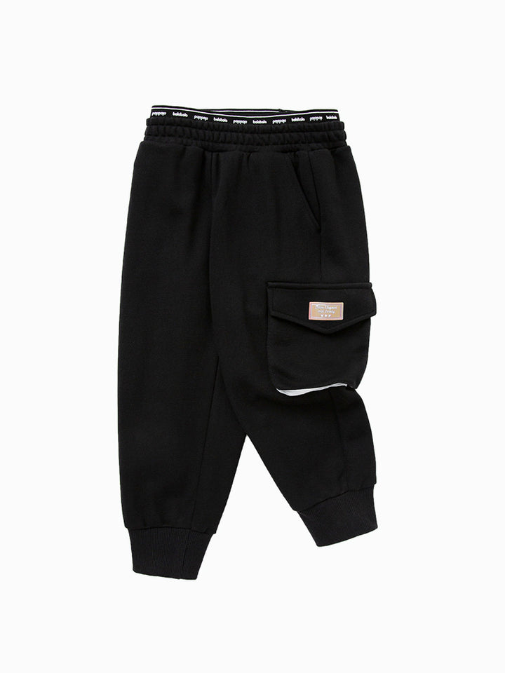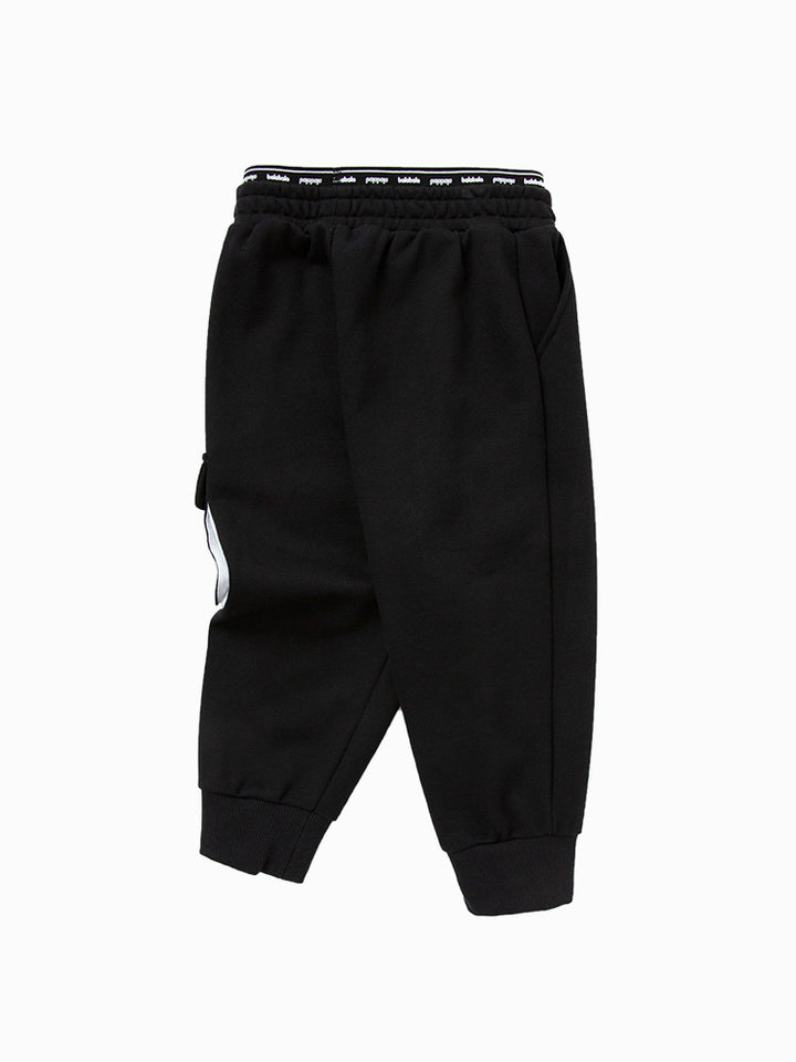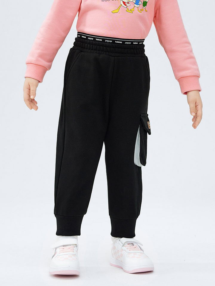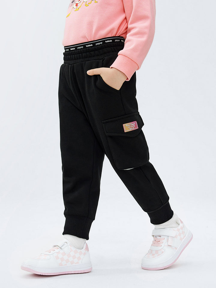 girl casual sweatpants in a solid mono colored pattern, comes with flap pocket on the side of one leg, pockets on the frotn side and comfy elasticated waistband decorated with prints