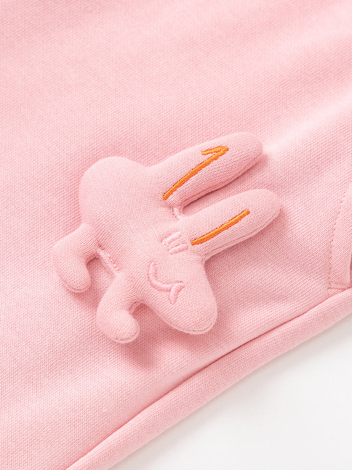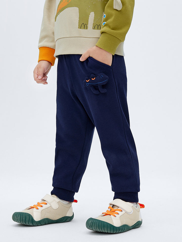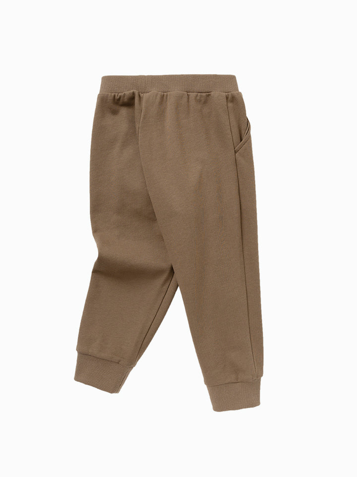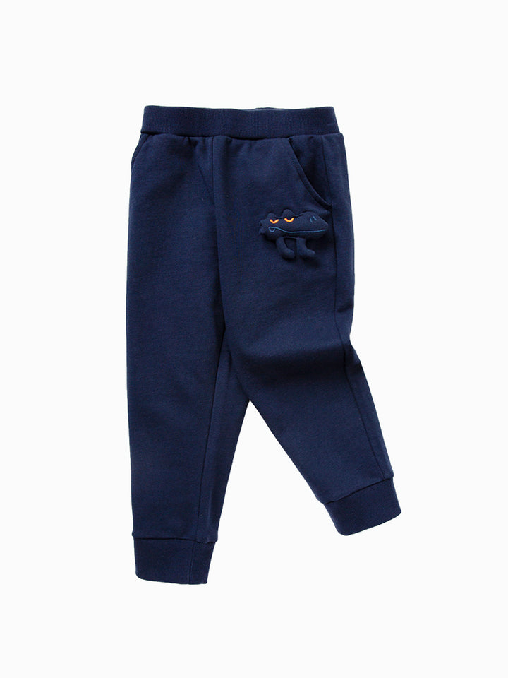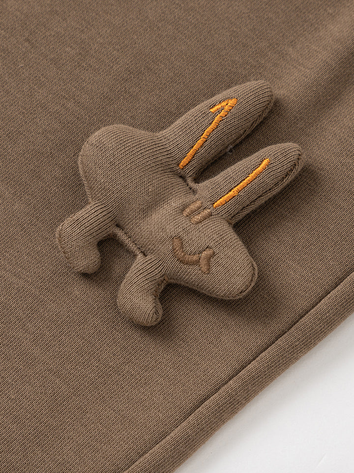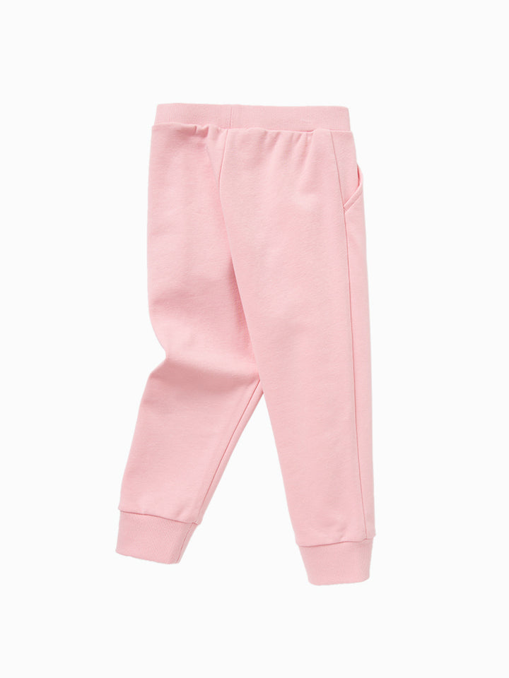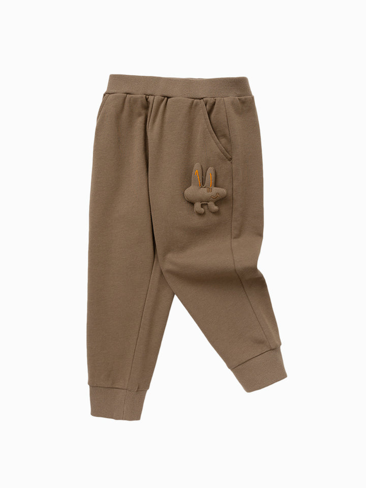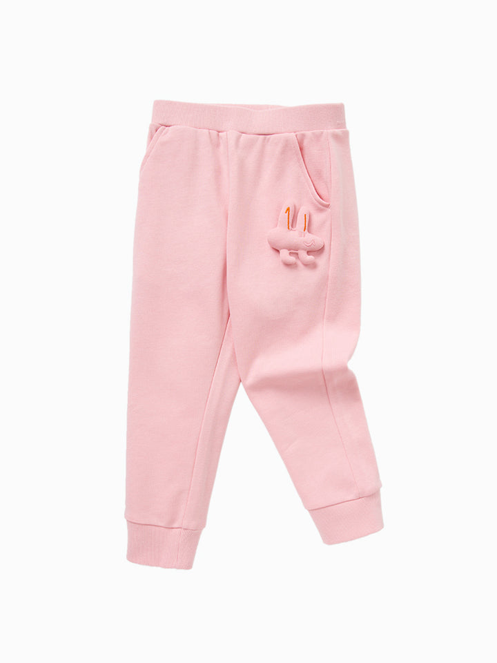 casual sweatpants in a solid mono colored pattern, decorated with a small stuffed toy detail on the front side, comes with pockets on the front side and a comfy elasticated waistband