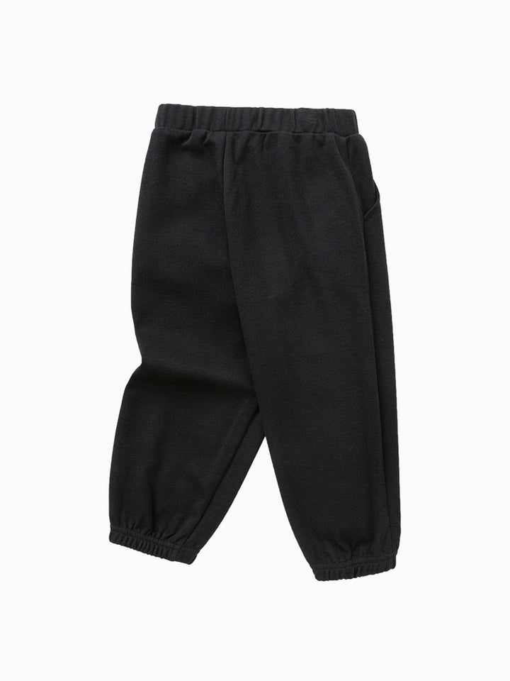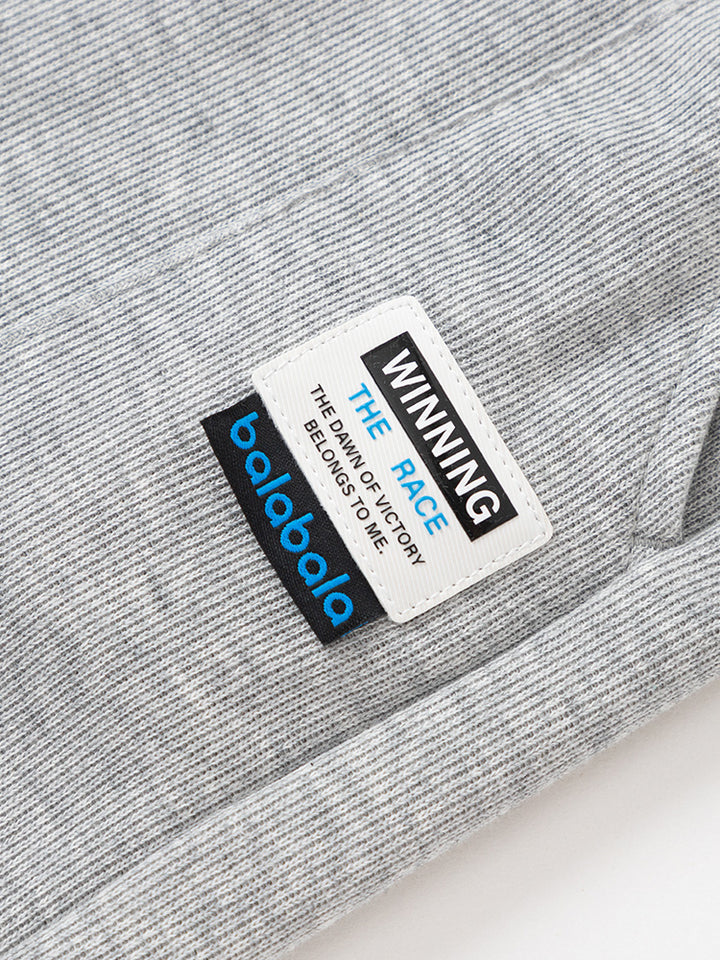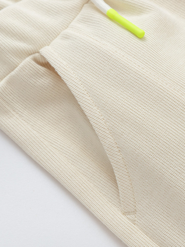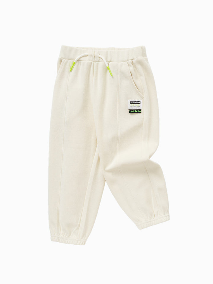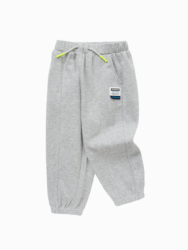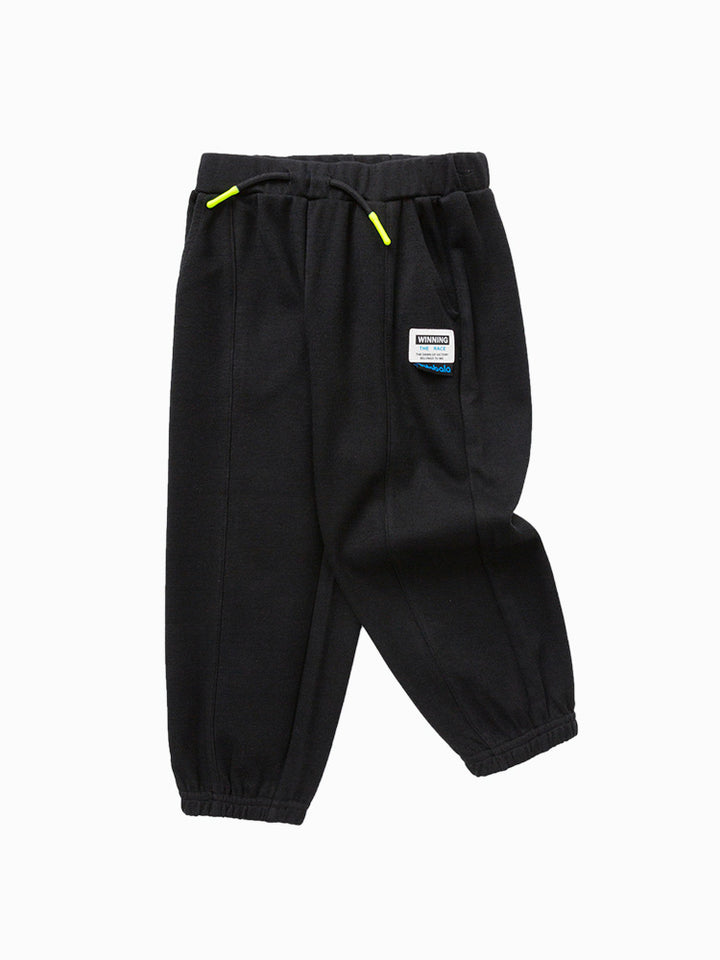 casual sweatpants in a solid mono colored pattern, decorated with a small patch on the front side, comes with pockets on the front side, adjustable drawstring and a comfy elasticated waistband
