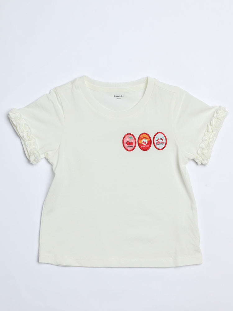 A stylish kids’ t-shirt featuring short embellished sleeves and playful front embroidery details. Designed for comfort and easy wear, making it perfect for casual everyday looks.