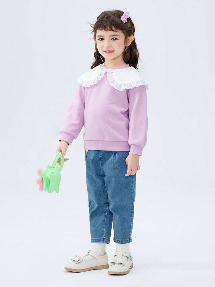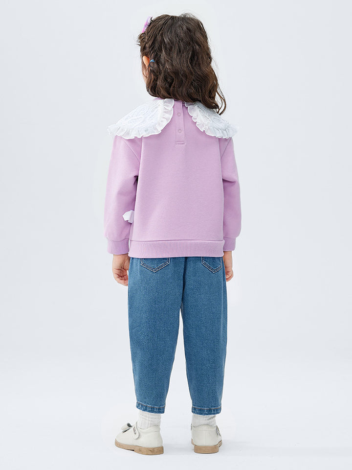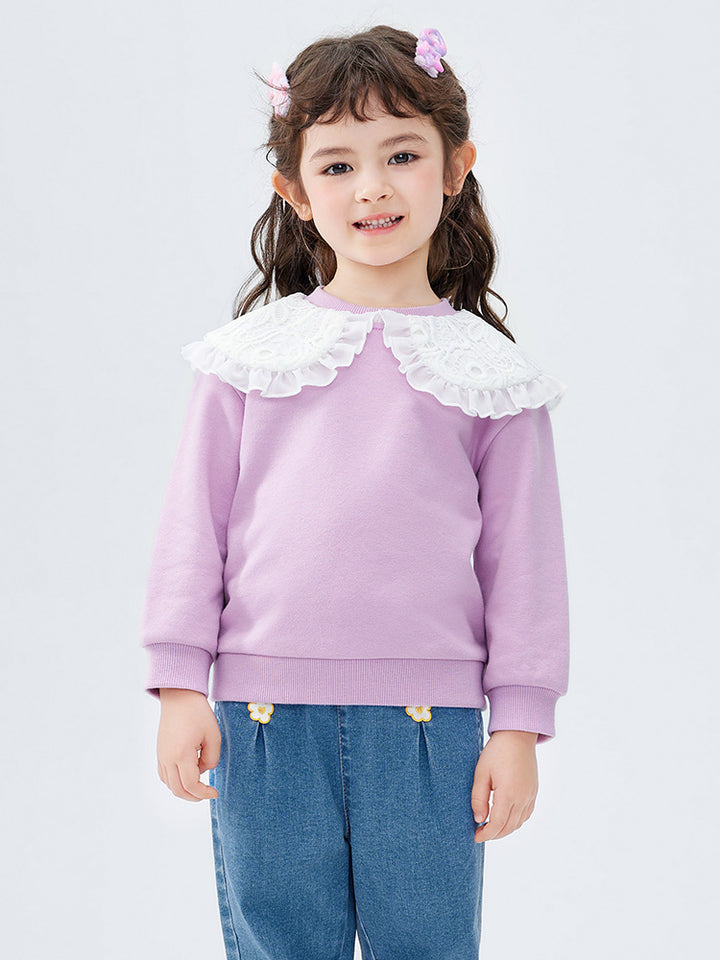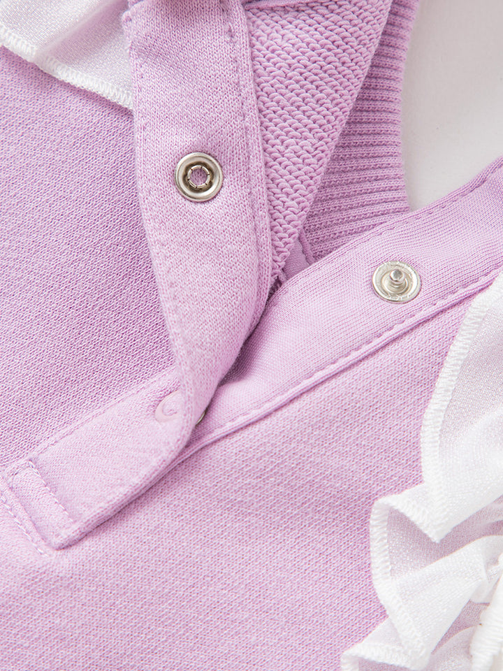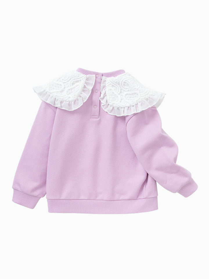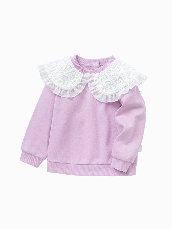 long sleeves girl top, decorated with an embroidered bib style collar, comes with push buttons for closure on the back side and with a rounded shape neckline