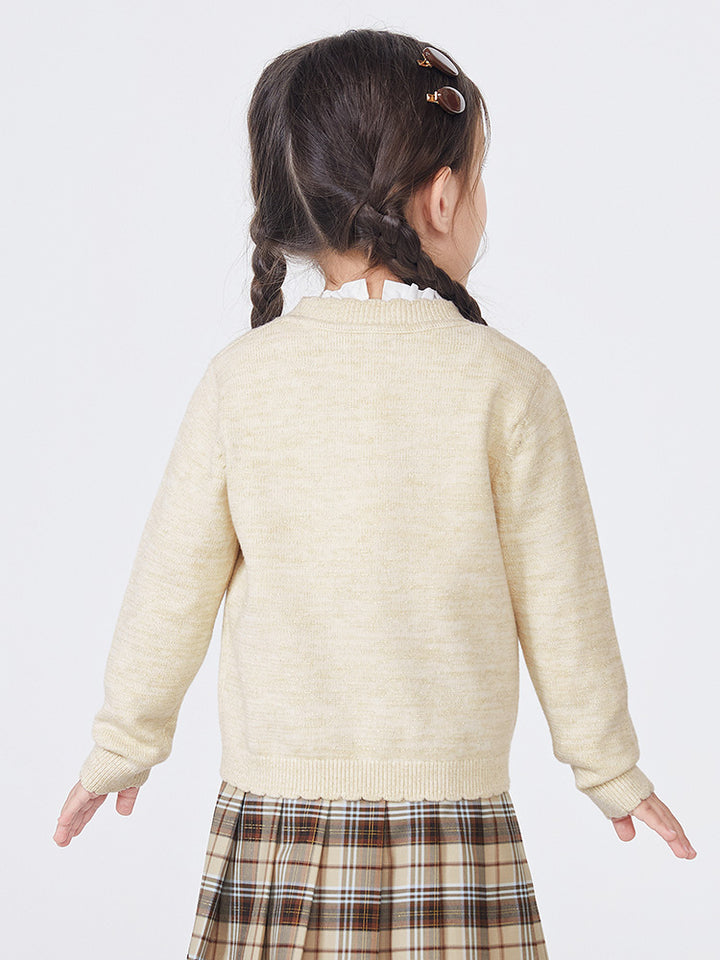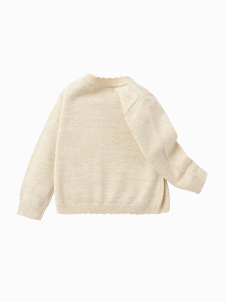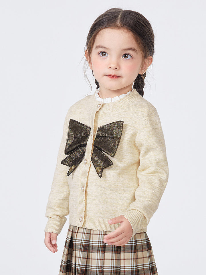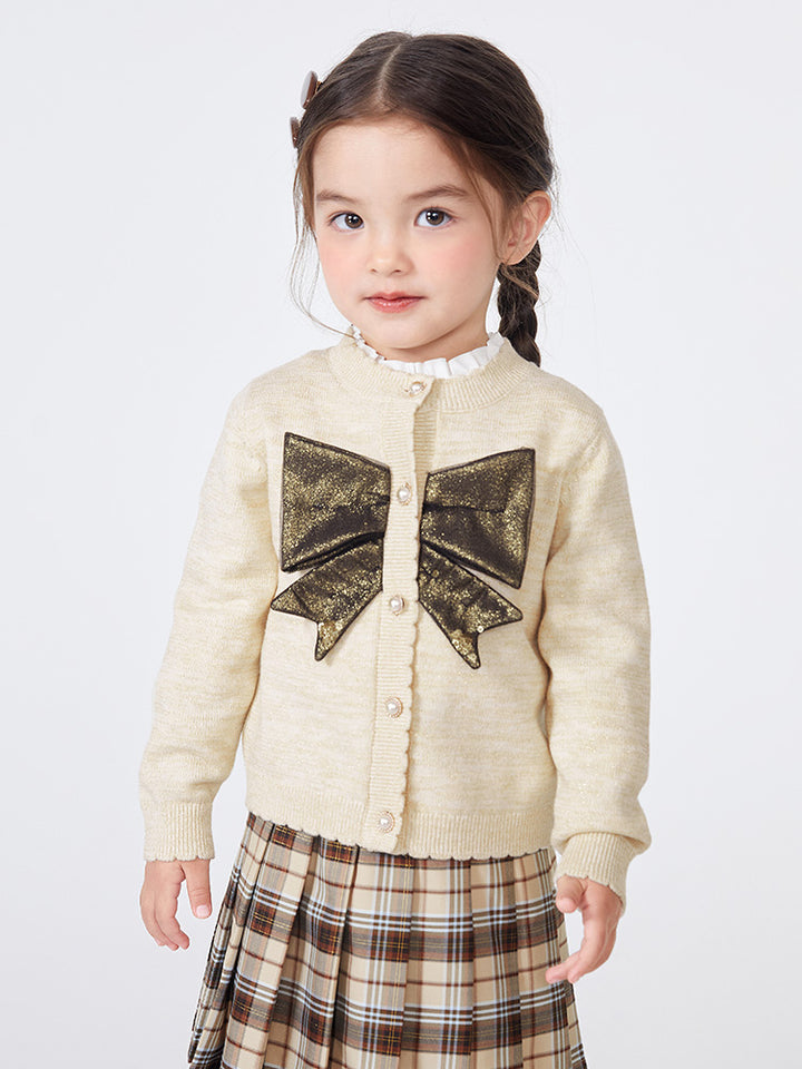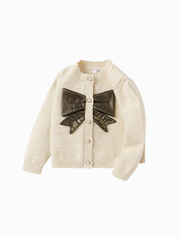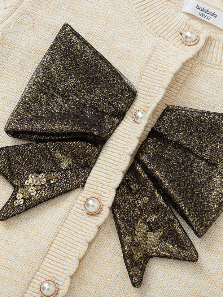 long sleeves knitted cardigan jacket, decorated with a bow tie detail on the front side, comes with buttons for closure on the front side and with a rounded shape collar