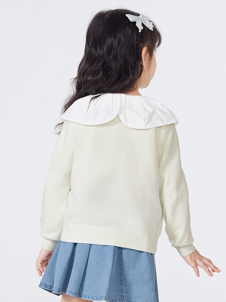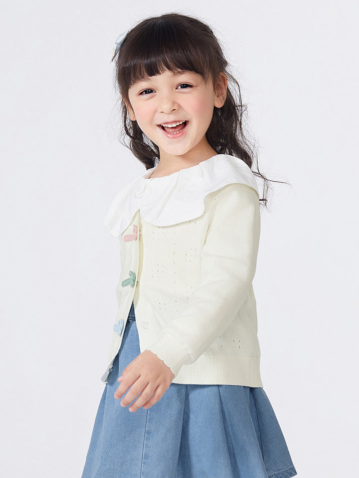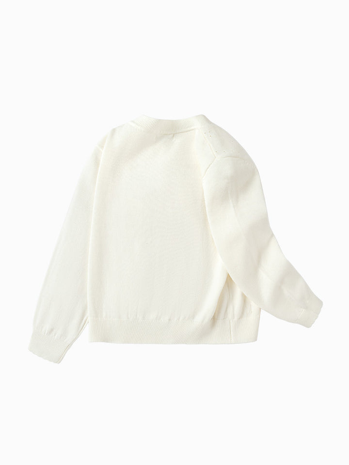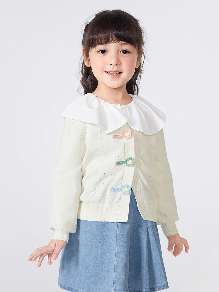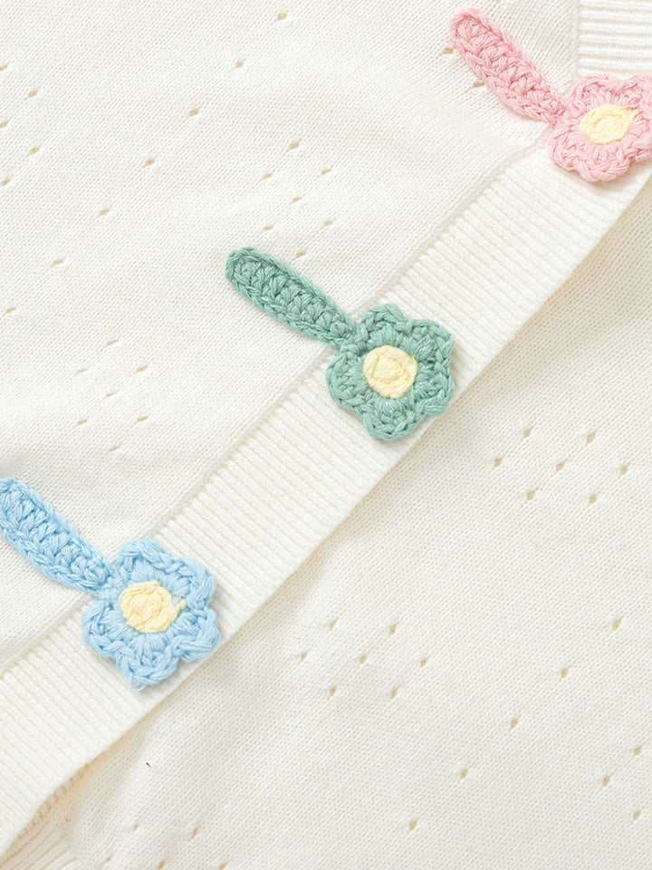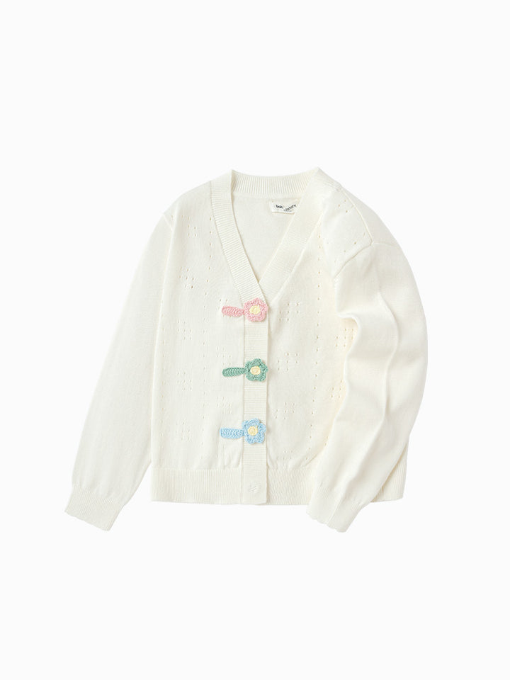long sleeves knitted cardigan jacket, decorated with floral knitting details on the front side, comes with buttons for closure on the front side and with a V shape collar