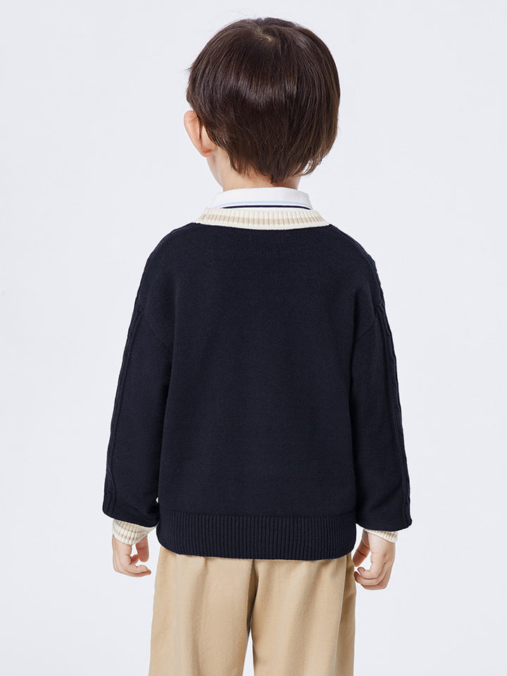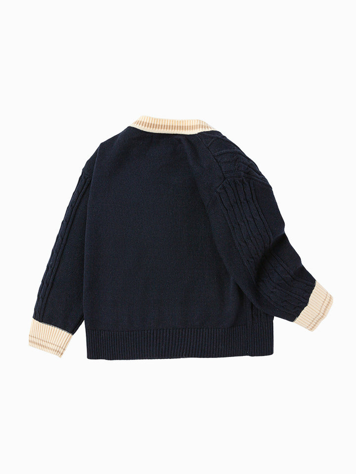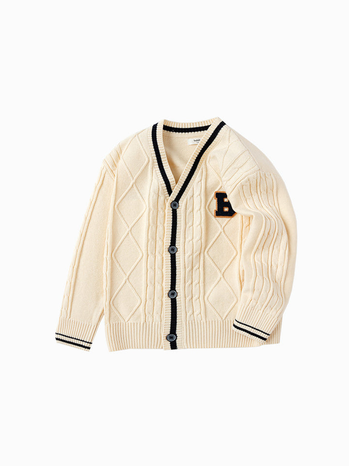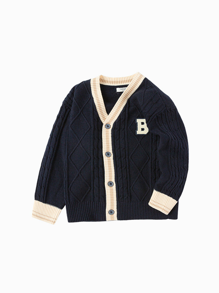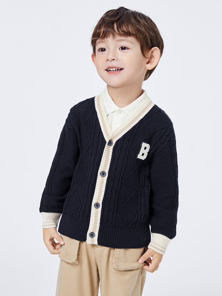 long sleeves knitted cardigan jacket, decorated with a textured pattern fabric and a knitted patch on the front side, comes with buttons for closure on the front side and with a V shape collar