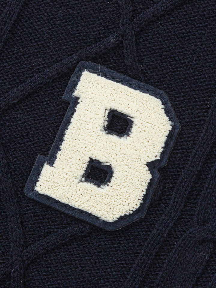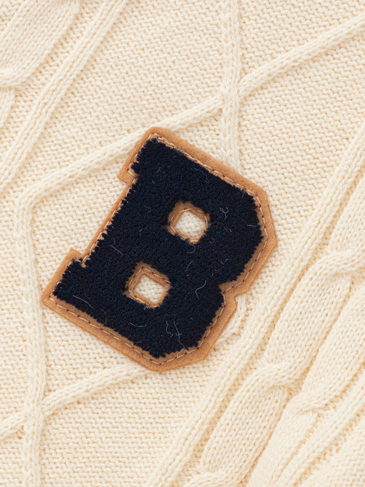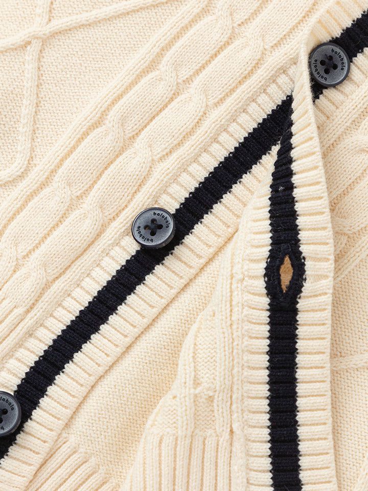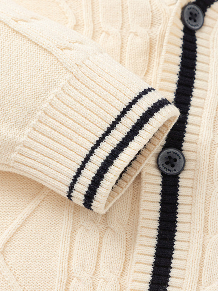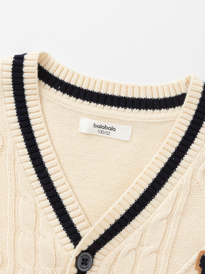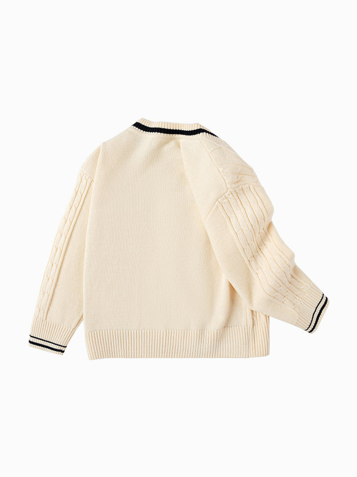 long sleeves knitted cardigan jacket, decorated with a textured pattern fabric and a knitted patch on the front side, comes with buttons for closure on the front side and with a V shape collar
