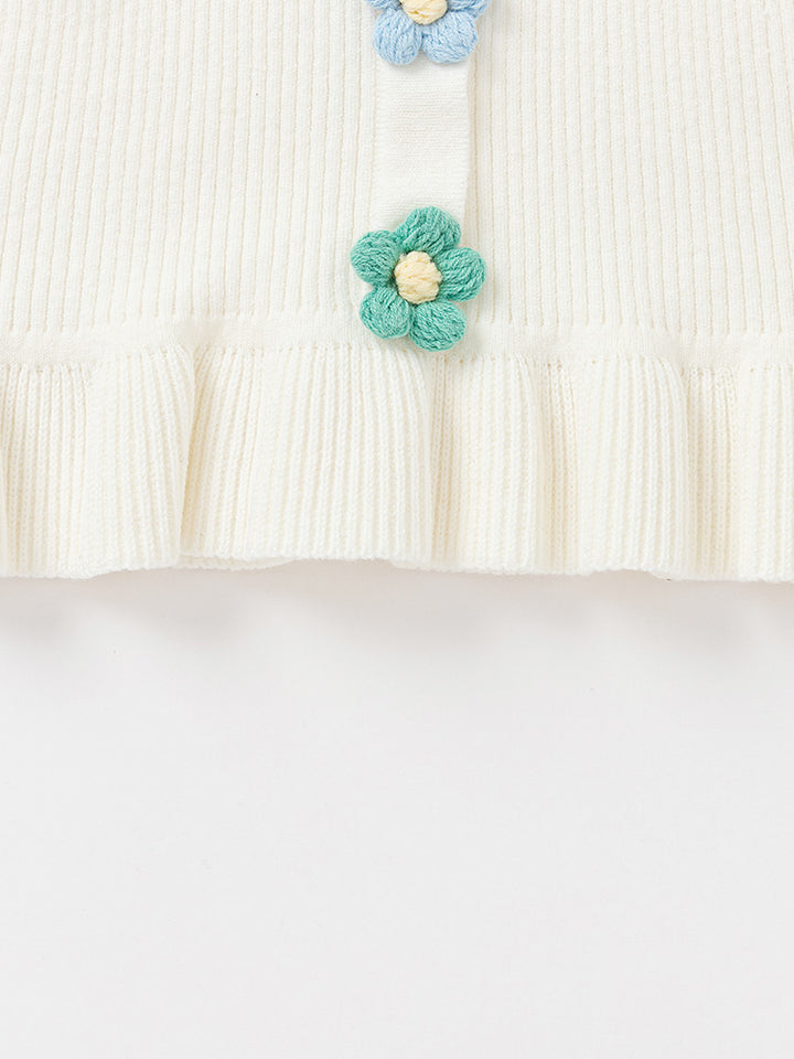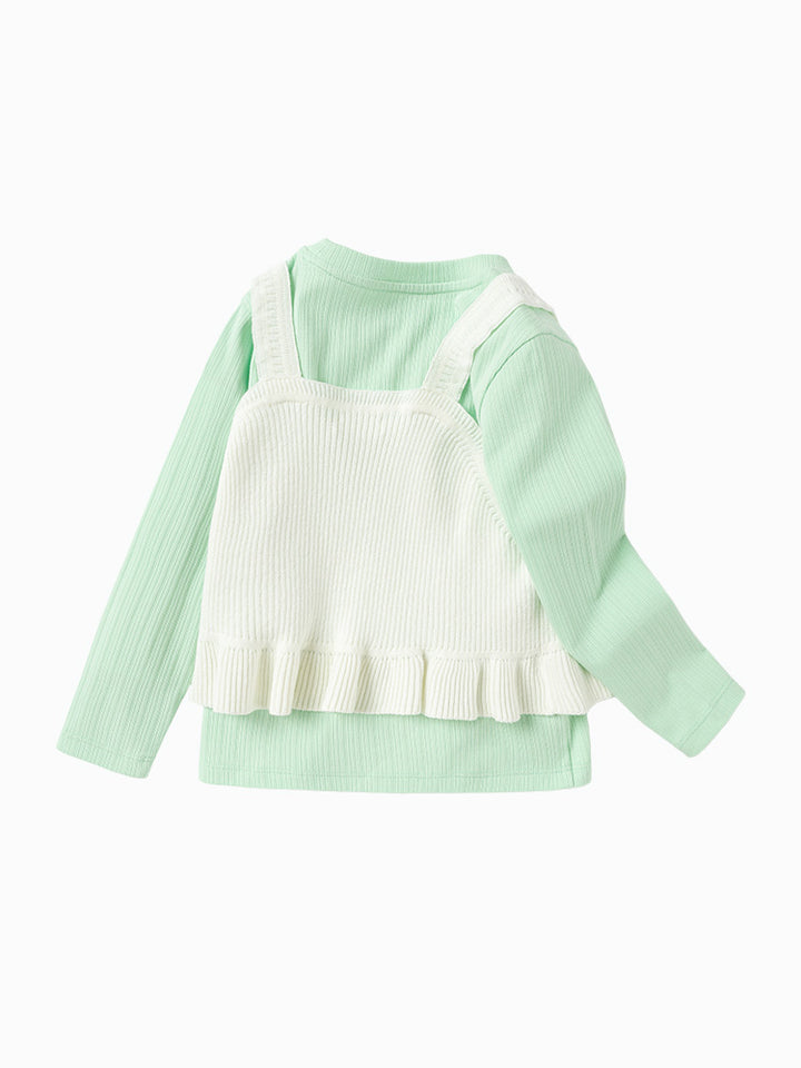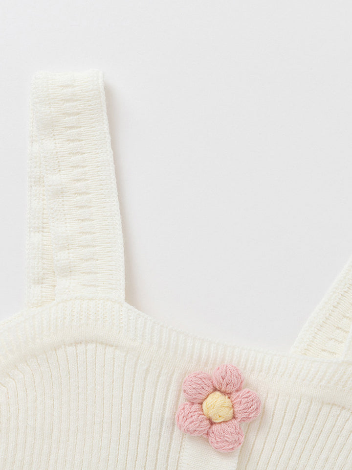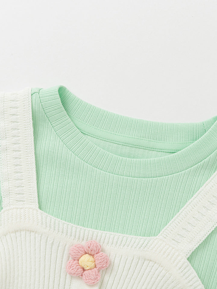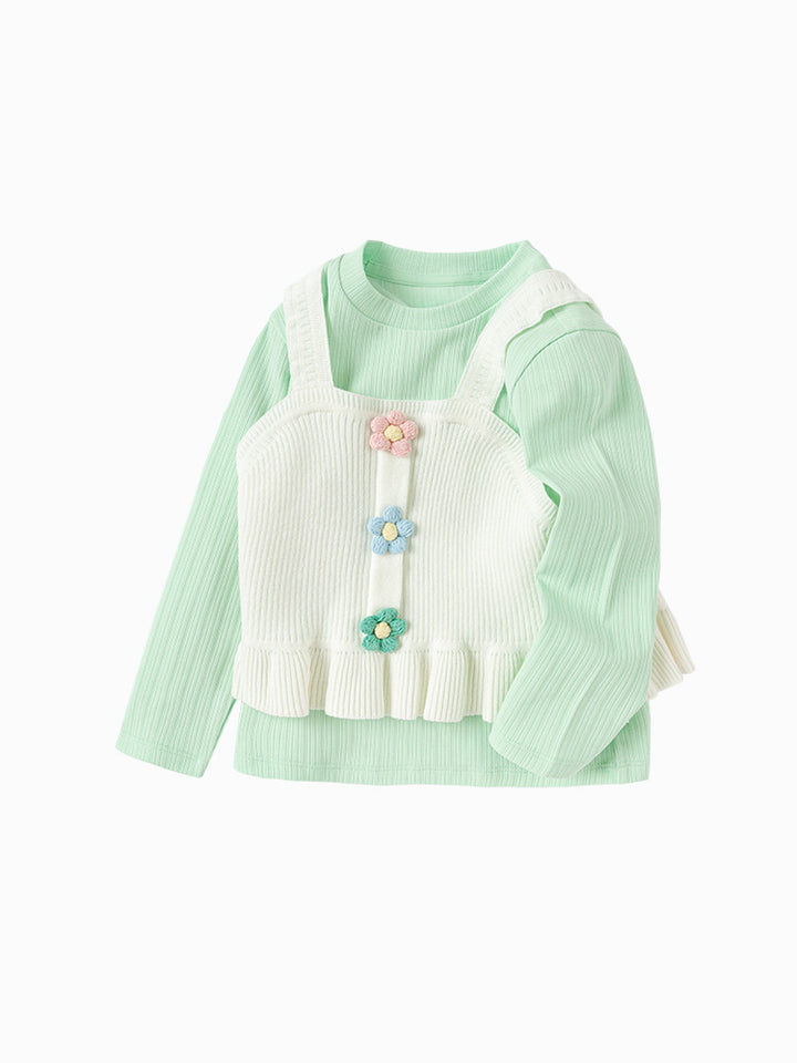double layered top, a long sleeves sweater in a solid colored pattern comes with a rounded shape collar, and a sleeveles top in a textured pattern knitted fabric material, decorated with colored floral knitting on the front side, comes with shoulder straps and a straight shape collar