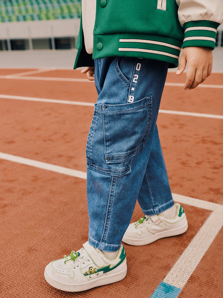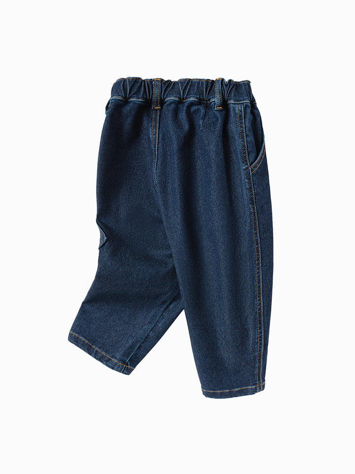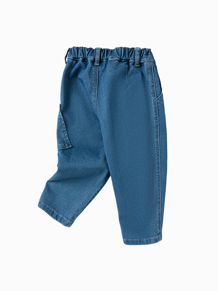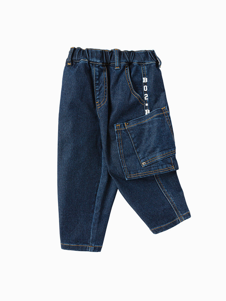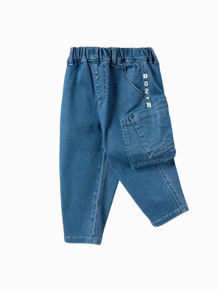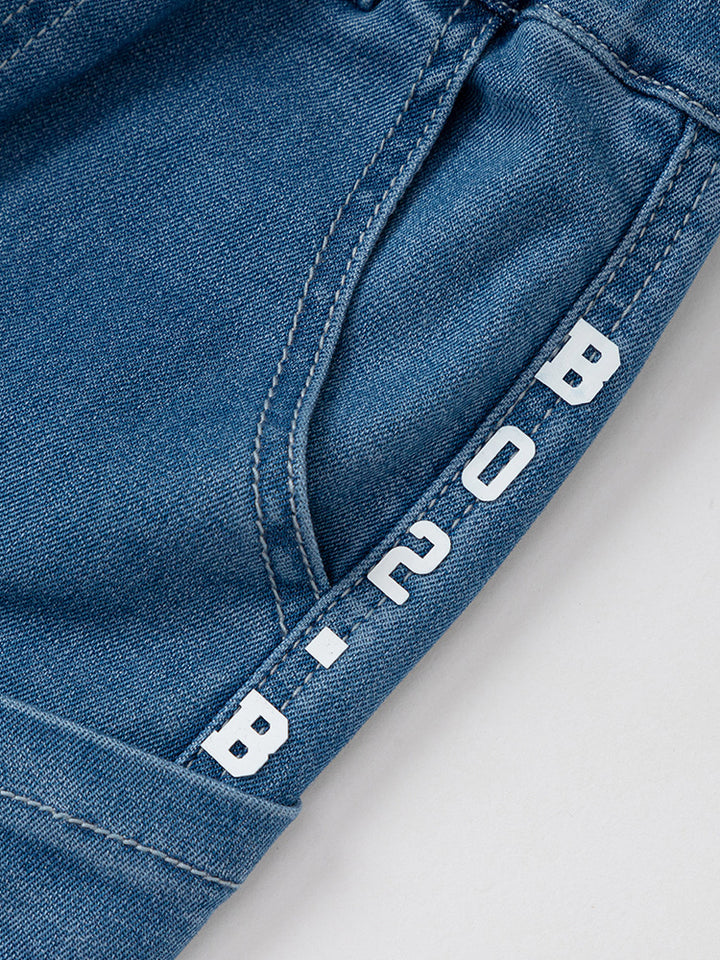 casual denim pants in a solid mono colored pattern, decorated with a print on the side, comes with pockets on the front side and on the side of one leg, and with a comfy elasticated waistband