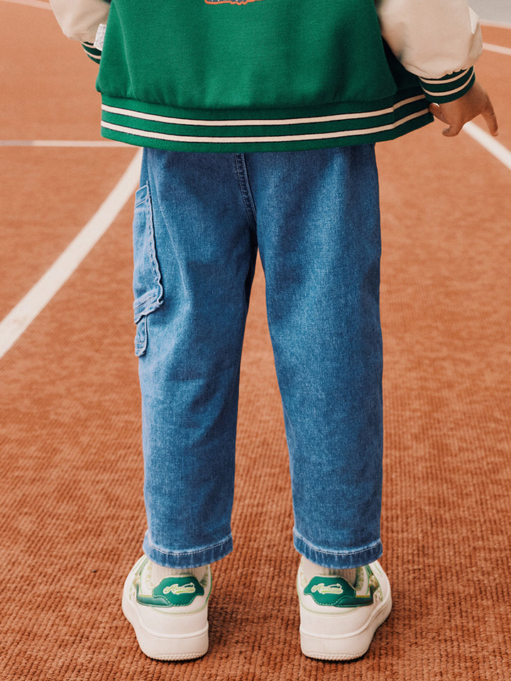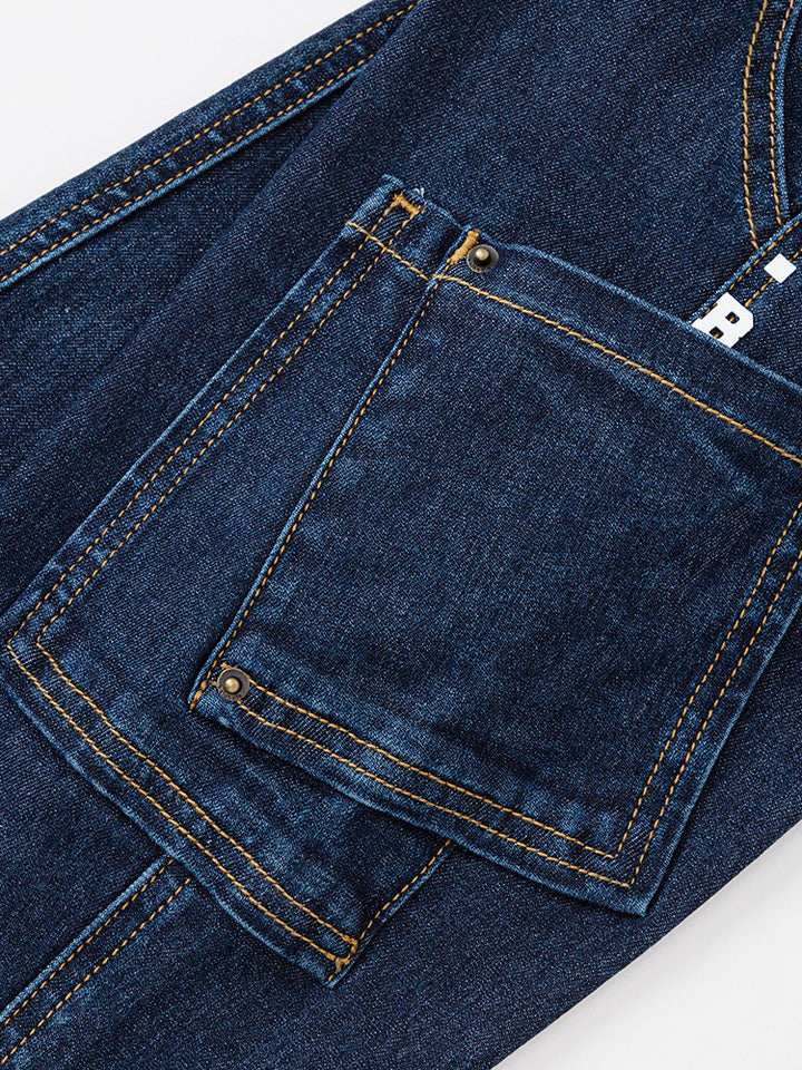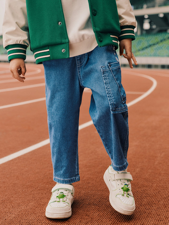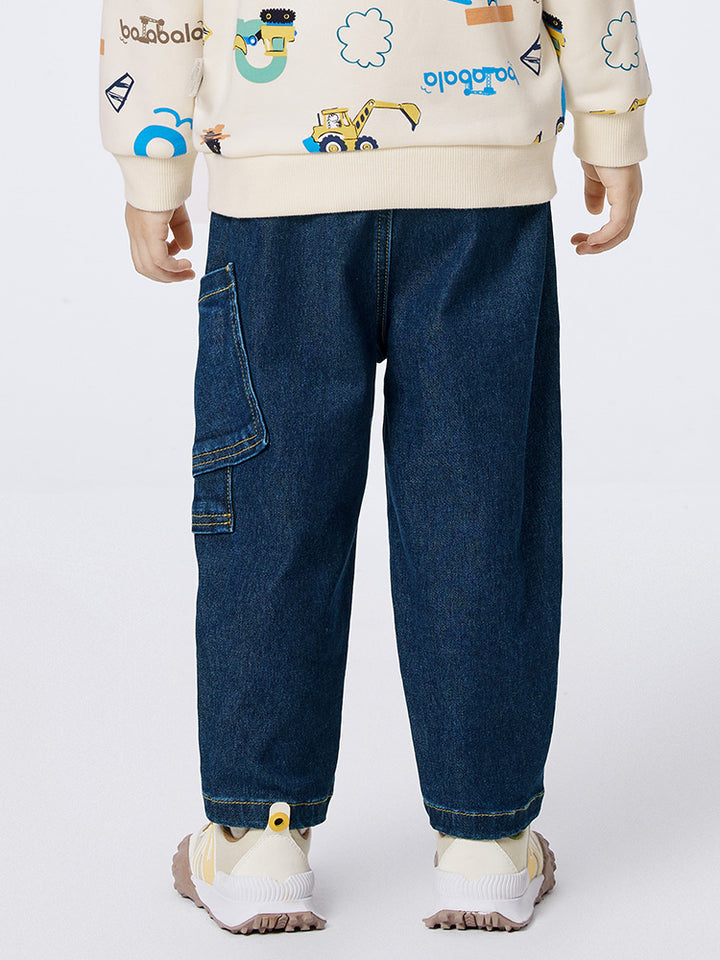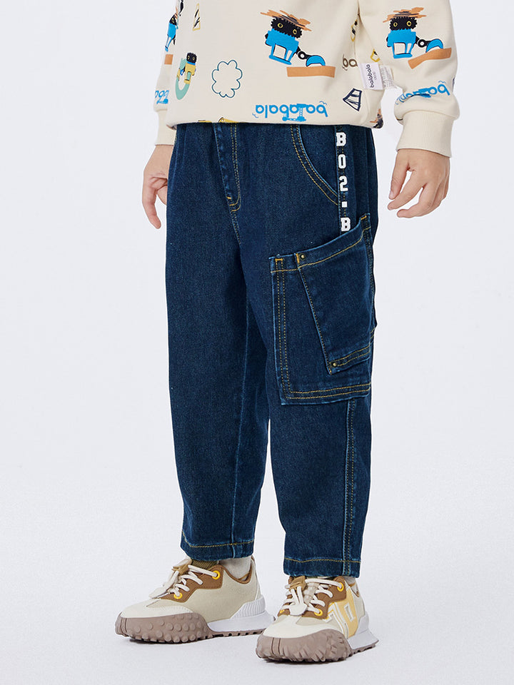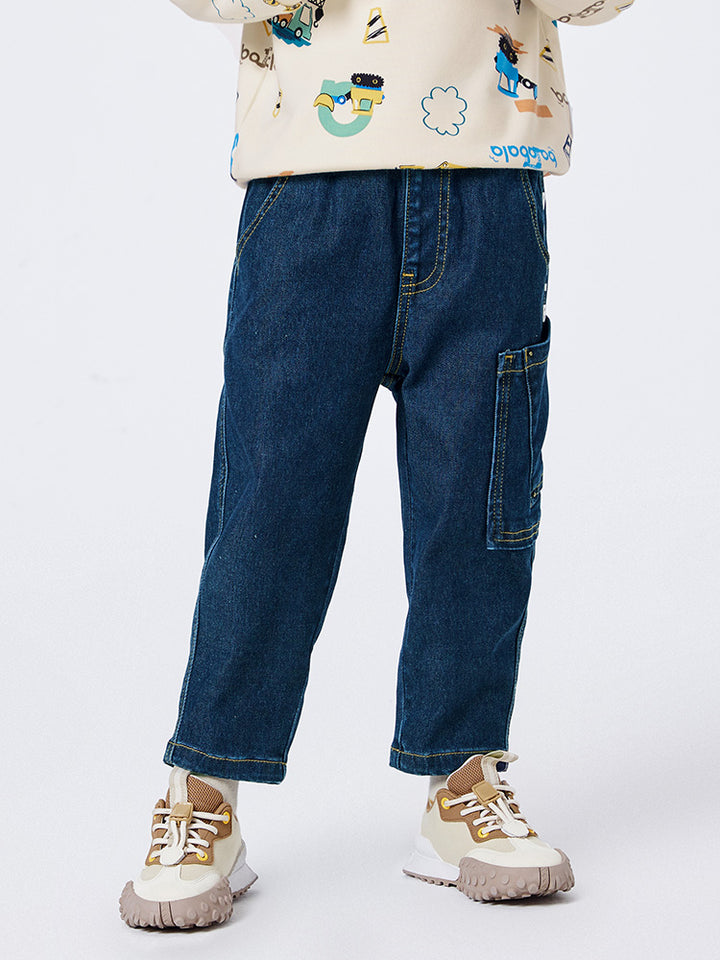 casual denim pants in a solid mono colored pattern, decorated with a print on the side, comes with pockets on the front side and on the side of one leg, and with a comfy elasticated waistband