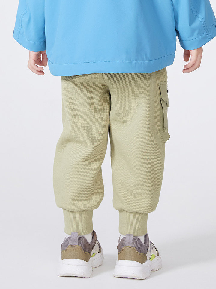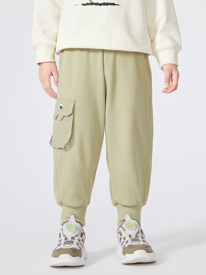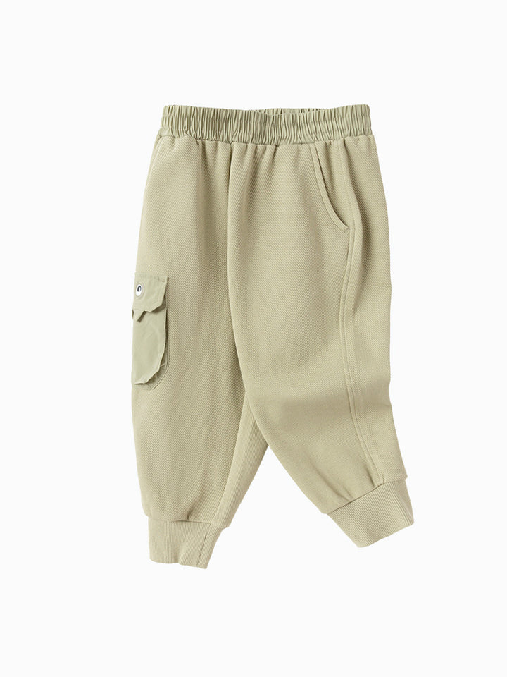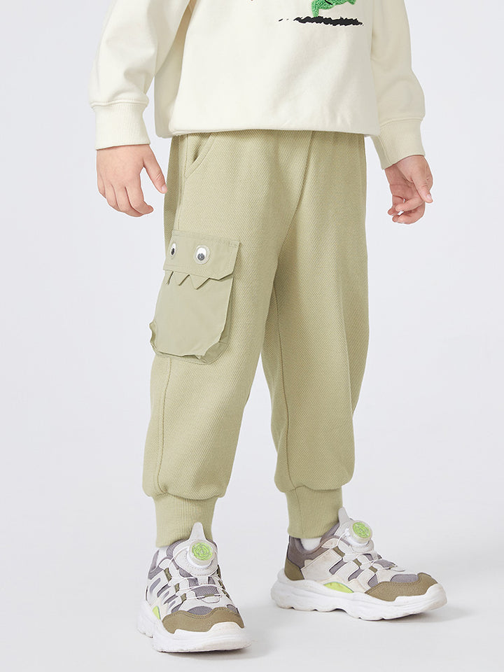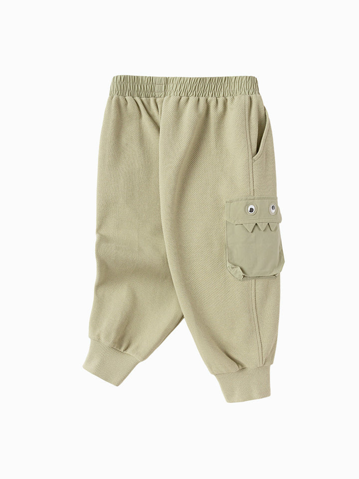 casual pants, decorated with flap pocket wuth fun design on the side of one leg, comes with pockets on the front side and a comfy elasticated waistband