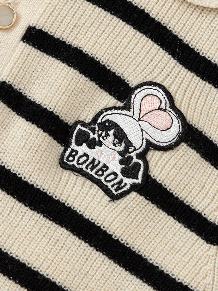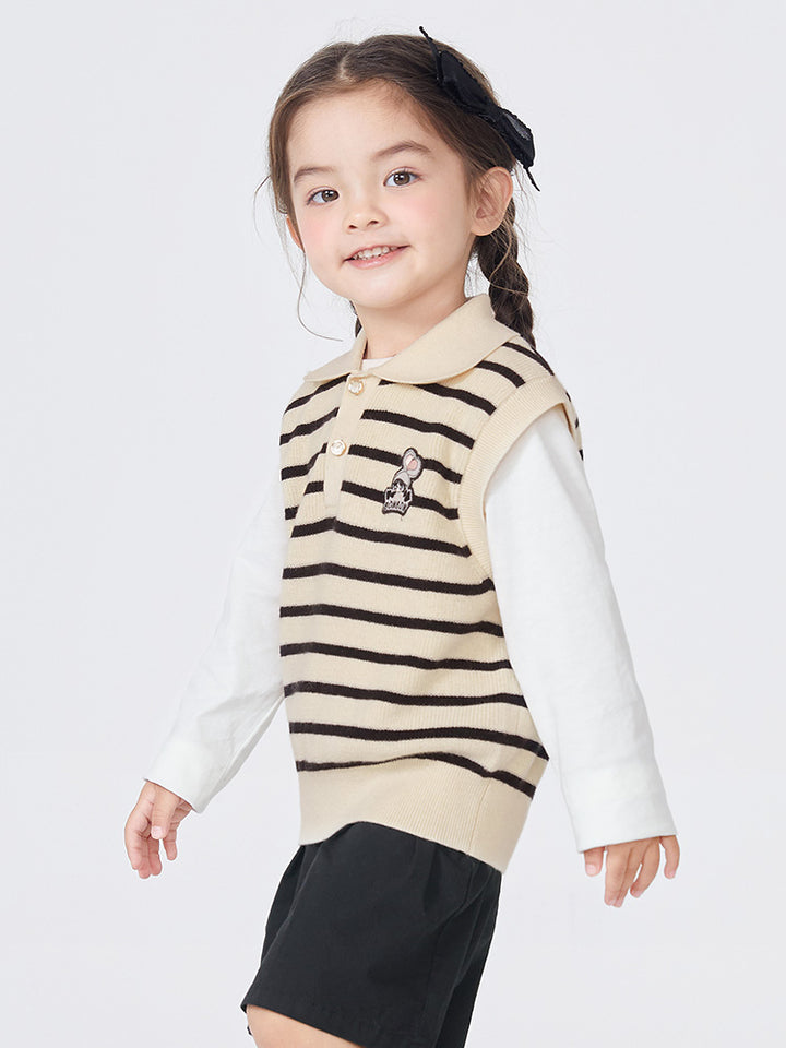 sleeveless knitted vest, decorated with a contrast colored striped pattern and small embroidery print on chhest front side, comes with buttons for closure on the front side and with a classic collar