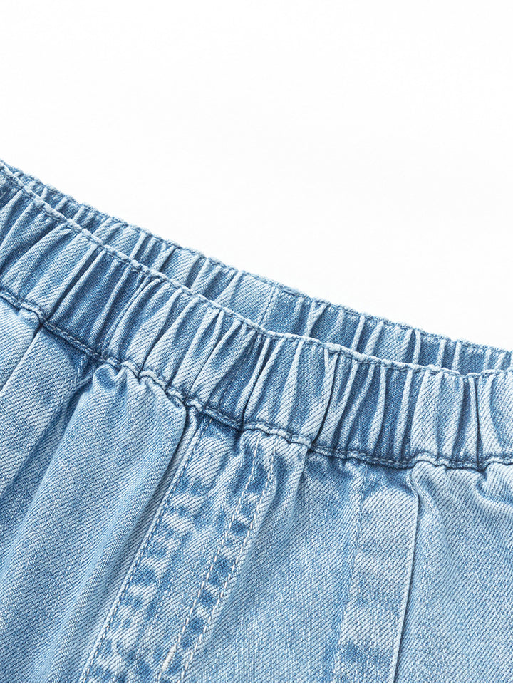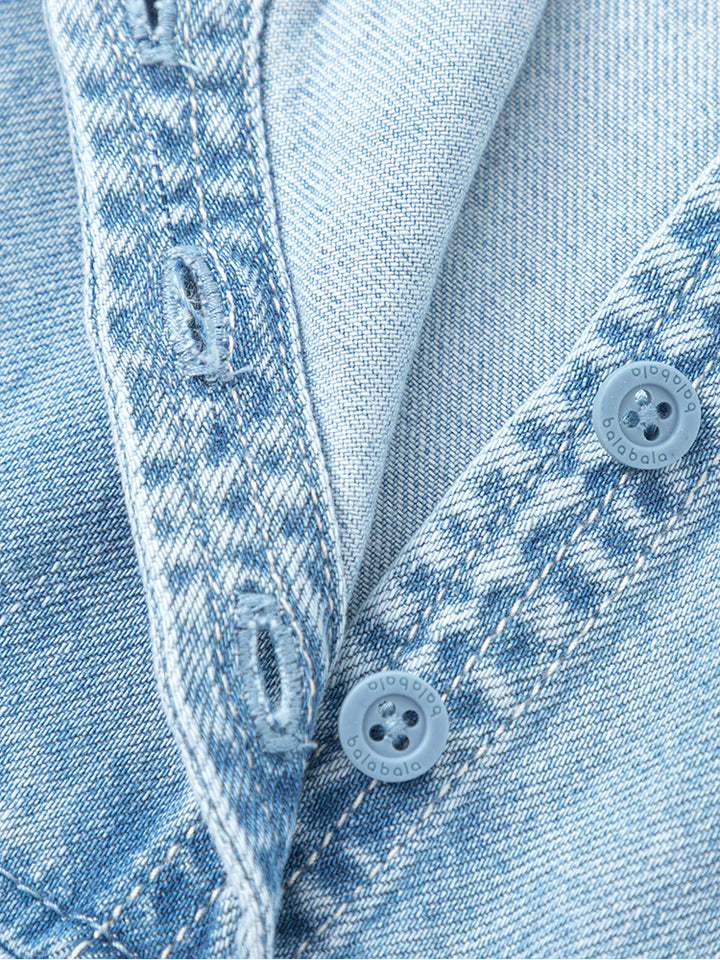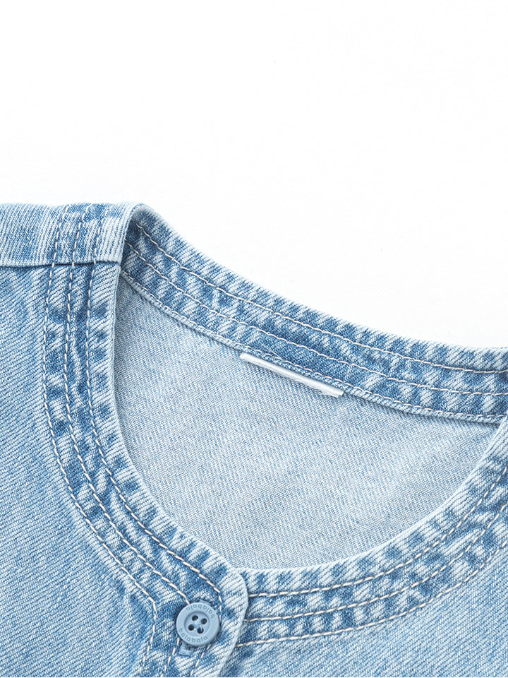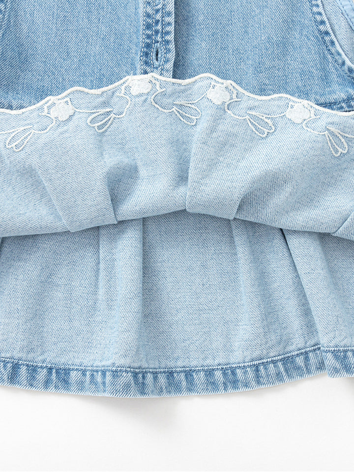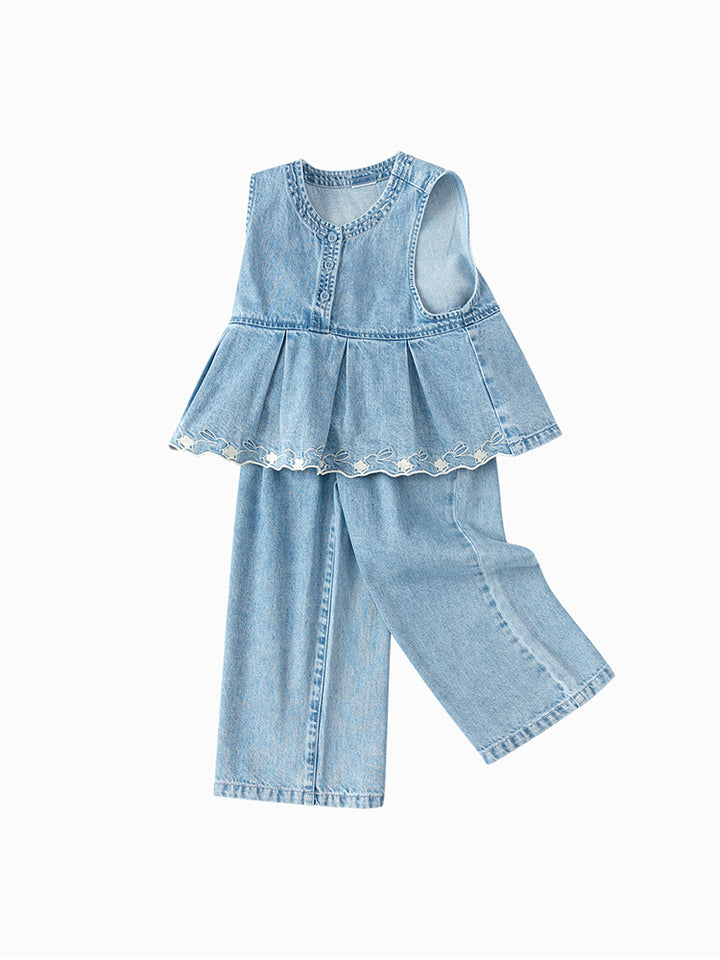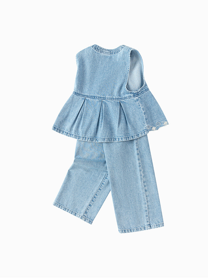 girl denim set of two pieces, a sleeveless top in a solid mono colored pattern decorated with pleats and embroidery details on the front side, comes with front buttons for closure and a rounded shape neckline, and a denim pants in a solid mono colored pattern comes with a comfy elasticated waistband