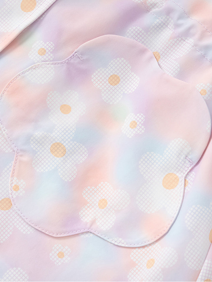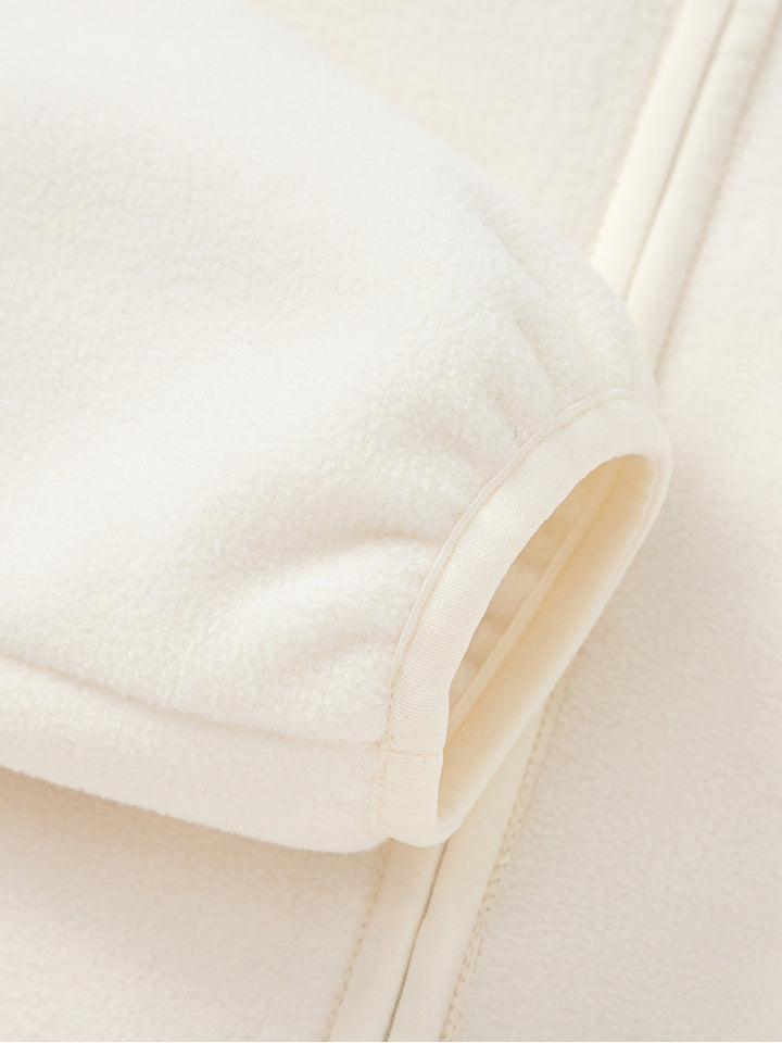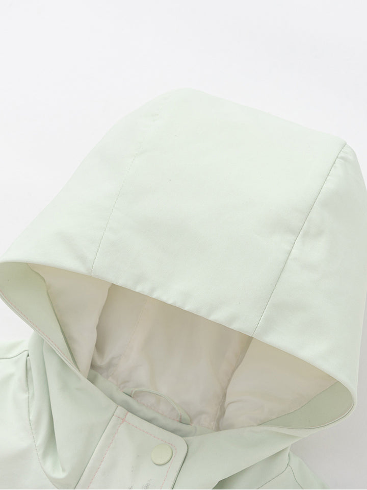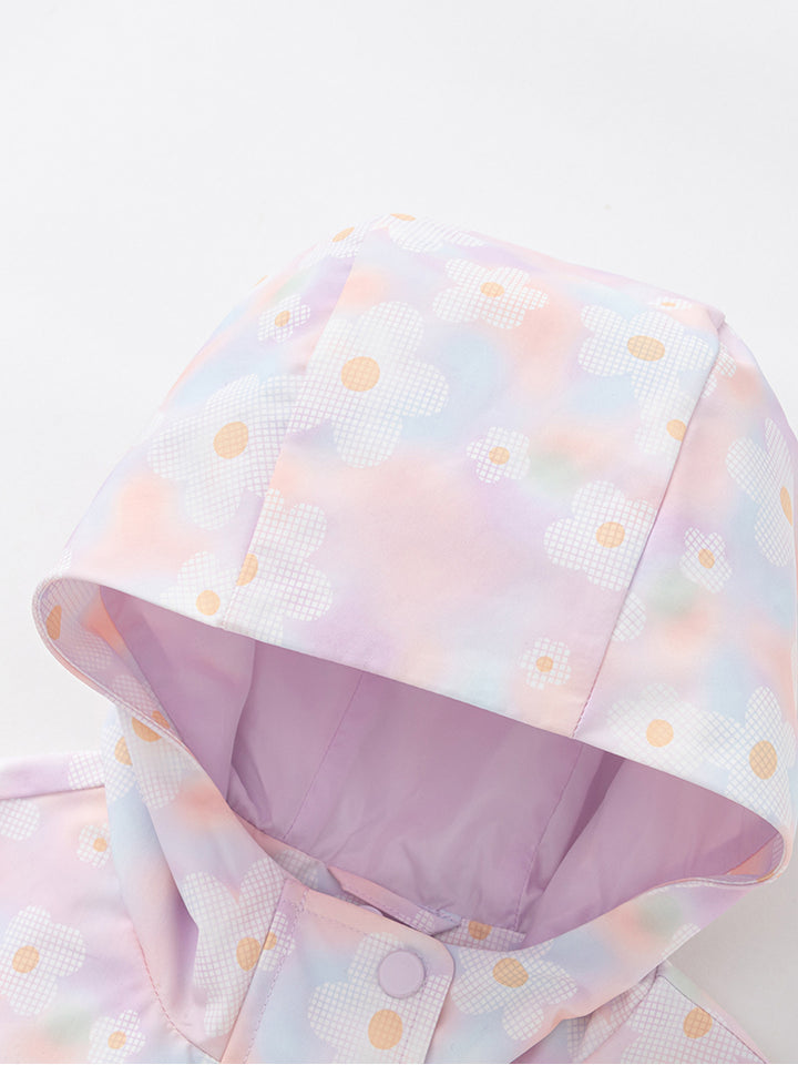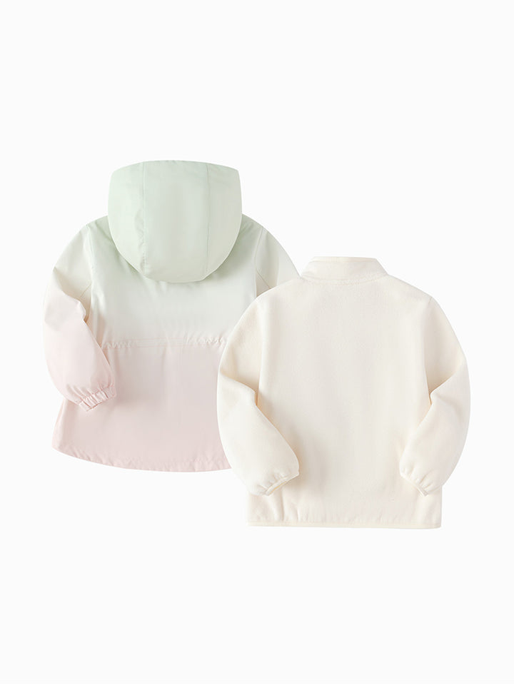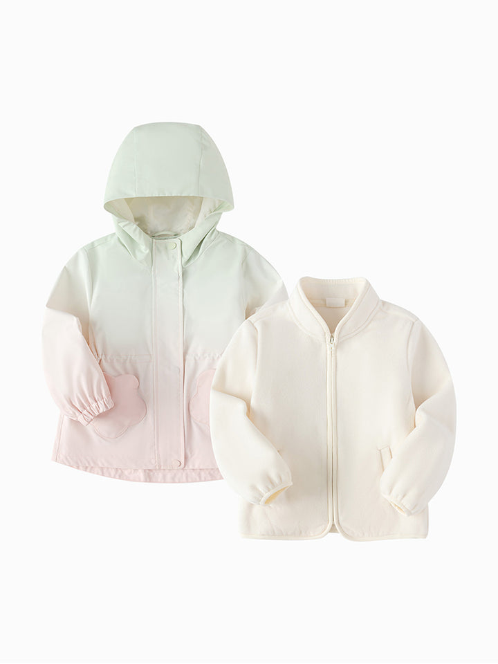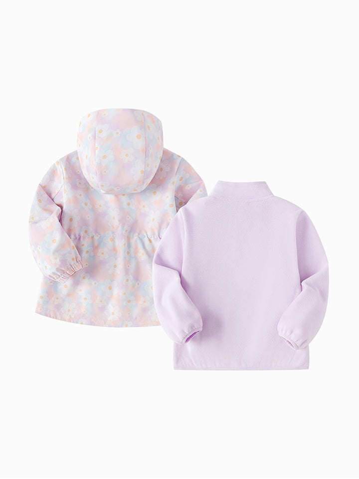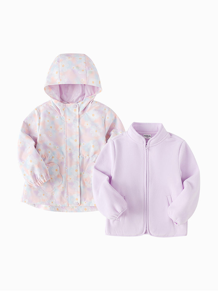 winter coat set of two pieces, and internal long sleeves fabric jacket in a solid mono colored pattern, comes with front pockets, zipper for closure on the front side and with a high rounded shape collar, and an outer coat with long sleeves decorated with printed pattern, pockets on the front side, front zipper for closure and an attached hoodie collar