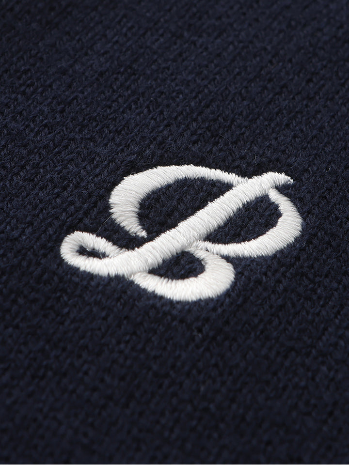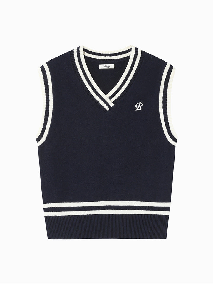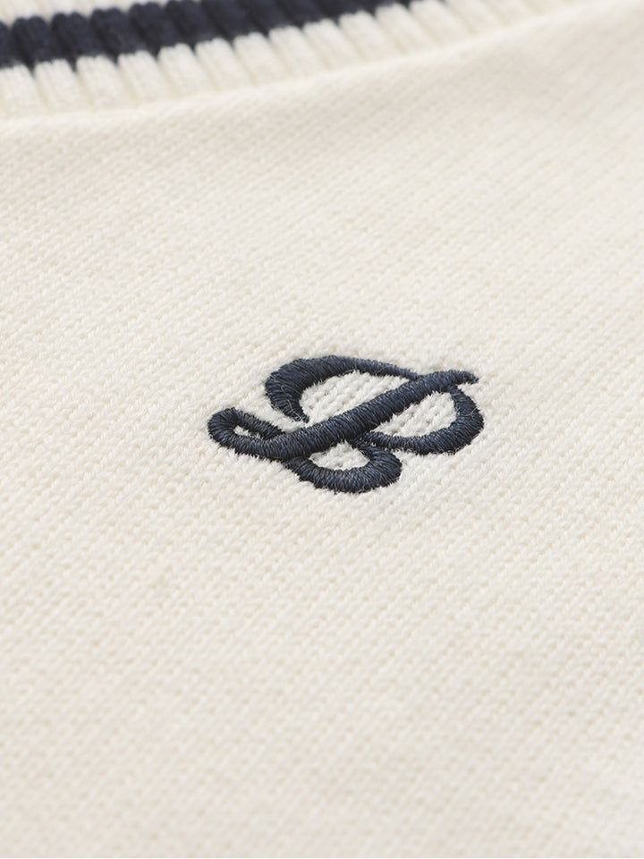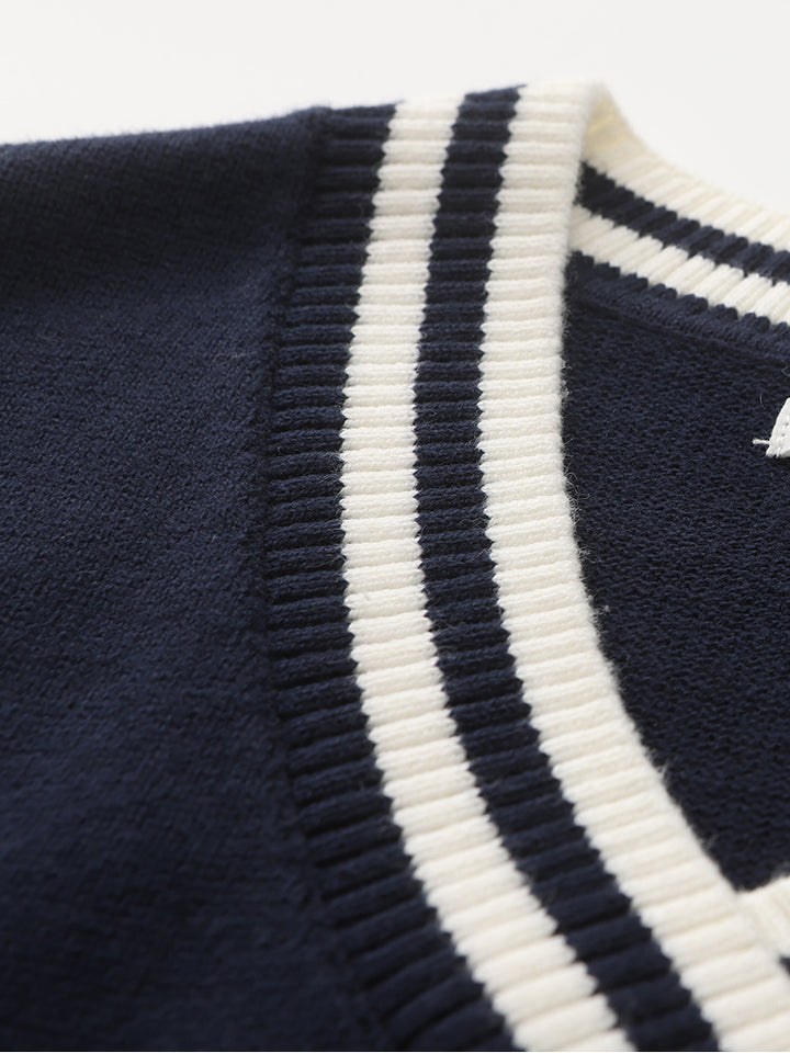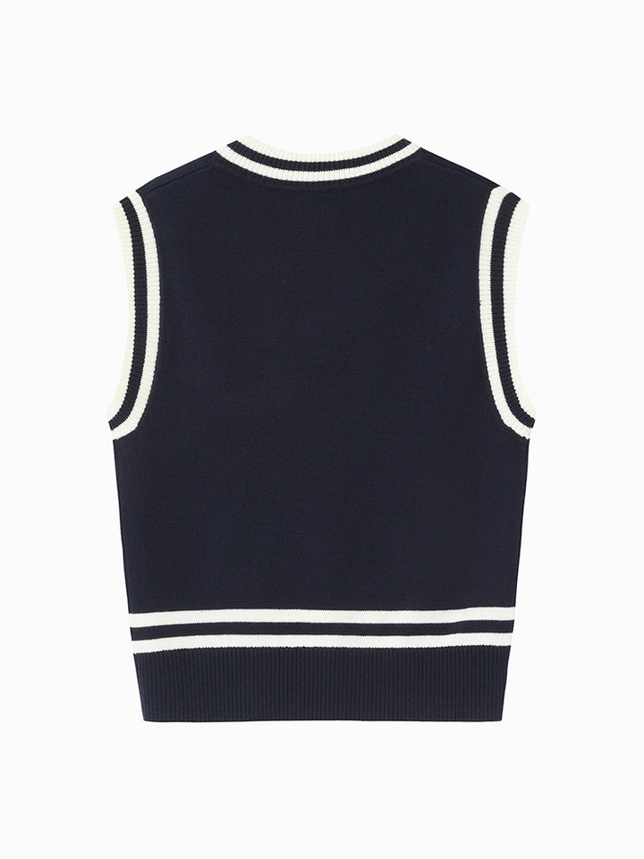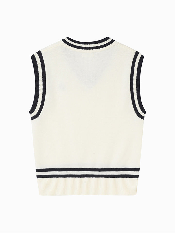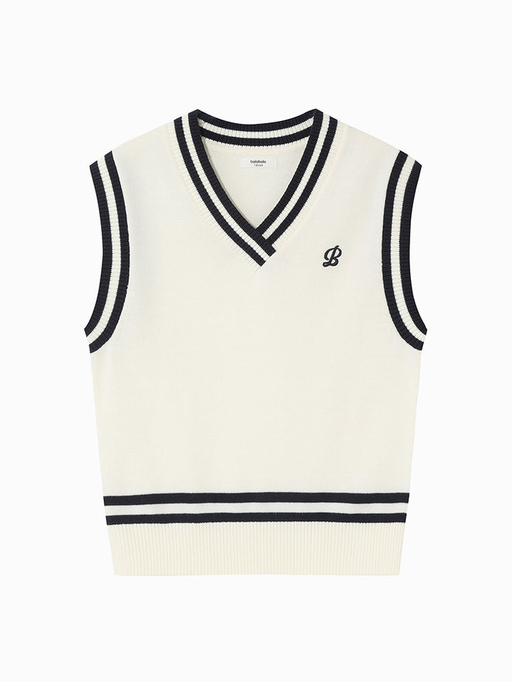 sleeveless boy sweater in a knitted fabric, decorated with embroidery on the front side and contrast colored lining details comes with a V shape neckline