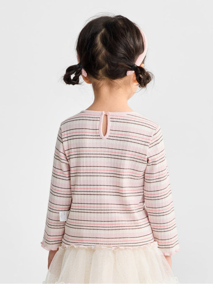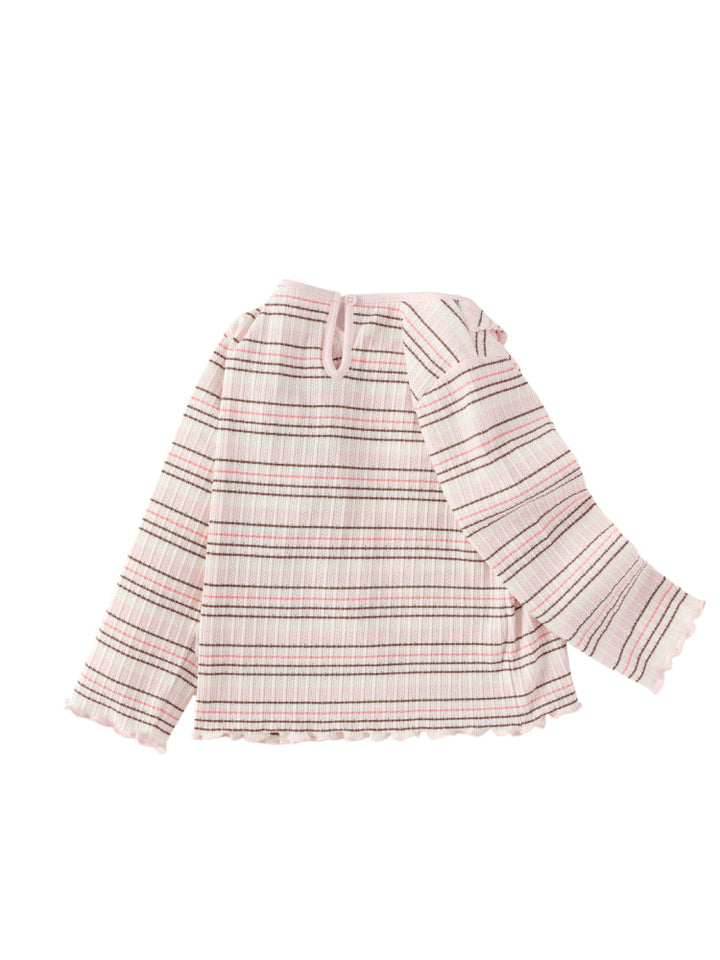 A ribbed long sleeve top with a playful striped pattern, finished with a scalloped hem and collar detail. Featuring a small embroidered accent at the chest, it adds a fun touch while ensuring everyday comfort.