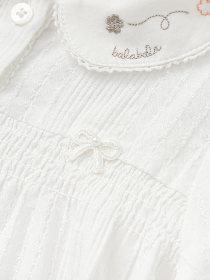 Elegant white shirt with a Peter Pan collar delicately embroidered with floral motifs, front shirring, and elasticated cuffs for a graceful finish.