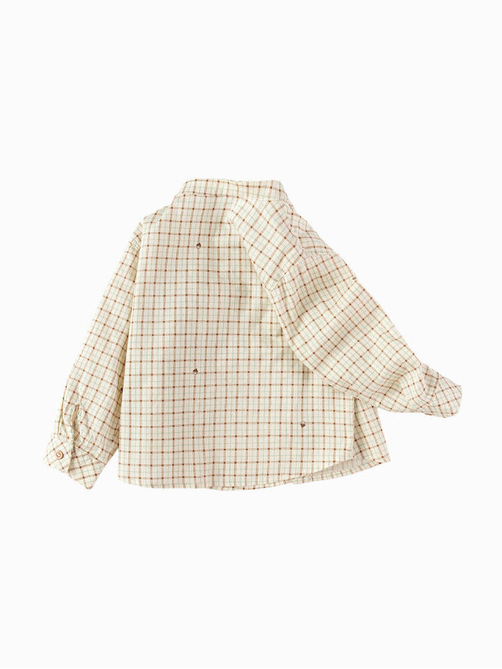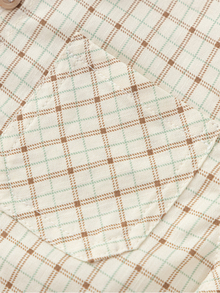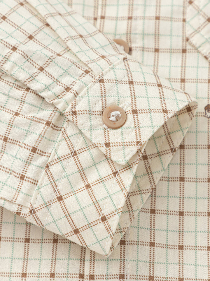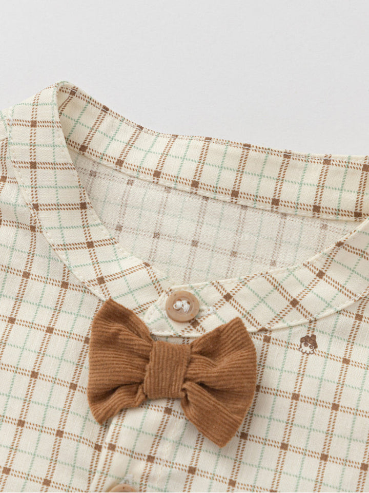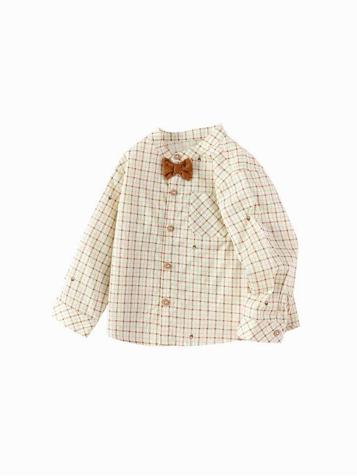Earth-toned checked shirt with a classic collar, long sleeves, and a matching bow tie , a stylish choice for dressed-up occasions.