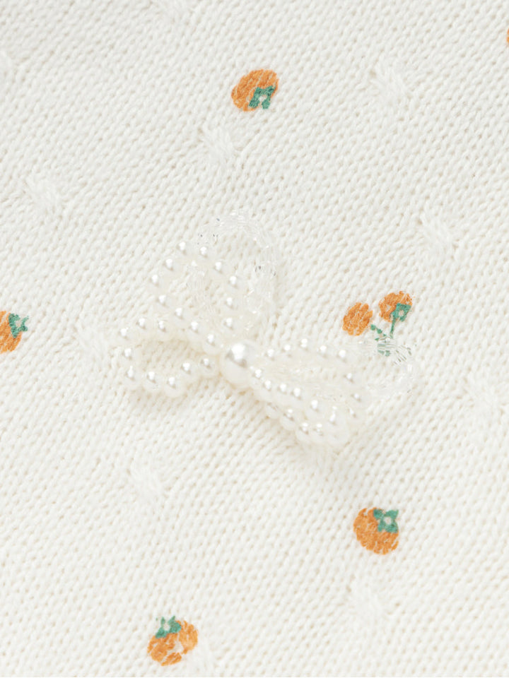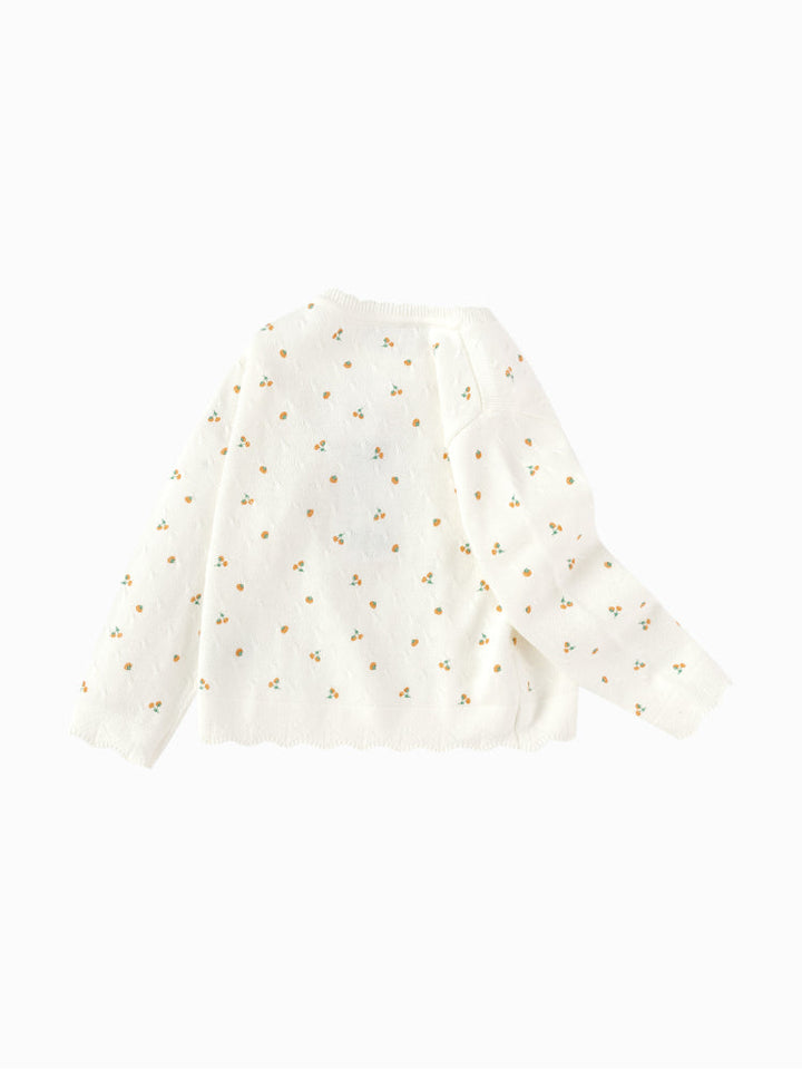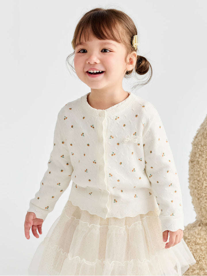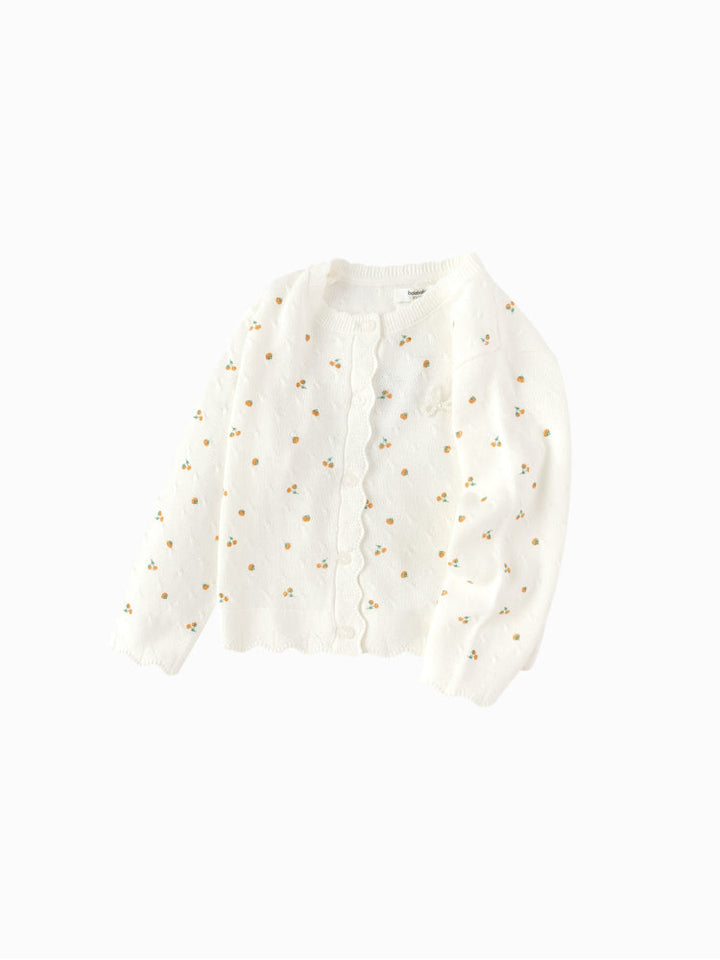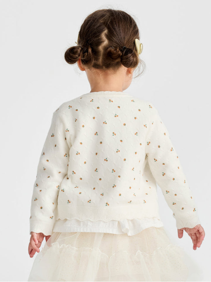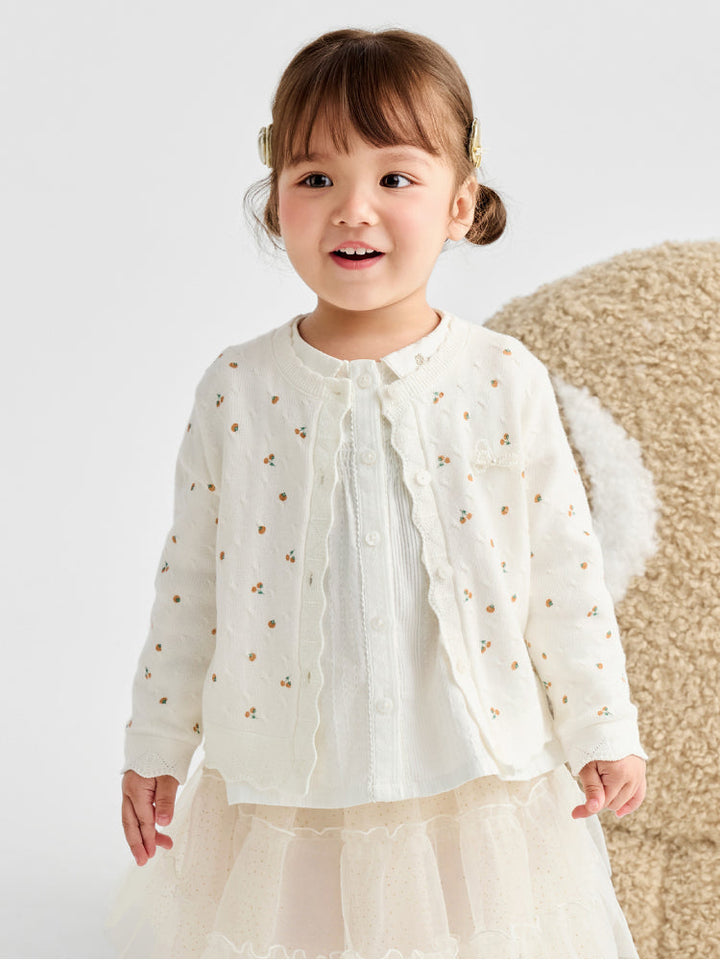 Soft knitted cardigan designed with a comfortable fit and front button closure. Features delicate textured details that add a touch of charm, making it an easy layering piece for different looks.