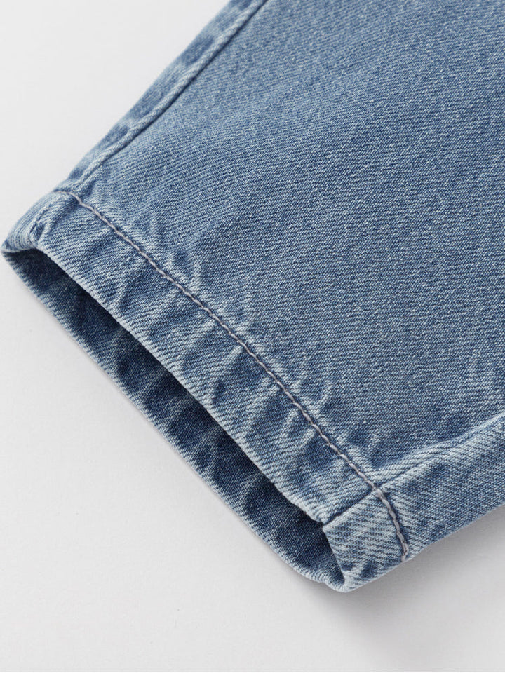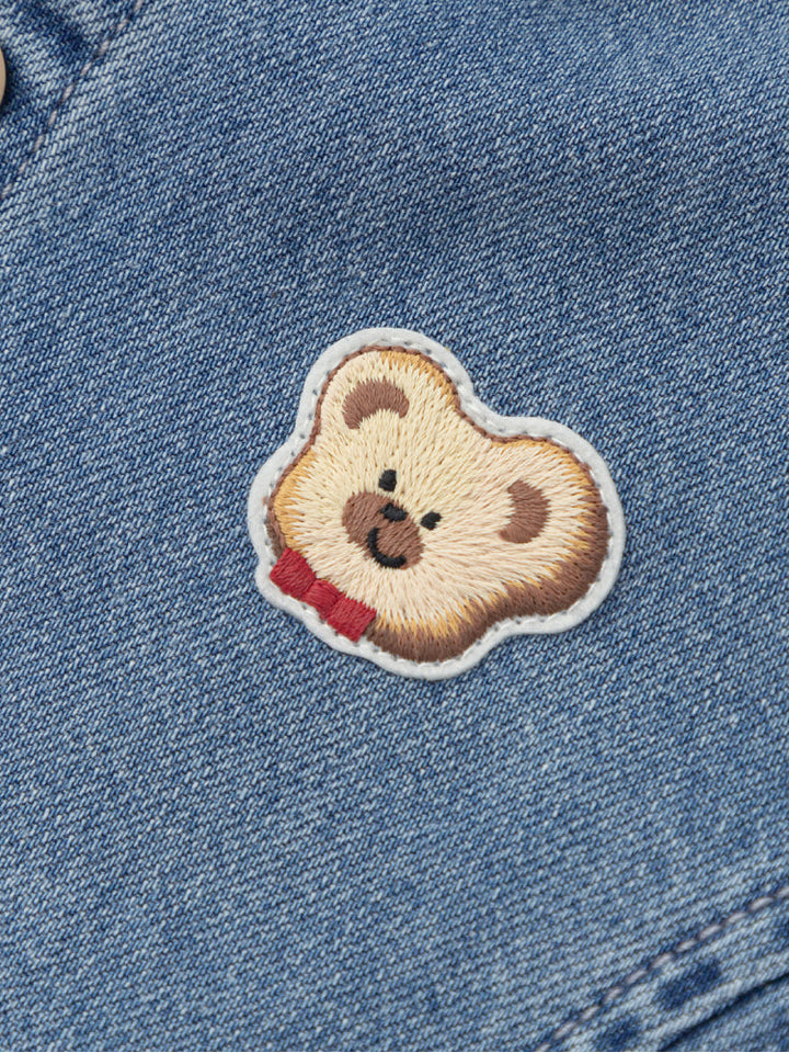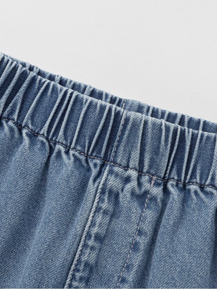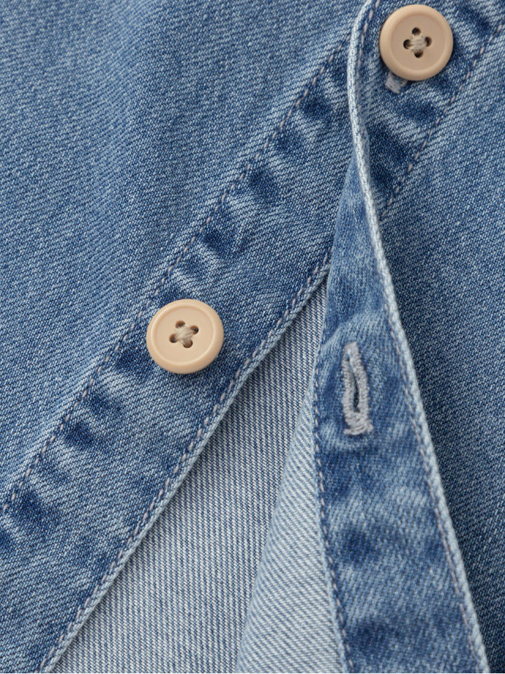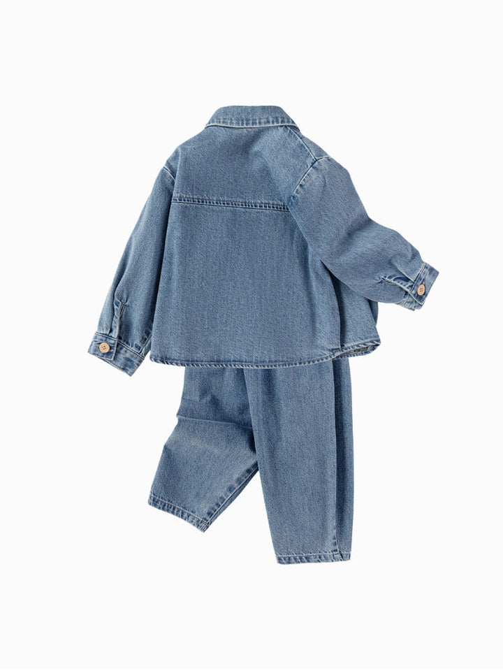 A casual denim set featuring a button-up shirt with a small decorative front detail, paired with matching relaxed-fit denim pants for a coordinated laid-back style.