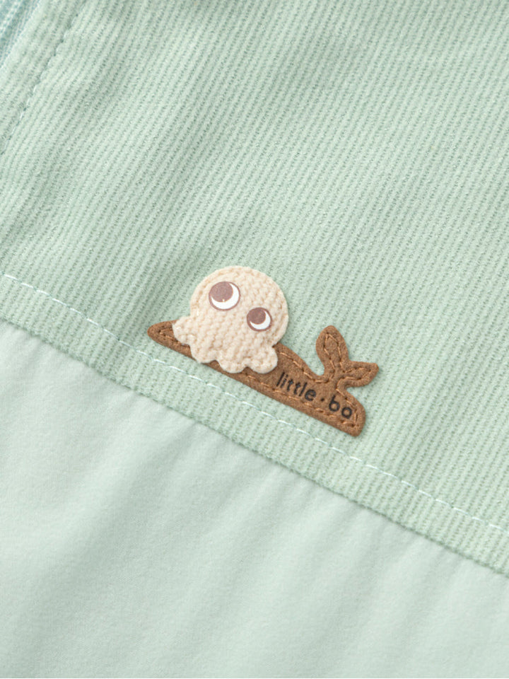 Light solid-colored jacket with a front zip, large patch pockets, and a corduroy yoke for subtle texture contrast.