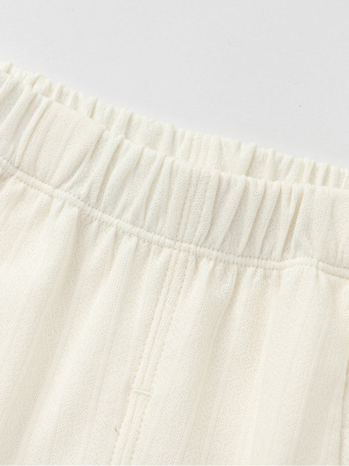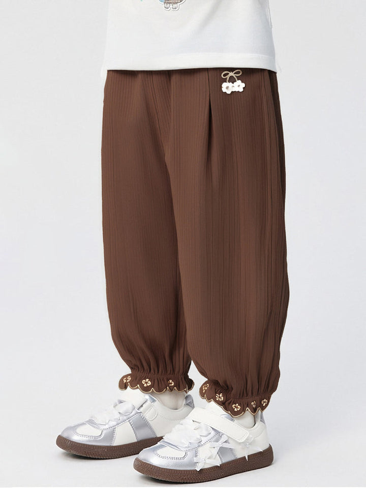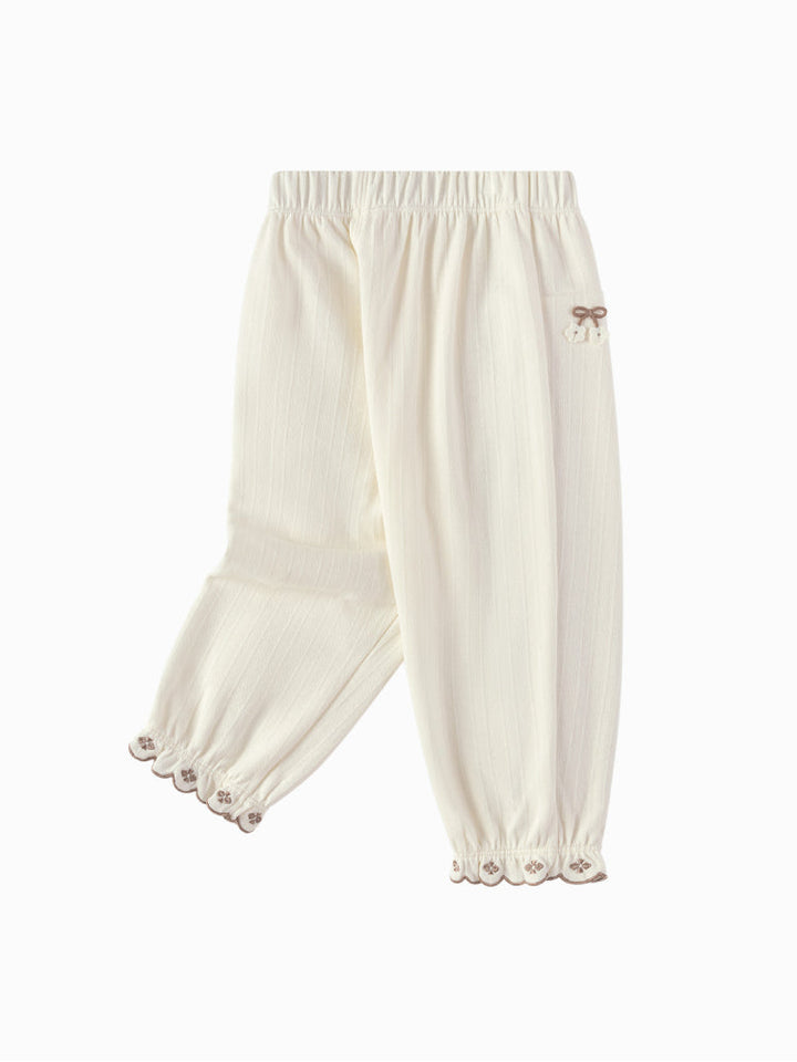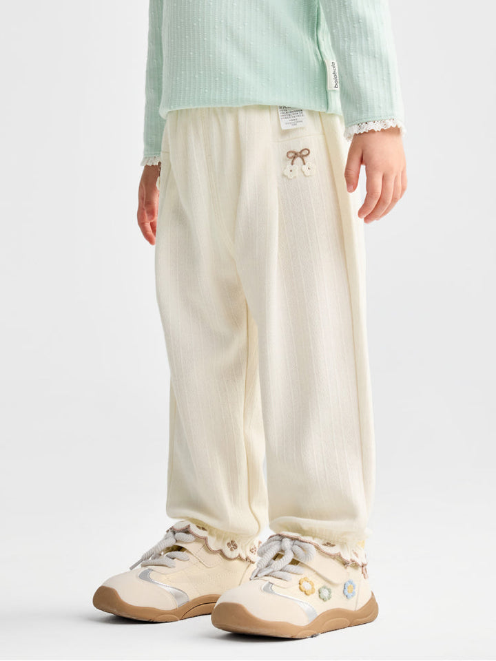 Lightweight textured pants with an elastic waistband and delicate lace-trimmed hems, finished with bow accents for a refined, graceful touch.