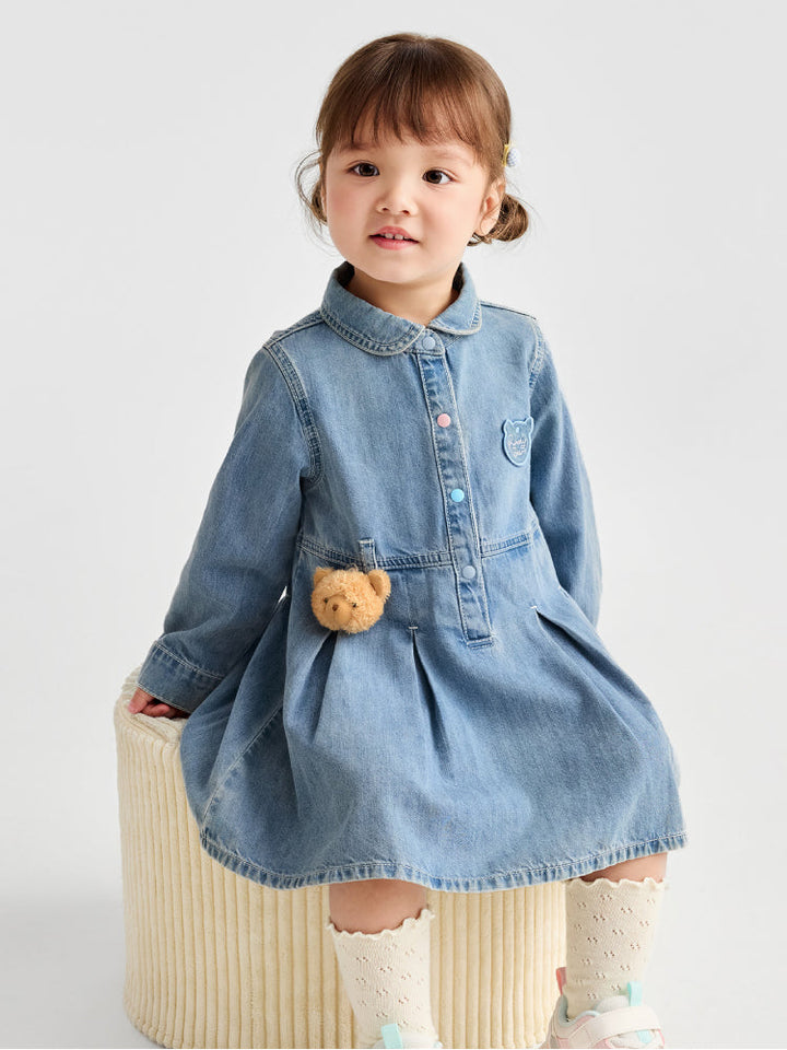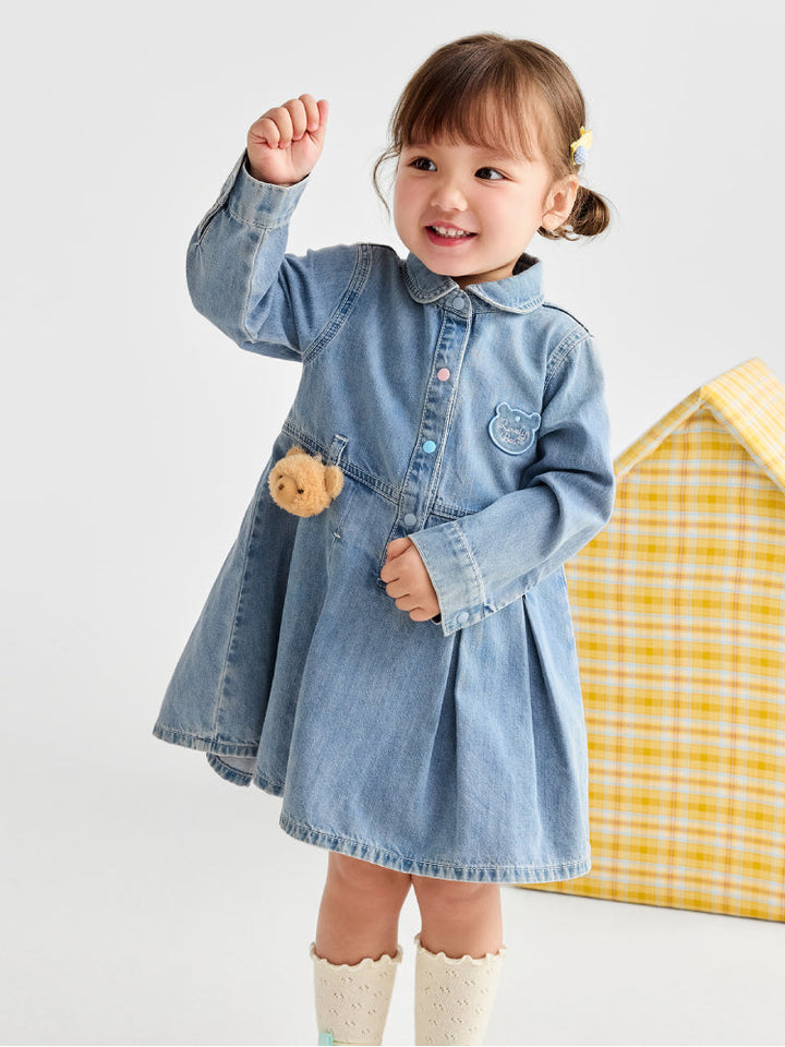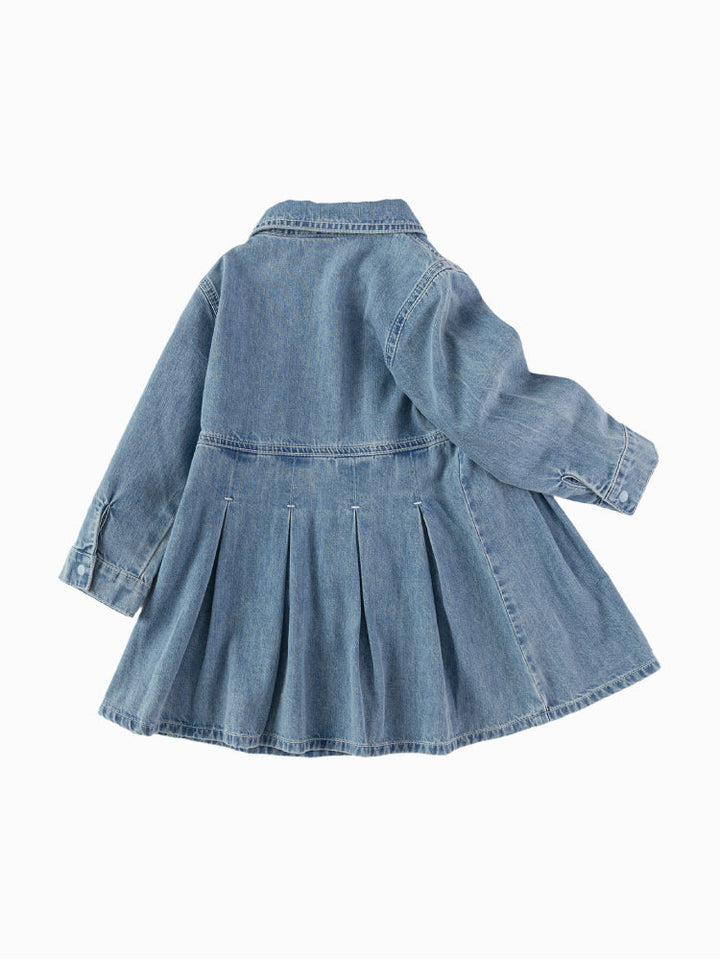 A denim shirt dress with a rounded collar, pleated skirt, and a subtle print for a stylish touch.