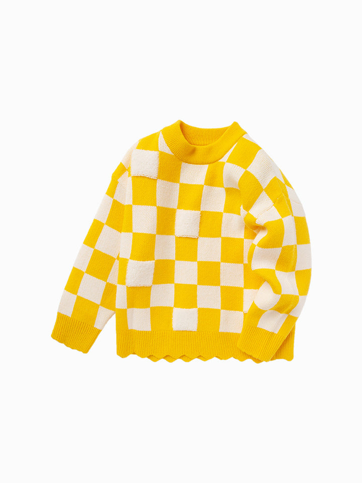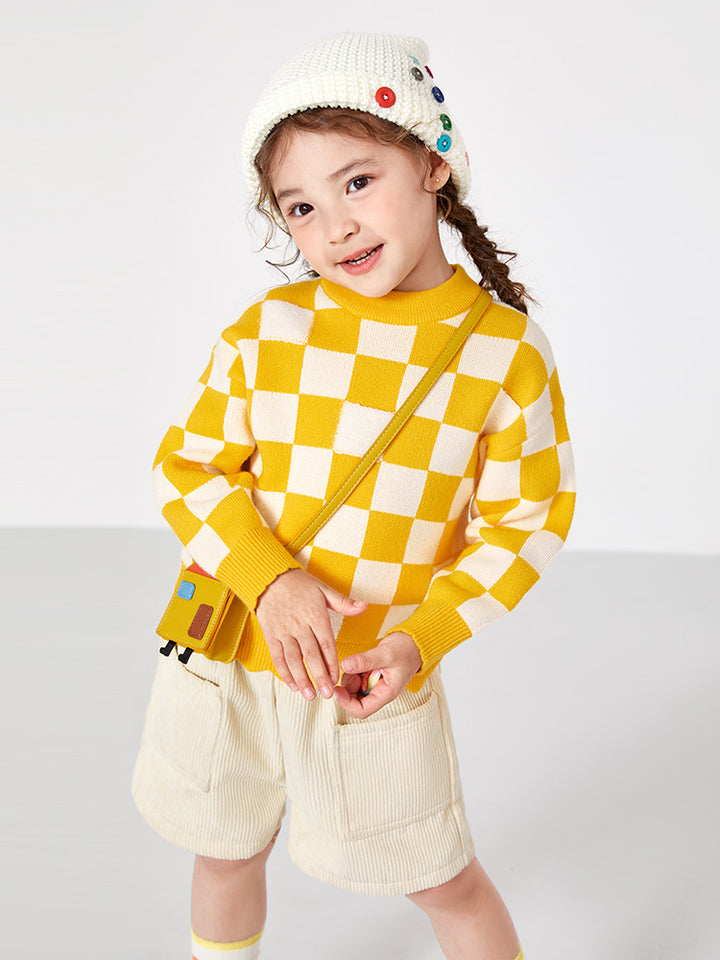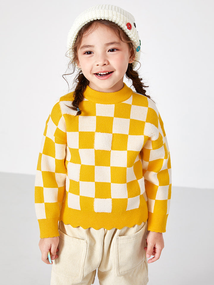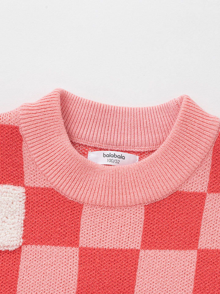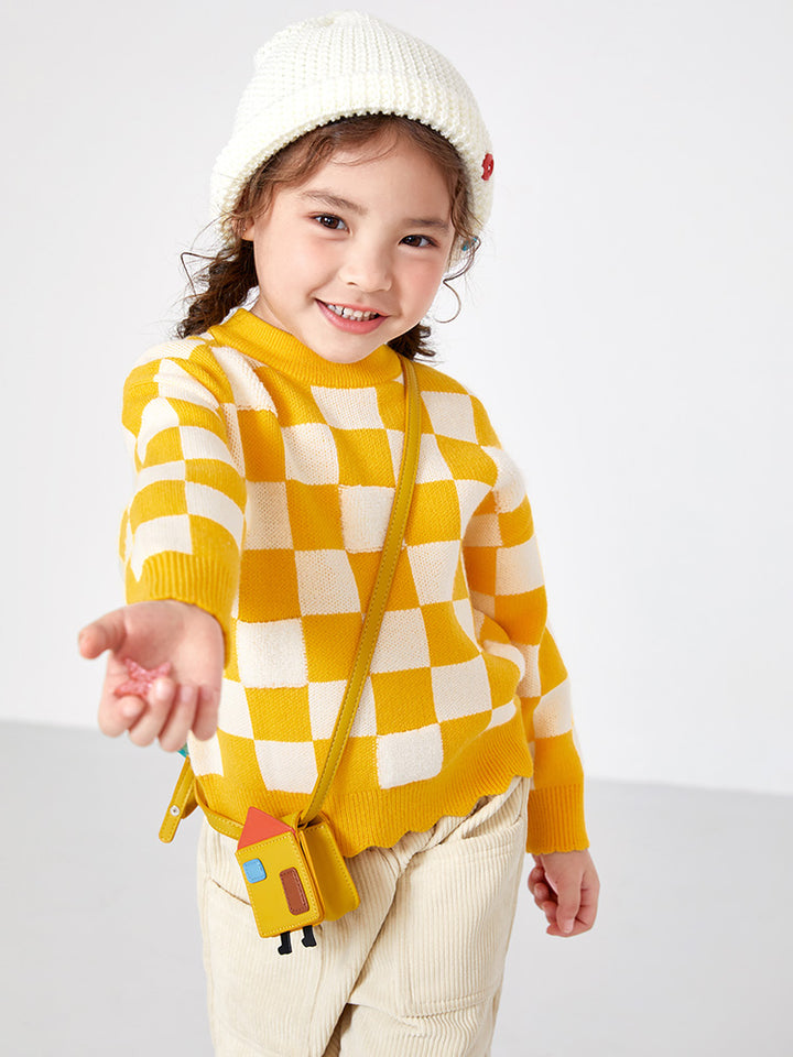 long sleeves girl sweater, in a knitted fabric material, decorated with a printed pattern on full design, comes with a rounded shape neckline