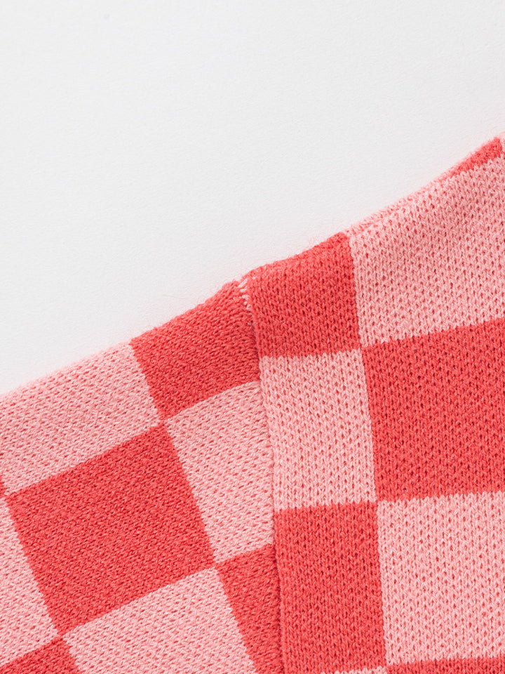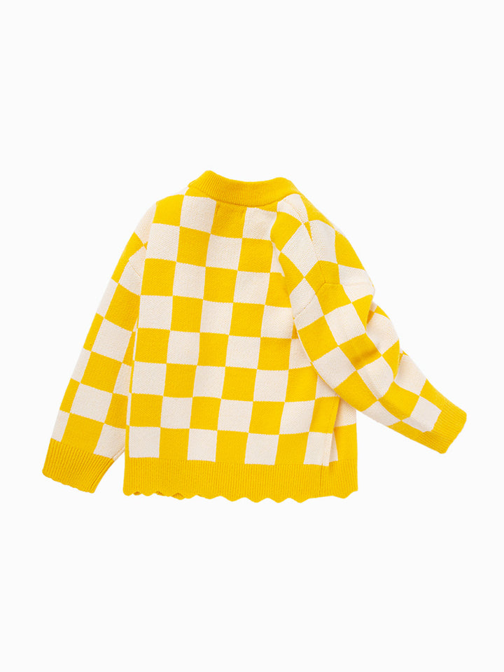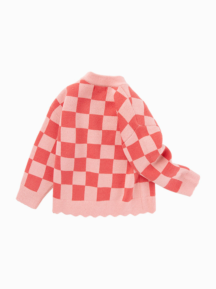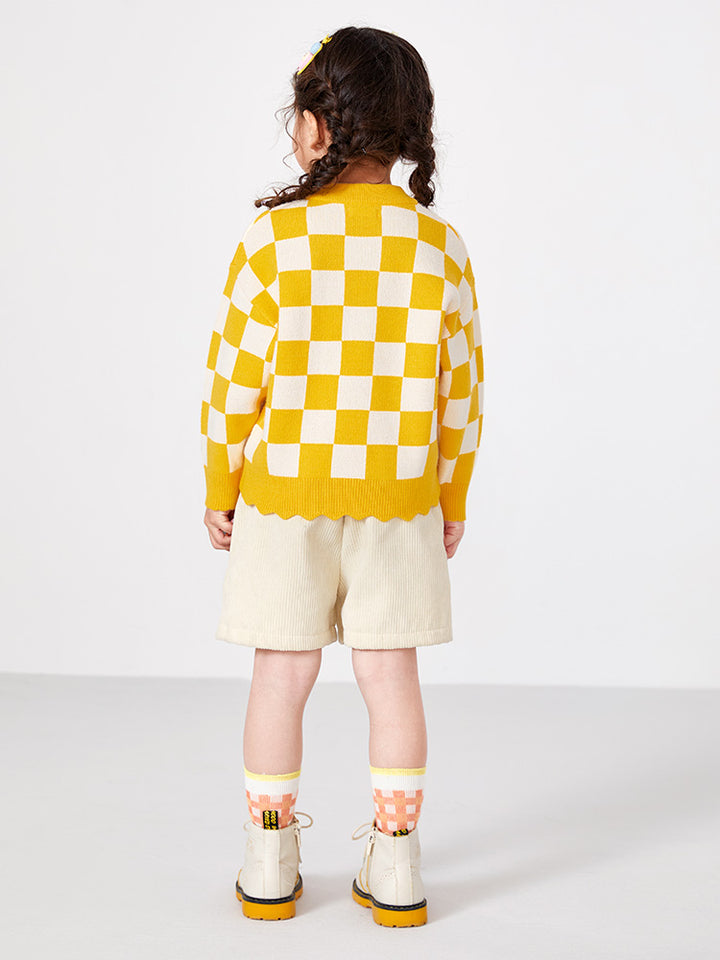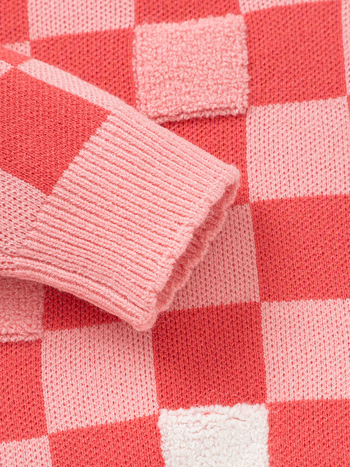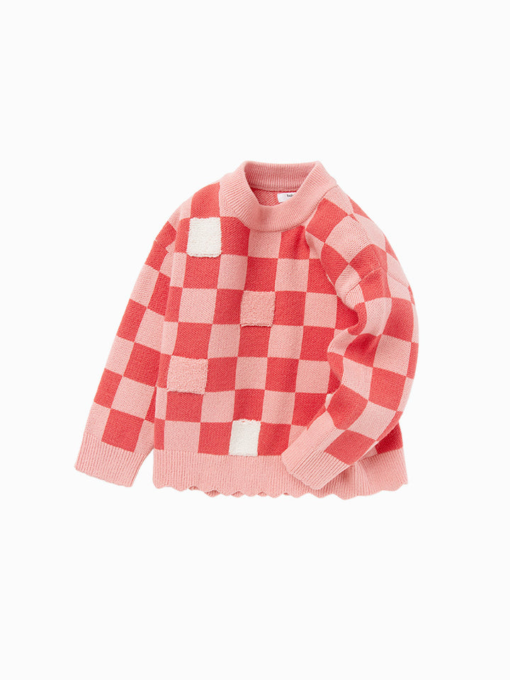long sleeves girl sweater, in a knitted fabric material, decorated with a printed pattern on full design, comes with a rounded shape neckline