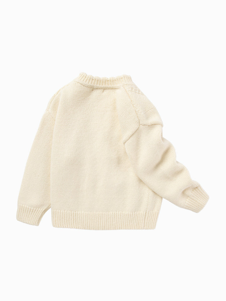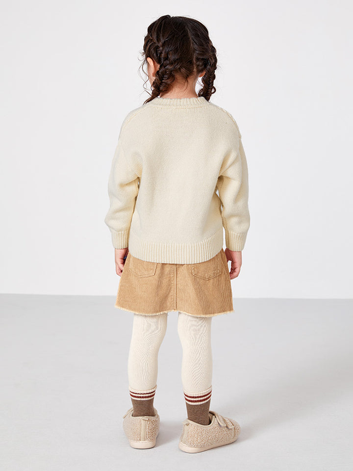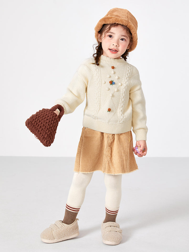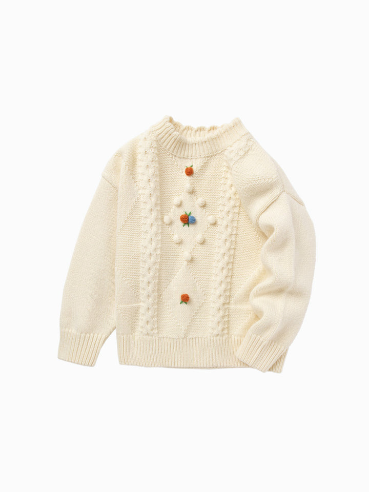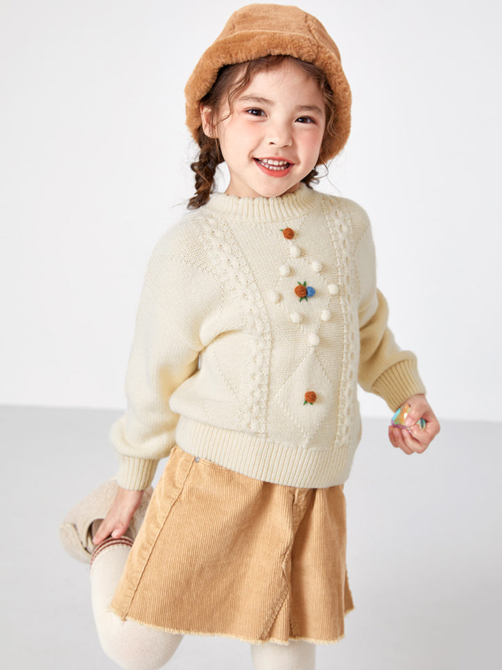 long sleeves girl sweater, in a knitted fabric material, decorated with a textured pattern fabric and pom poms details, comes with a rounded shape neckline