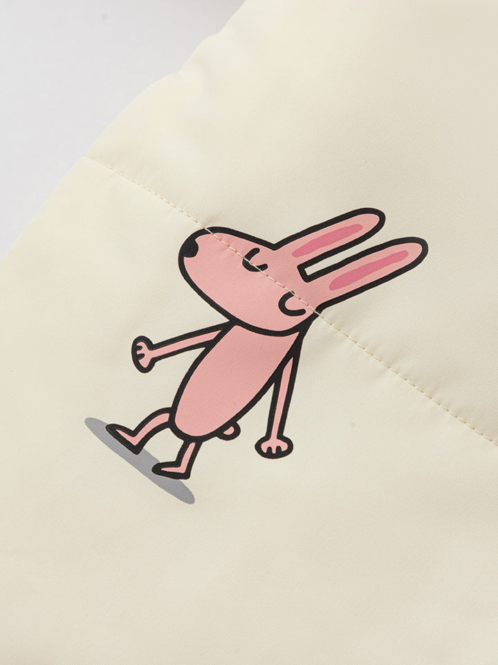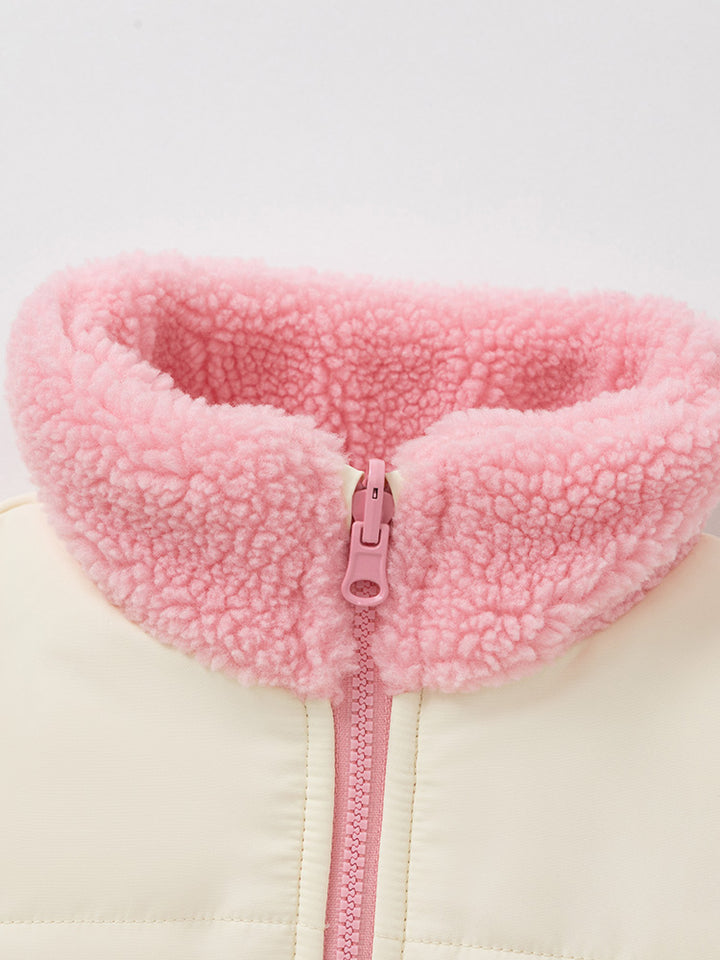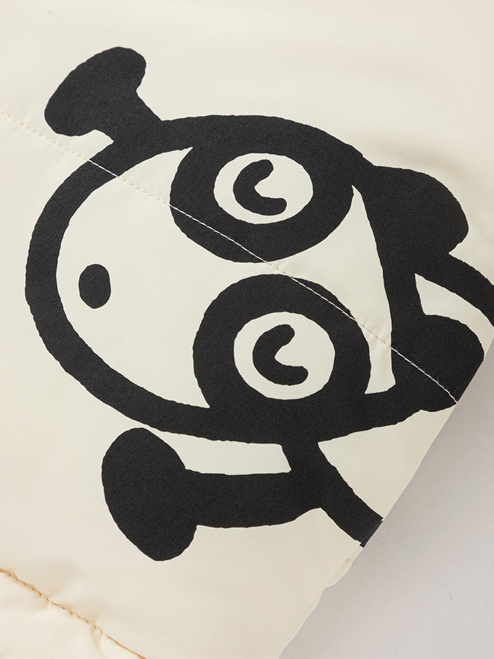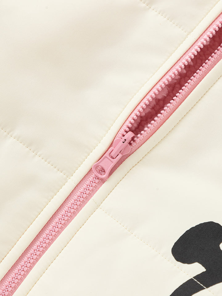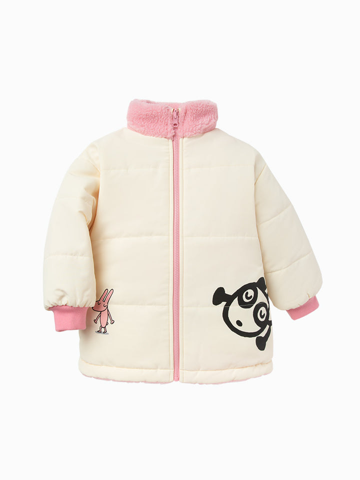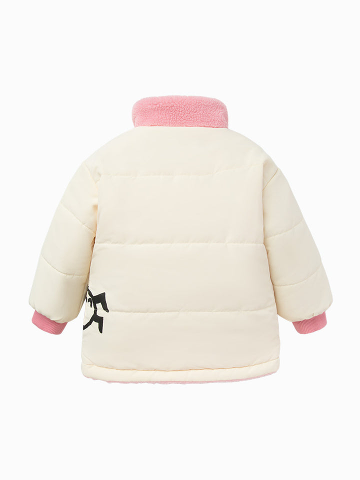 long sleeves girl puffer jacket with a warm fabric for winter outings, decorated with prints on the front side, comes with zipper for closure on the front side and with a high collar