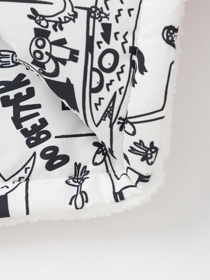 long sleeves casual boy jacket of double face style design, one face is decorated with a printed pattern on full design and the other of sherpa fleece fabric decorated with a small patch on the front side, comes with front pockets, zipper for closure on the front side and a high collar