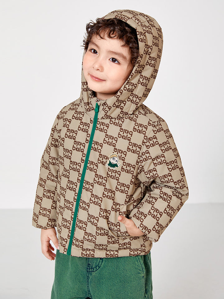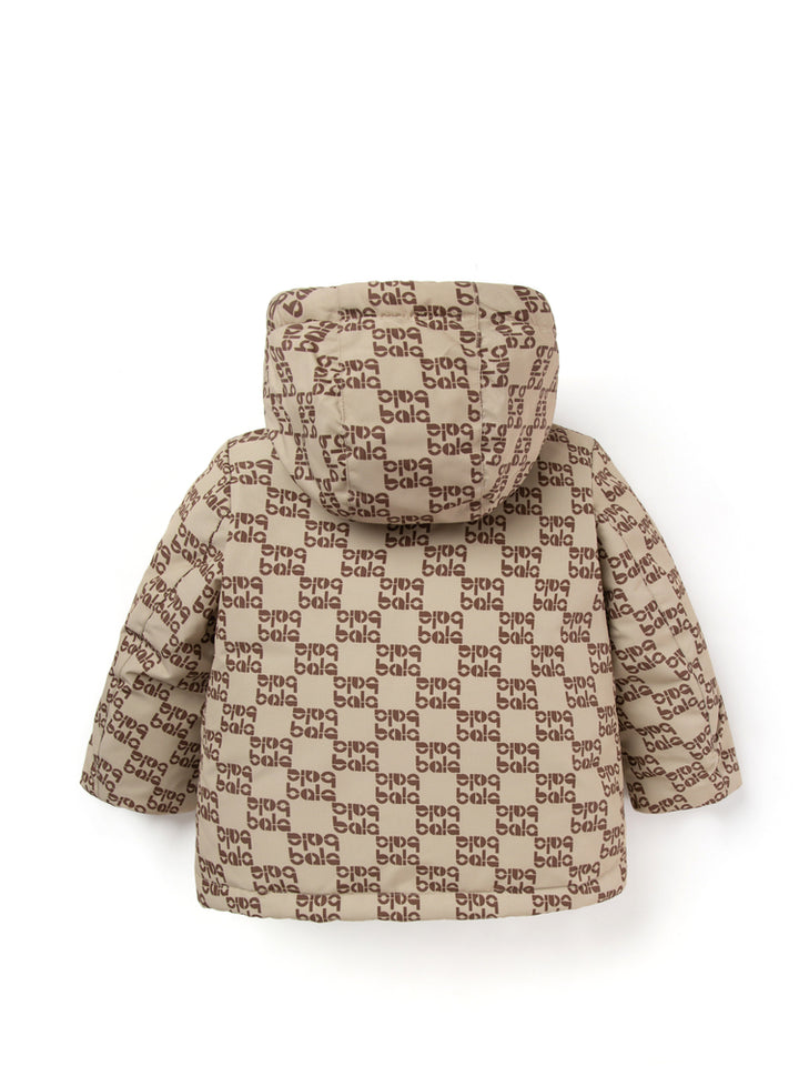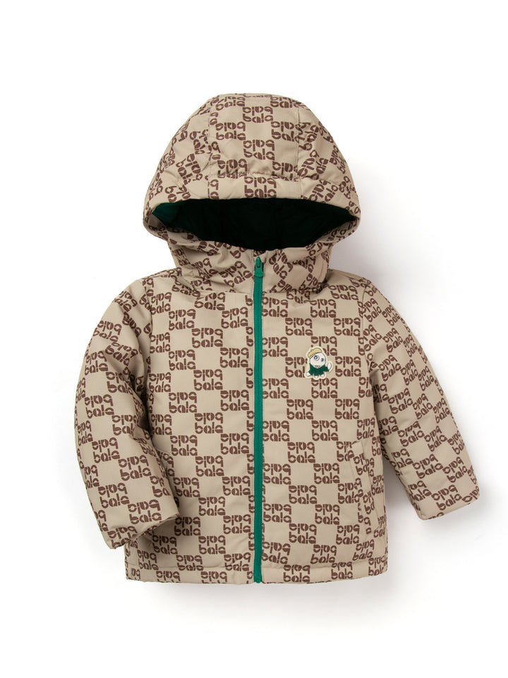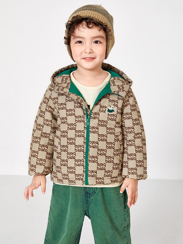 long sleeves boy puffer jacket with a warm fabric for winter outings, decorated with a printed pattern on full design, comes with pockets on the front side, zipper for closure on the front side and with an attached hoodie collar