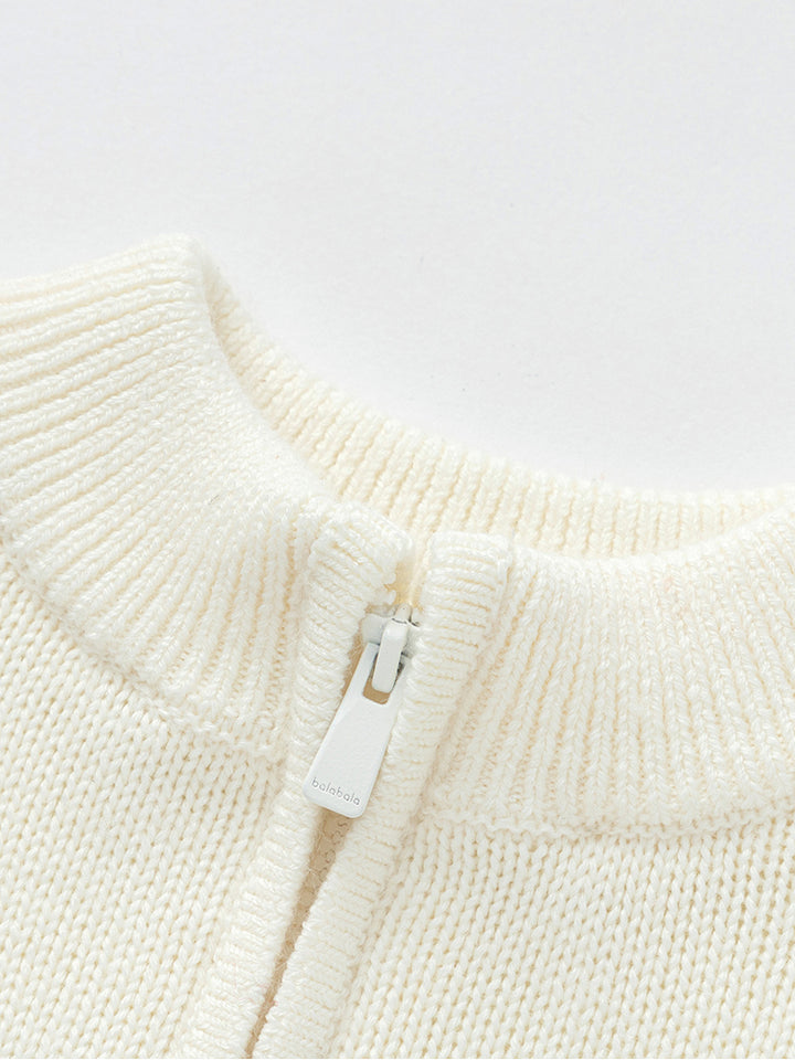 long sleeves knitted pullover, decorated with colored lining details, comes with front zipper and a rounded neckline