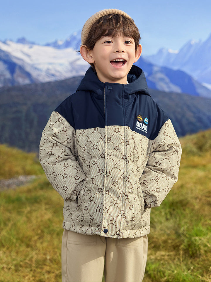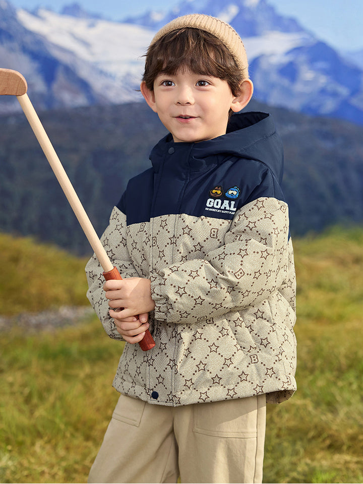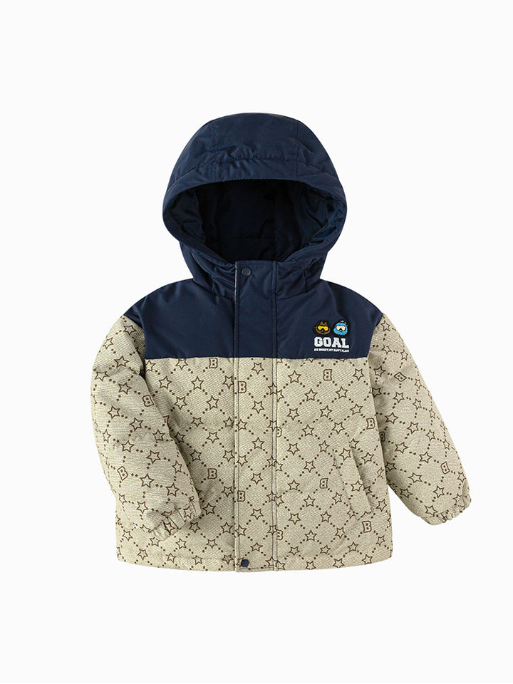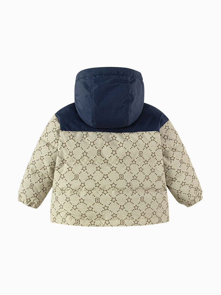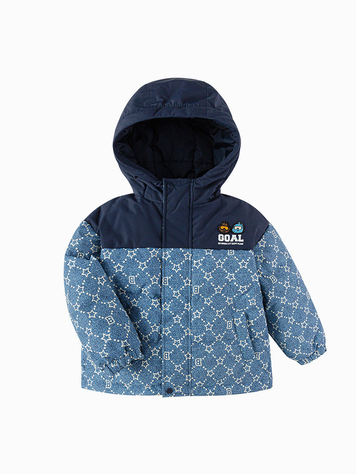 long sleeves winter coat, decorated with a printed pattern, comes with front zipper for closure, front pockets and an attached hoodie collar