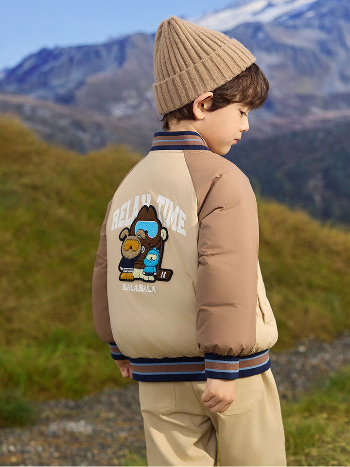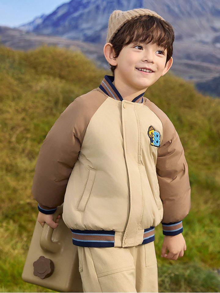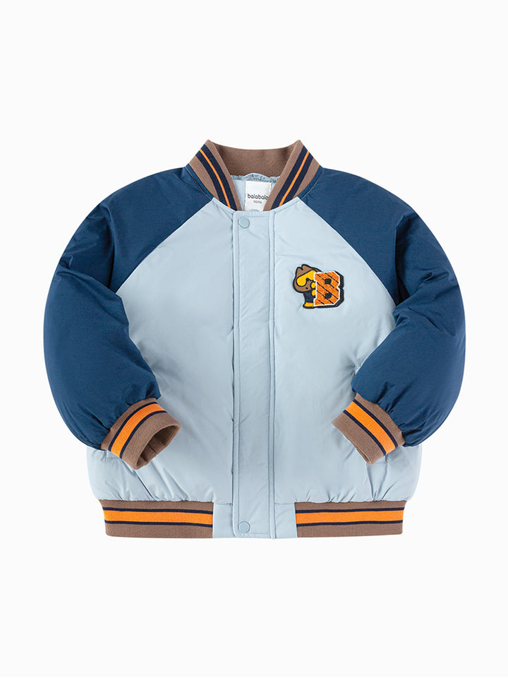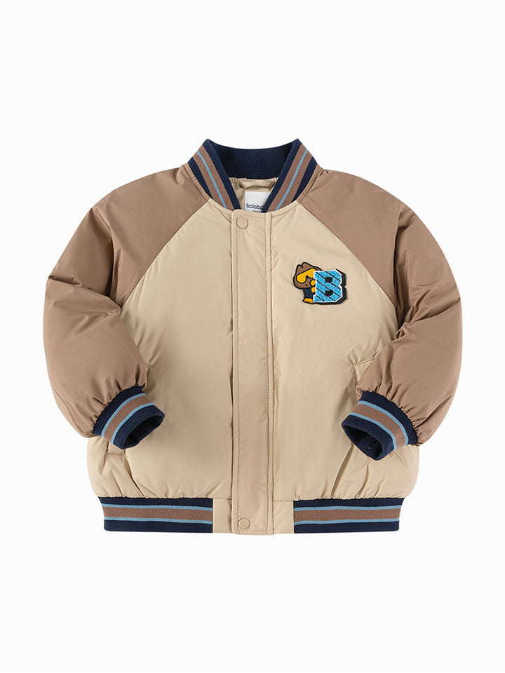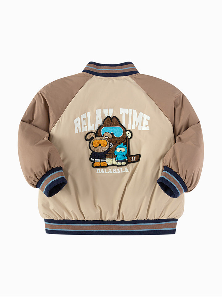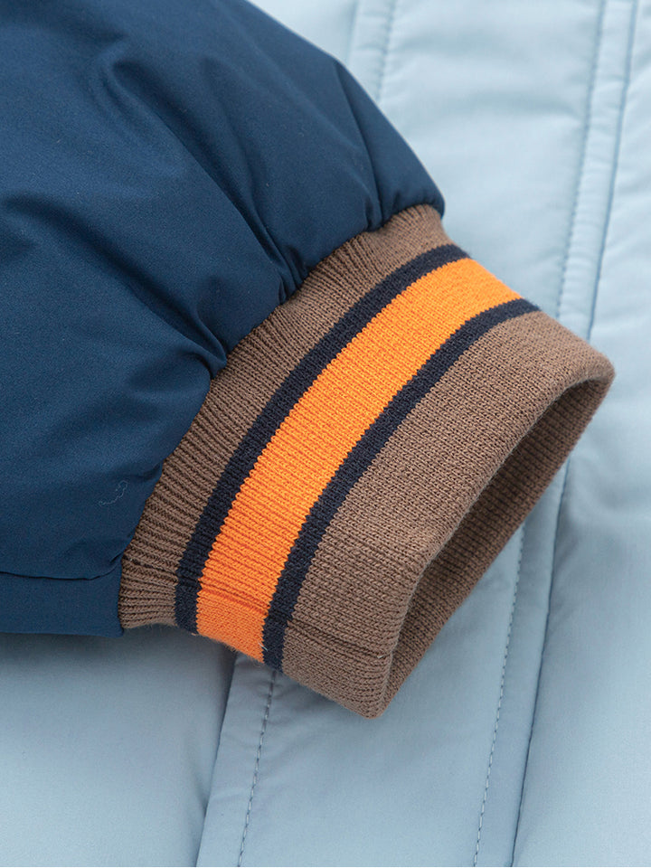 long sleeves winter coat, decorated with a contrast colored pattern and knitted prints on the front and back sides, comes with a front zipper for closure, front pockets