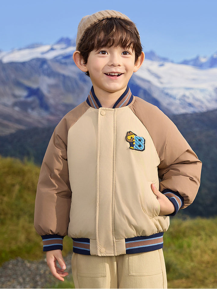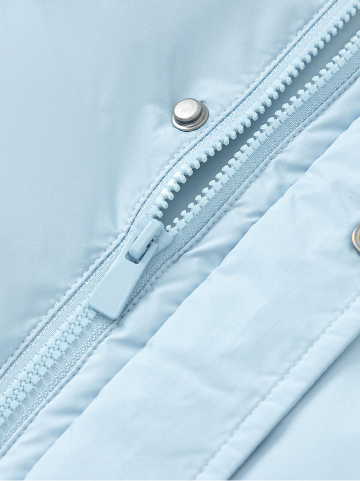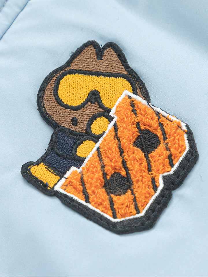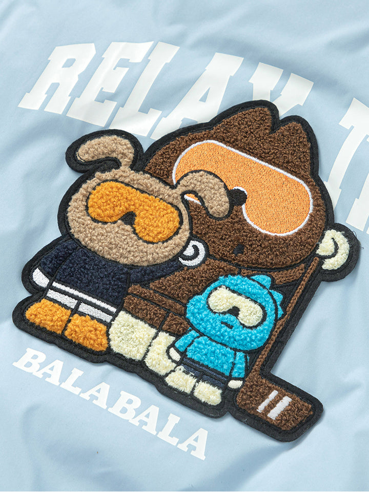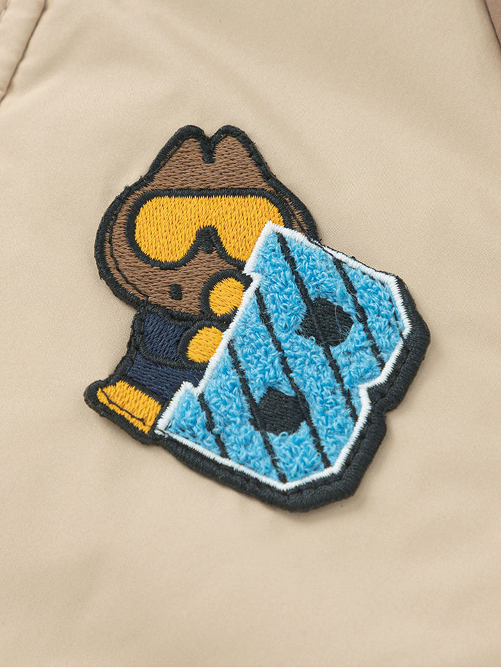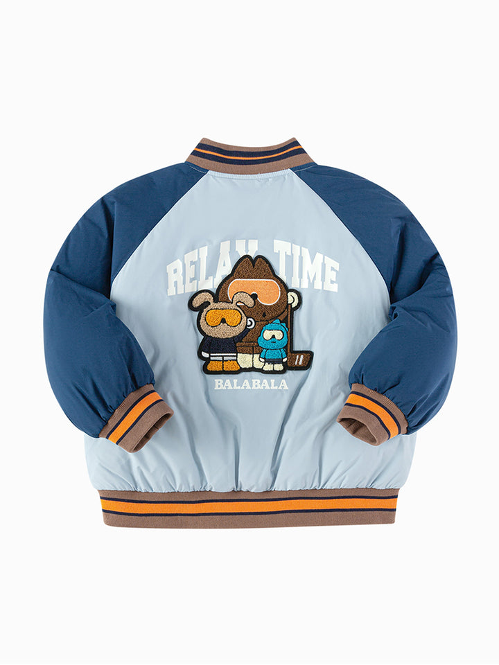 long sleeves winter coat, decorated with a contrast colored pattern and knitted prints on the front and back sides, comes with a front zipper for closure, front pockets