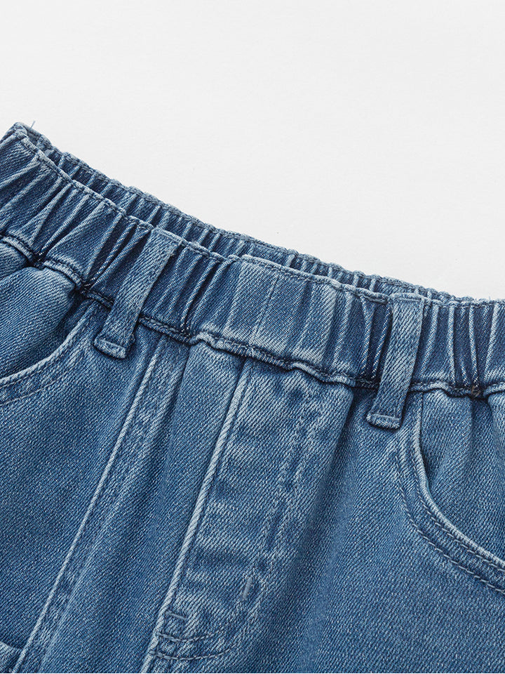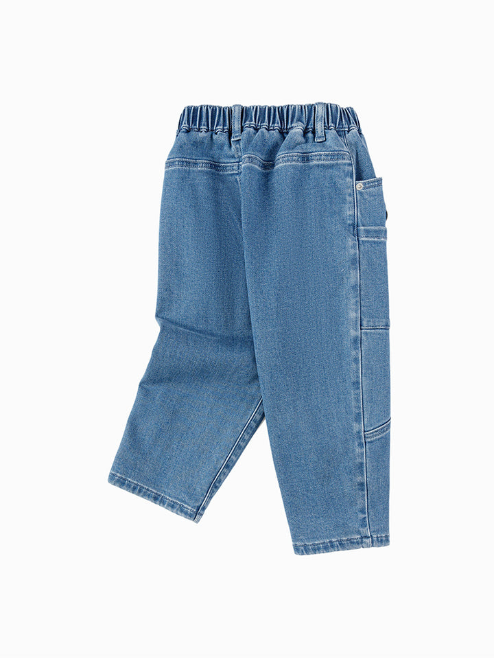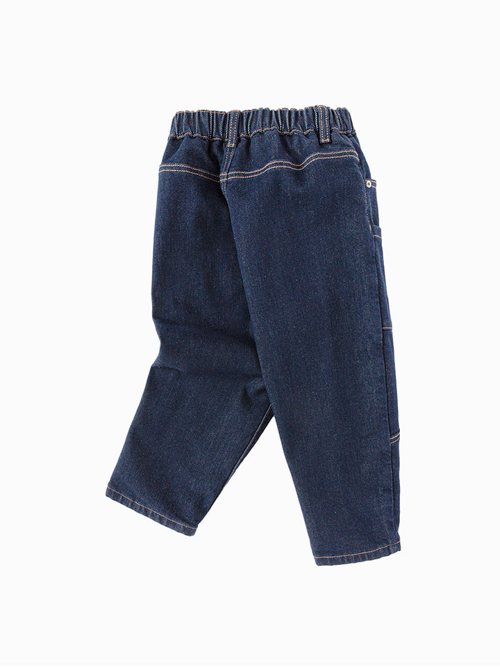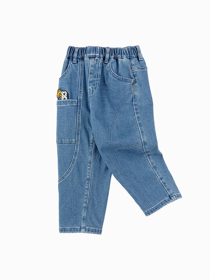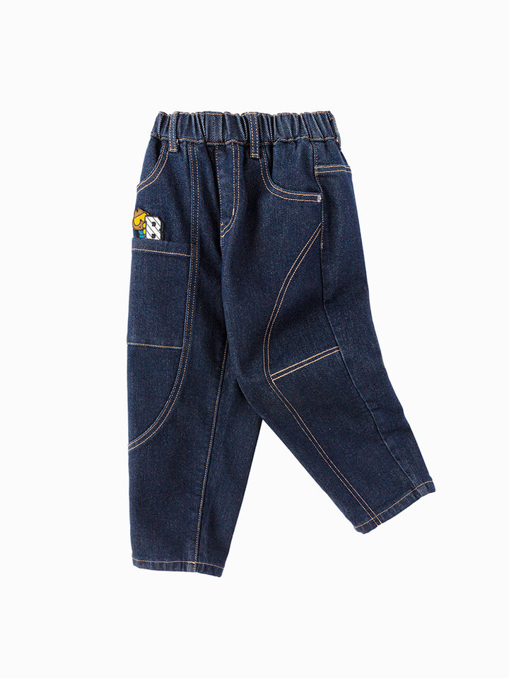 casual denim pants decorated with a small patch on the front side, comes with front pockets and a comfy elasticated waistband
