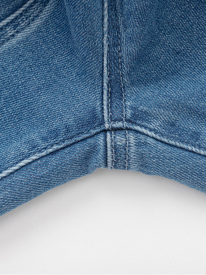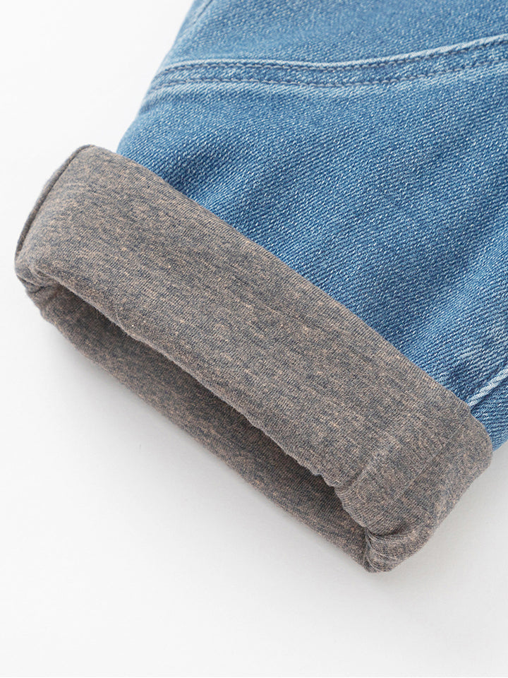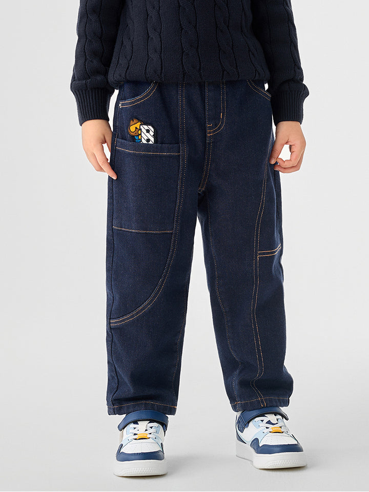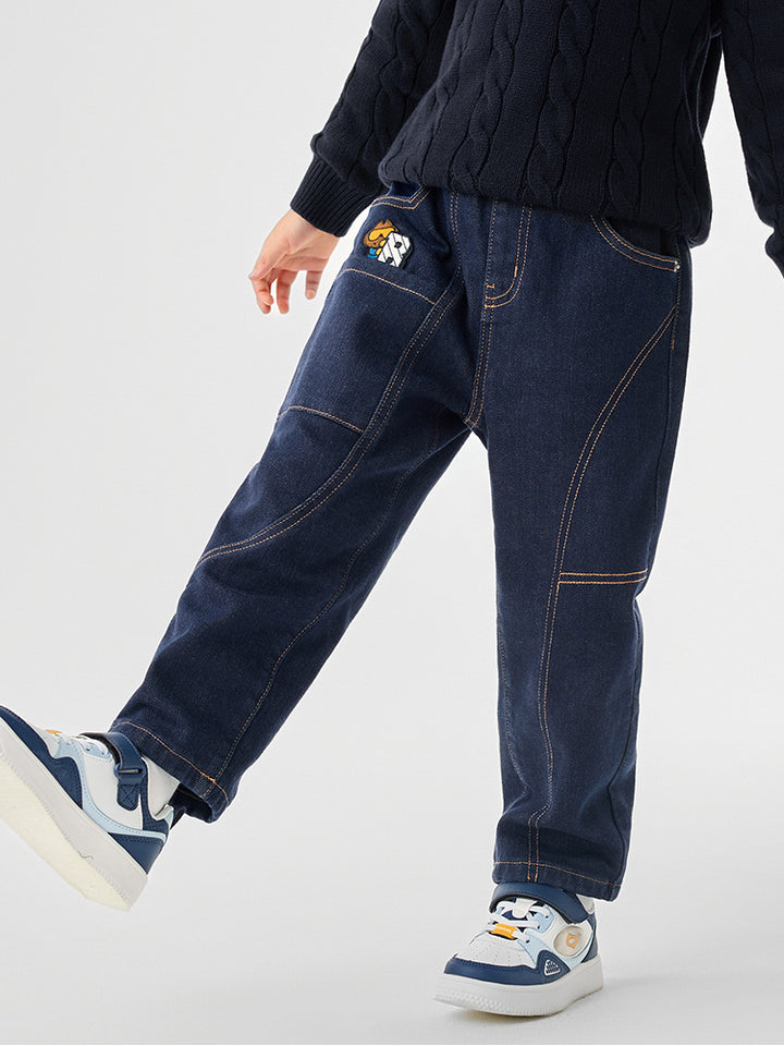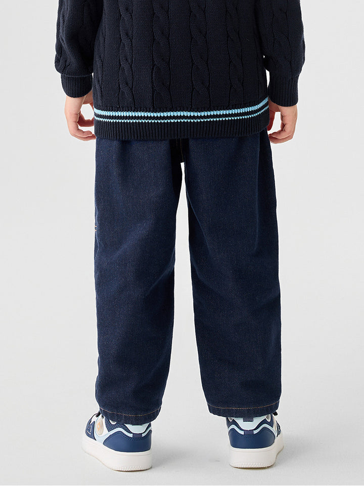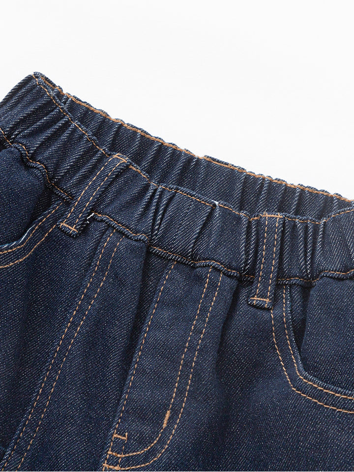 casual denim pants decorated with a small patch on the front side, comes with front pockets and a comfy elasticated waistband