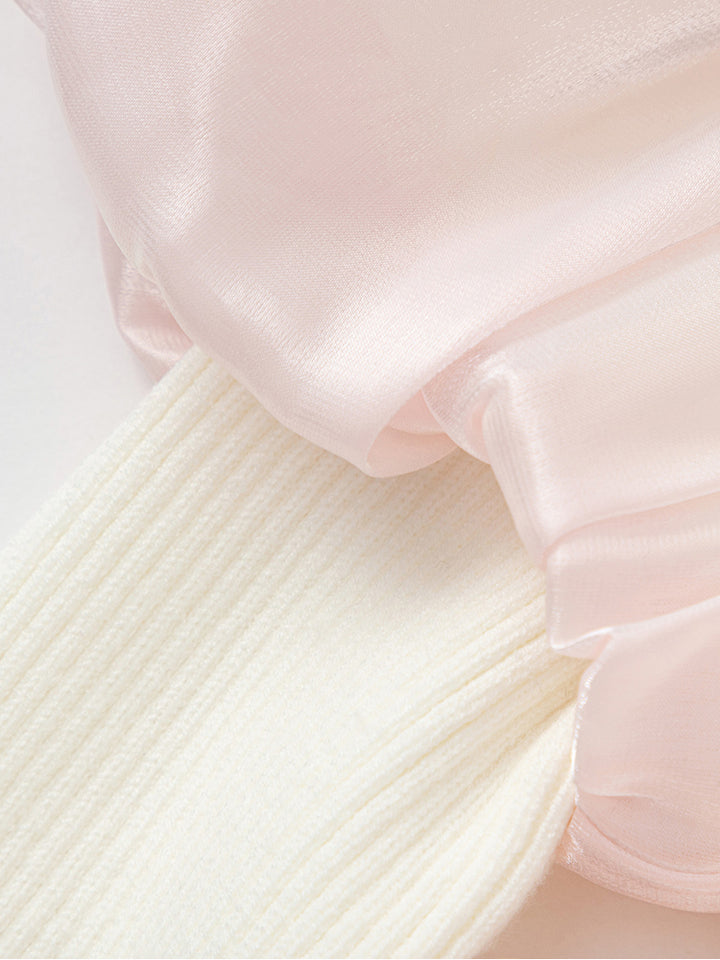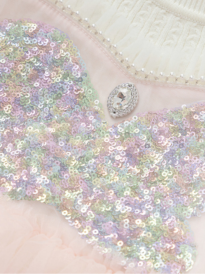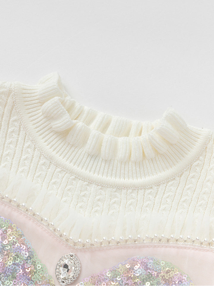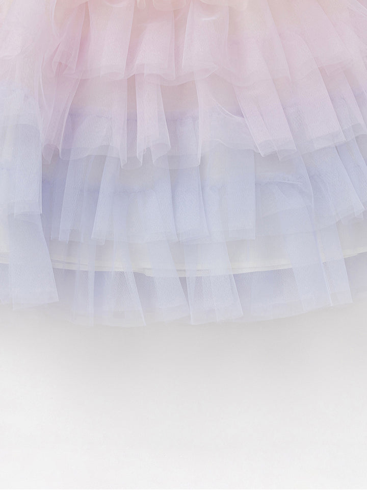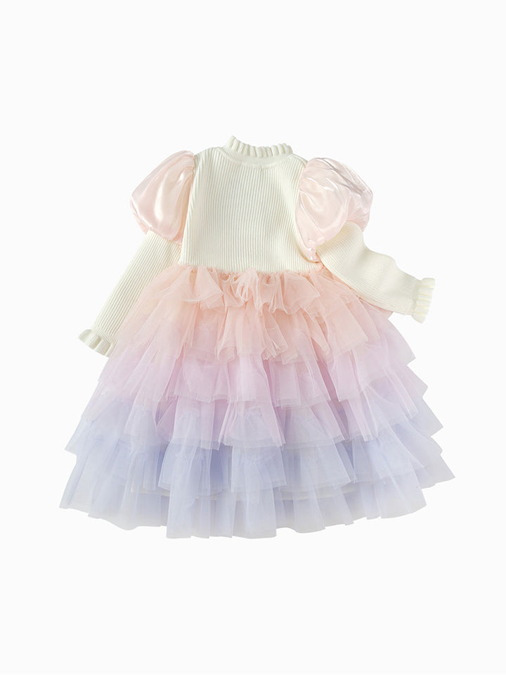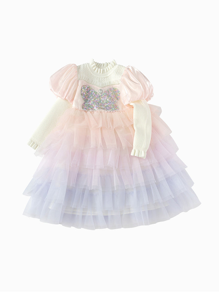 long sleeves layered dress in a gradient colored pattern, decorated with full layered ruffled pattern on lower side and knitted top and with sequinned details on the front side, comes with a rounded neckline