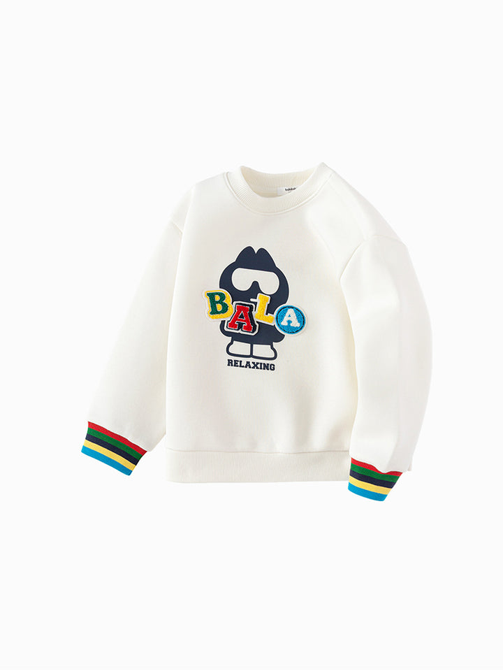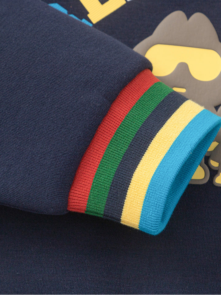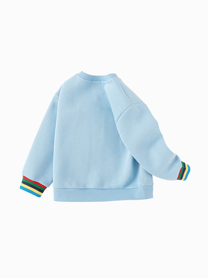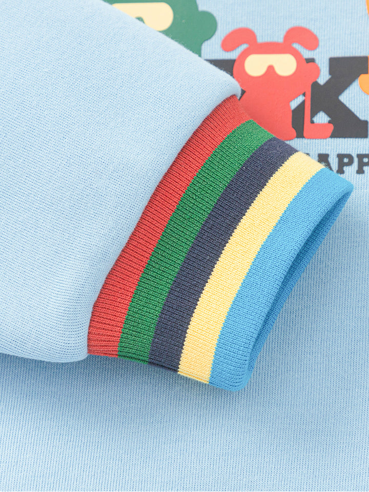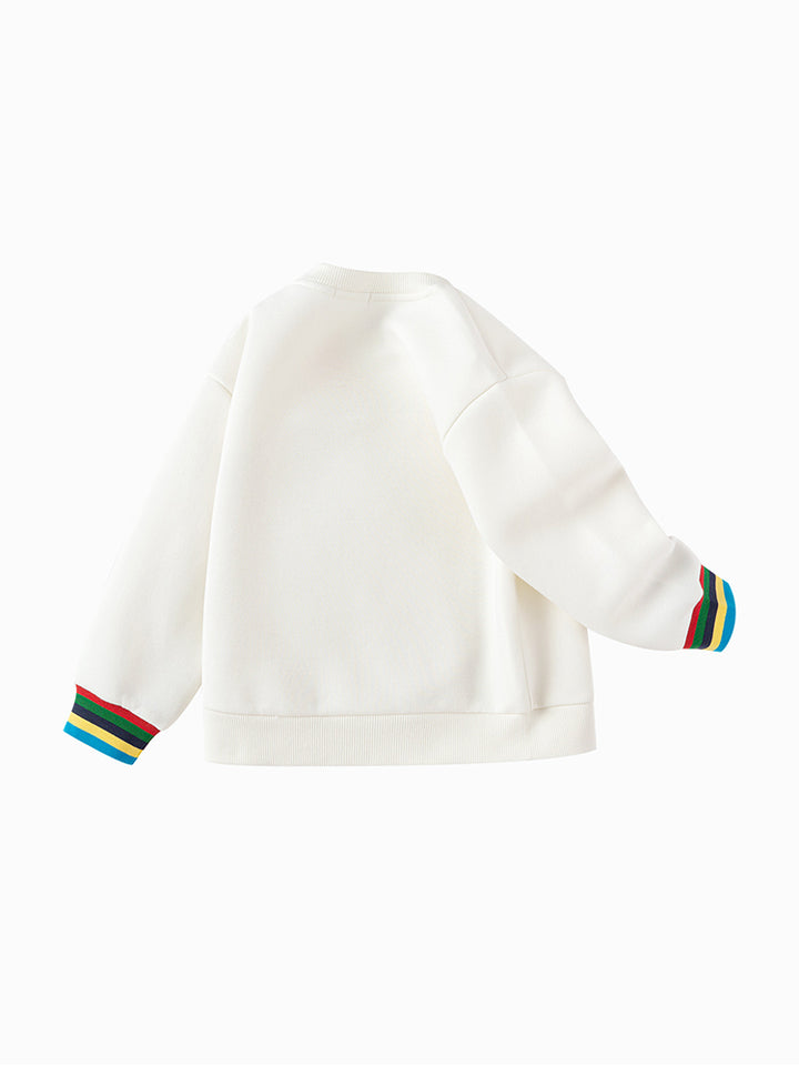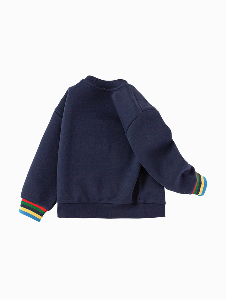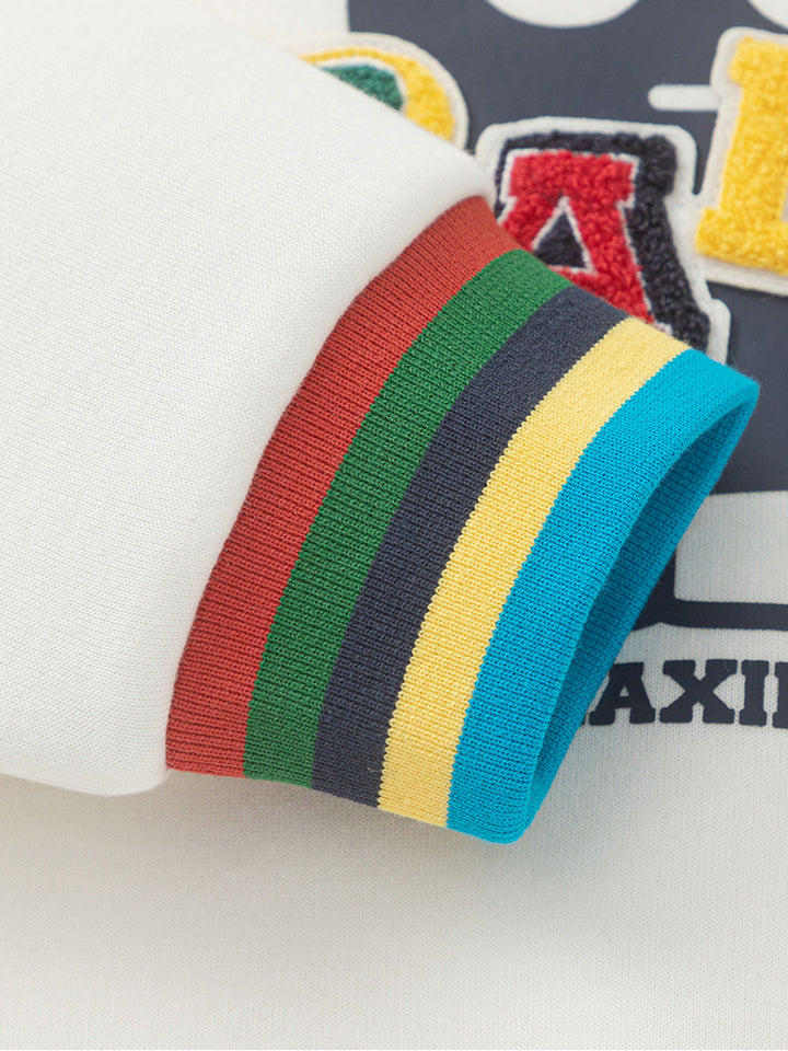 long sleeves sweatshirt, decorated with a knitted print on the front side and colored linings on sleeves, comes with a rounded shape neckline