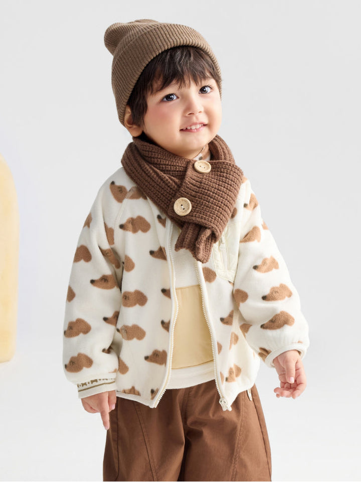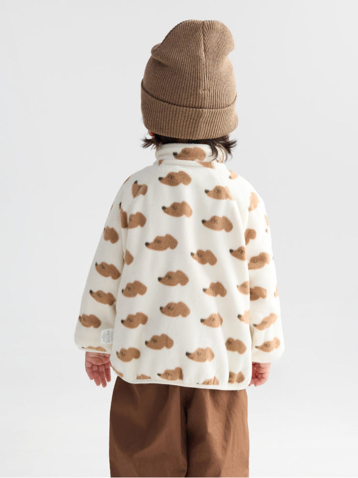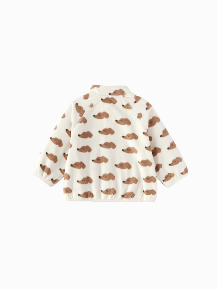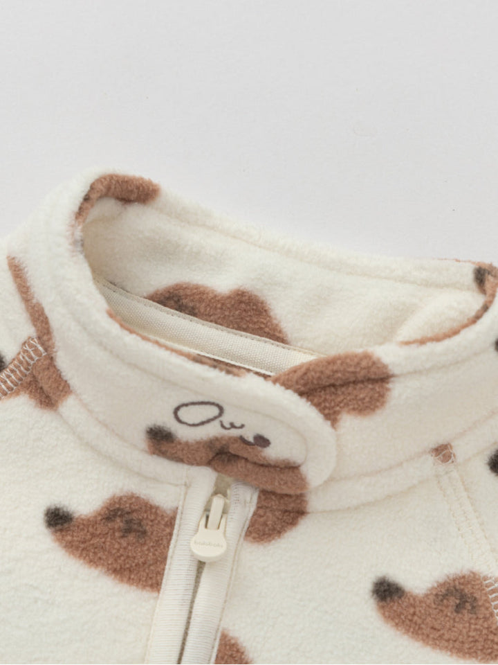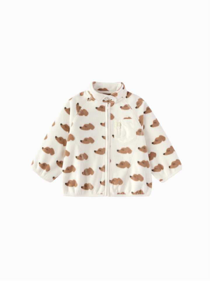 A soft fleece jacket designed with a front zipper and chest pocket for a practical touch. Long sleeves with elastic hems provide extra comfort and warmth, making it perfect for everyday wear.